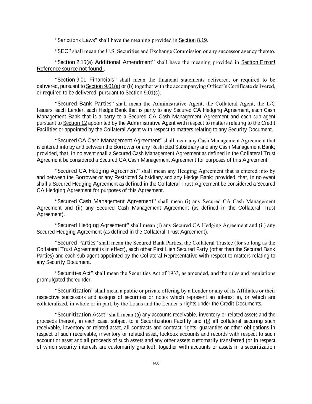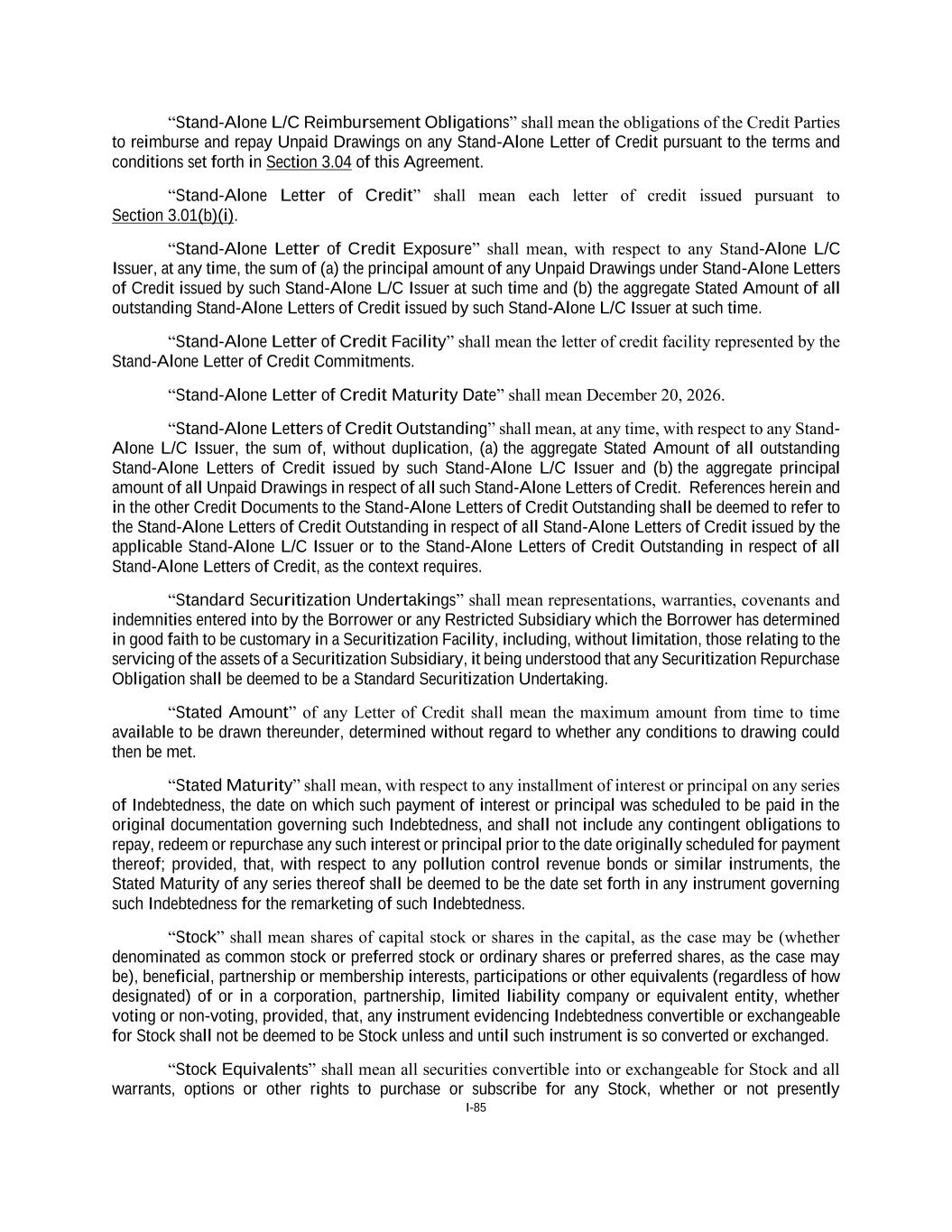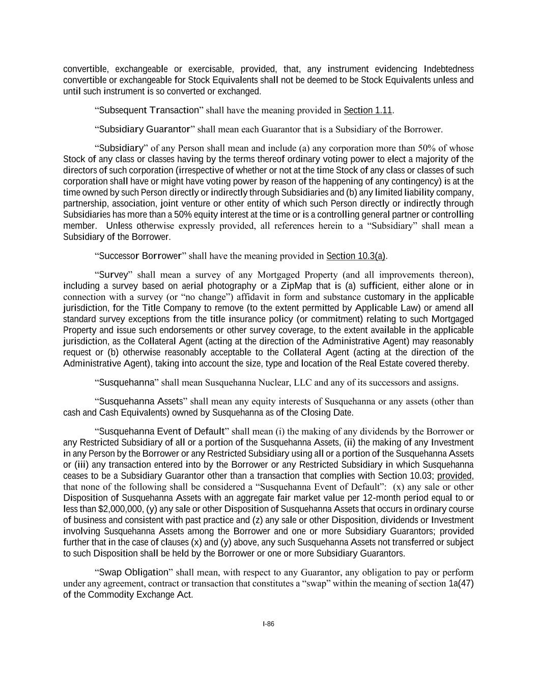 I-32 “Corresponding Tenor” with respect to any Available Tenor shall mean, as applicable, either a tenor (including overnight) or an interest payment period having approximately the same length (disregarding business day adjustment) as such Available Tenor. “Covered Commodity” shall mean any energy, electricity, generation, capacity, power, heat rate, congestion, natural gas, natural gas liquids, nuclear fuel (including enrichment, conversion and fabrication rights), diesel fuel, fuel oil, other petroleum-based liquids, coal, lignite, feedstock, weather, emissions, carbon, renewable energy and other environmental credits, waste by-products, “cap and trade” related credits, or any other energy related commodity or service (including ancillary services, attributes with an economic value, and related risks (such as location basis)). “Credit Documents” shall mean this Agreement, Amendment No. 1, Amendment No. 2, Amendment No. 3, Amendment No. 4, the Guarantee, the Security Documents, the Collateral Trust Agreement, each Letter of Credit and any promissory notes issued by the Borrower hereunder, provided, that, for the avoidance of doubt, Cash Management Agreements, Secured Cash Management Agreements, Hedging Agreements and Secured Hedging Agreements shall not be Credit Documents. “Credit Event” shall mean and include the making (but not the conversion or continuation) of a Loan and the issuance of a Letter of Credit. “Credit Facility” shall mean any category of Commitments and extensions of credit thereunder. “Credit Party” shall mean each of the Borrower, each of the Subsidiary Guarantors and each other Restricted Subsidiary of the Borrower that is a guarantor under the Guarantee. “Creditors’ Committee” shall mean the “Creditors’ Committee” as defined in the Plan. “Cure Amount” shall have the meaning provided in Section 11.14(a). “Cure Period” shall have the meaning provided in Section 11.14(a). “Cure Right” shall have the meaning provided in Section 11.14(a). “Daily Simple SOFR” shall mean, for any day (such day, a “SOFR Rate Day”), a rate per annum equal to SOFR for the day (such day, a “SOFR Determination Date”) that is two (2) U.S. Government Securities Business Days prior to (i) if such SOFR Rate Day is a U.S. Government Securities Business Day, such SOFR Rate Day or (ii) if such SOFR Rate Day is not a U.S. Government Securities Business Day, the U.S. Government Securities Business Day immediately preceding such SOFR Rate Day, in each case, as such SOFR is published by the SOFR Administrator on the SOFR Administrator’s Website. Any change in Daily Simple SOFR due to a change in SOFR shall be effective from and including the effective date of such change in SOFR without notice to the Borrower. “Debt Incurrence Prepayment Event” shall mean any issuance or incurrence by the Borrower or any of the Restricted Subsidiaries of any Indebtedness (other than as permitted to be issued or incurred under Section 10.01). “Debtors” shall have the meaning provided in the recitals to this Agreement. “Declined Proceeds” shall have the meaning provided in Section 5.02(h). “Default” shall mean any event, act or condition that, with notice or lapse of time or both, would constitute an Event of Default. “Default Rate” shall have the meaning provided in Section 2.08(c).