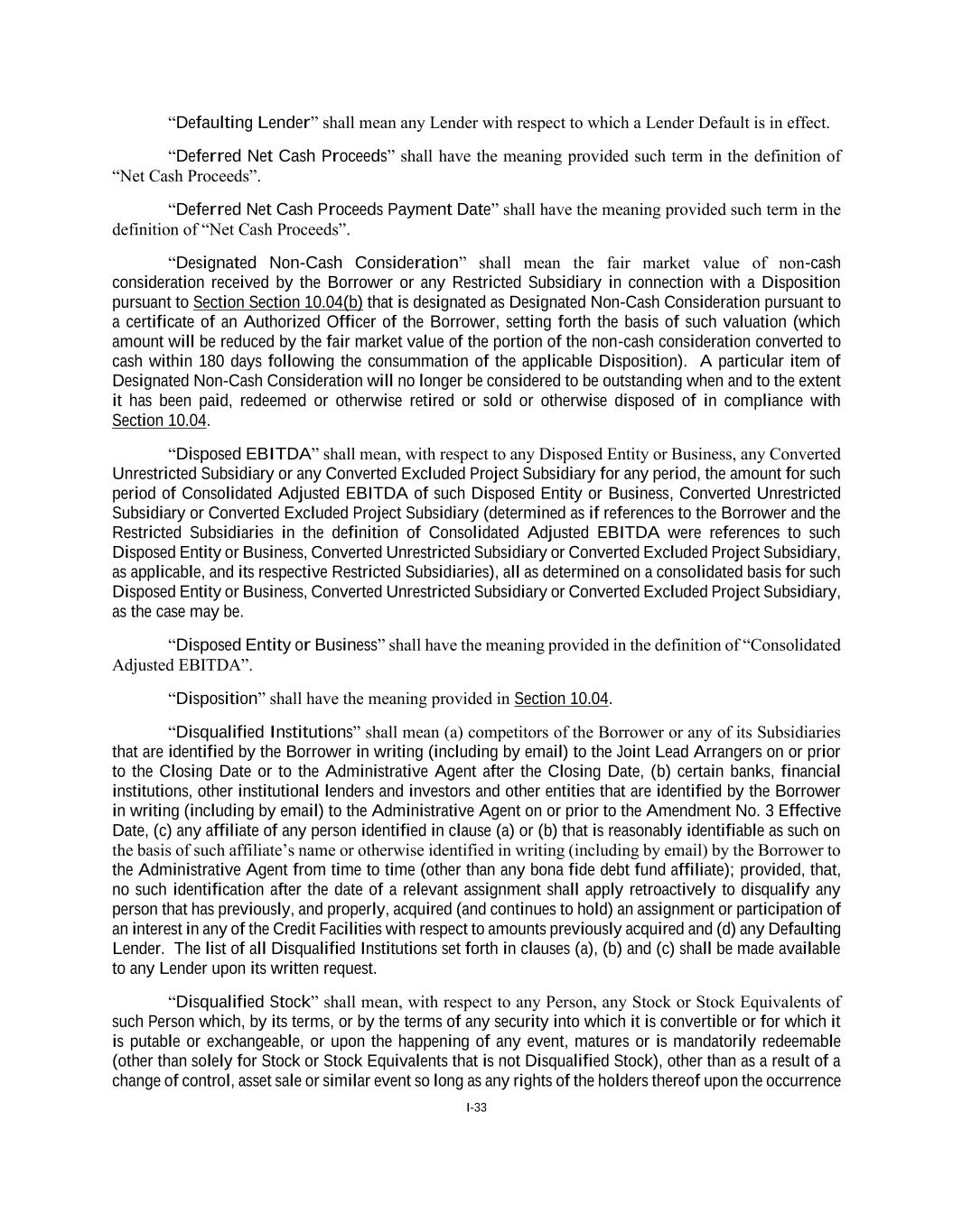 I-33 “Defaulting Lender” shall mean any Lender with respect to which a Lender Default is in effect. “Deferred Net Cash Proceeds” shall have the meaning provided such term in the definition of “Net Cash Proceeds”. “Deferred Net Cash Proceeds Payment Date” shall have the meaning provided such term in the definition of “Net Cash Proceeds”. “Designated Non-Cash Consideration” shall mean the fair market value of non-cash consideration received by the Borrower or any Restricted Subsidiary in connection with a Disposition pursuant to Section Section 10.04(b) that is designated as Designated Non-Cash Consideration pursuant to a certificate of an Authorized Officer of the Borrower, setting forth the basis of such valuation (which amount will be reduced by the fair market value of the portion of the non-cash consideration converted to cash within 180 days following the consummation of the applicable Disposition). A particular item of Designated Non-Cash Consideration will no longer be considered to be outstanding when and to the extent it has been paid, redeemed or otherwise retired or sold or otherwise disposed of in compliance with Section 10.04. “Disposed EBITDA” shall mean, with respect to any Disposed Entity or Business, any Converted Unrestricted Subsidiary or any Converted Excluded Project Subsidiary for any period, the amount for such period of Consolidated Adjusted EBITDA of such Disposed Entity or Business, Converted Unrestricted Subsidiary or Converted Excluded Project Subsidiary (determined as if references to the Borrower and the Restricted Subsidiaries in the definition of Consolidated Adjusted EBITDA were references to such Disposed Entity or Business, Converted Unrestricted Subsidiary or Converted Excluded Project Subsidiary, as applicable, and its respective Restricted Subsidiaries), all as determined on a consolidated basis for such Disposed Entity or Business, Converted Unrestricted Subsidiary or Converted Excluded Project Subsidiary, as the case may be. “Disposed Entity or Business” shall have the meaning provided in the definition of “Consolidated Adjusted EBITDA”. “Disposition” shall have the meaning provided in Section 10.04. “Disqualified Institutions” shall mean (a) competitors of the Borrower or any of its Subsidiaries that are identified by the Borrower in writing (including by email) to the Joint Lead Arrangers on or prior to the Closing Date or to the Administrative Agent after the Closing Date, (b) certain banks, financial institutions, other institutional lenders and investors and other entities that are identified by the Borrower in writing (including by email) to the Administrative Agent on or prior to the Amendment No. 3 Effective Date, (c) any affiliate of any person identified in clause (a) or (b) that is reasonably identifiable as such on the basis of such affiliate’s name or otherwise identified in writing (including by email) by the Borrower to the Administrative Agent from time to time (other than any bona fide debt fund affiliate); provided, that, no such identification after the date of a relevant assignment shall apply retroactively to disqualify any person that has previously, and properly, acquired (and continues to hold) an assignment or participation of an interest in any of the Credit Facilities with respect to amounts previously acquired and (d) any Defaulting Lender. The list of all Disqualified Institutions set forth in clauses (a), (b) and (c) shall be made available to any Lender upon its written request. “Disqualified Stock” shall mean, with respect to any Person, any Stock or Stock Equivalents of such Person which, by its terms, or by the terms of any security into which it is convertible or for which it is putable or exchangeable, or upon the happening of any event, matures or is mandatorily redeemable (other than solely for Stock or Stock Equivalents that is not Disqualified Stock), other than as a result of a change of control, asset sale or similar event so long as any rights of the holders thereof upon the occurrence