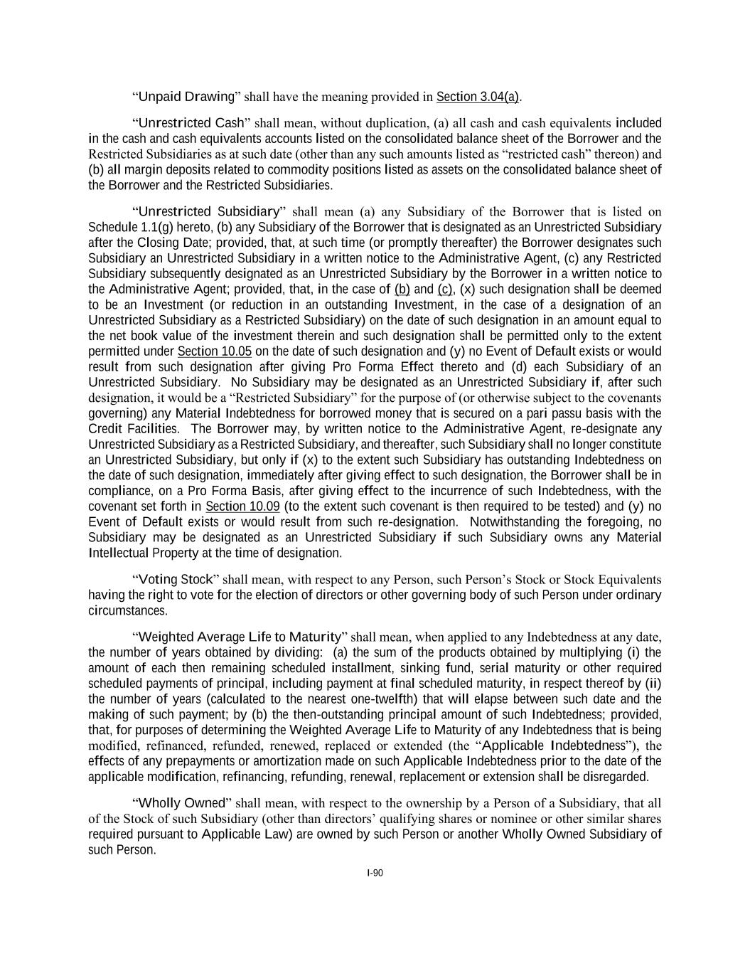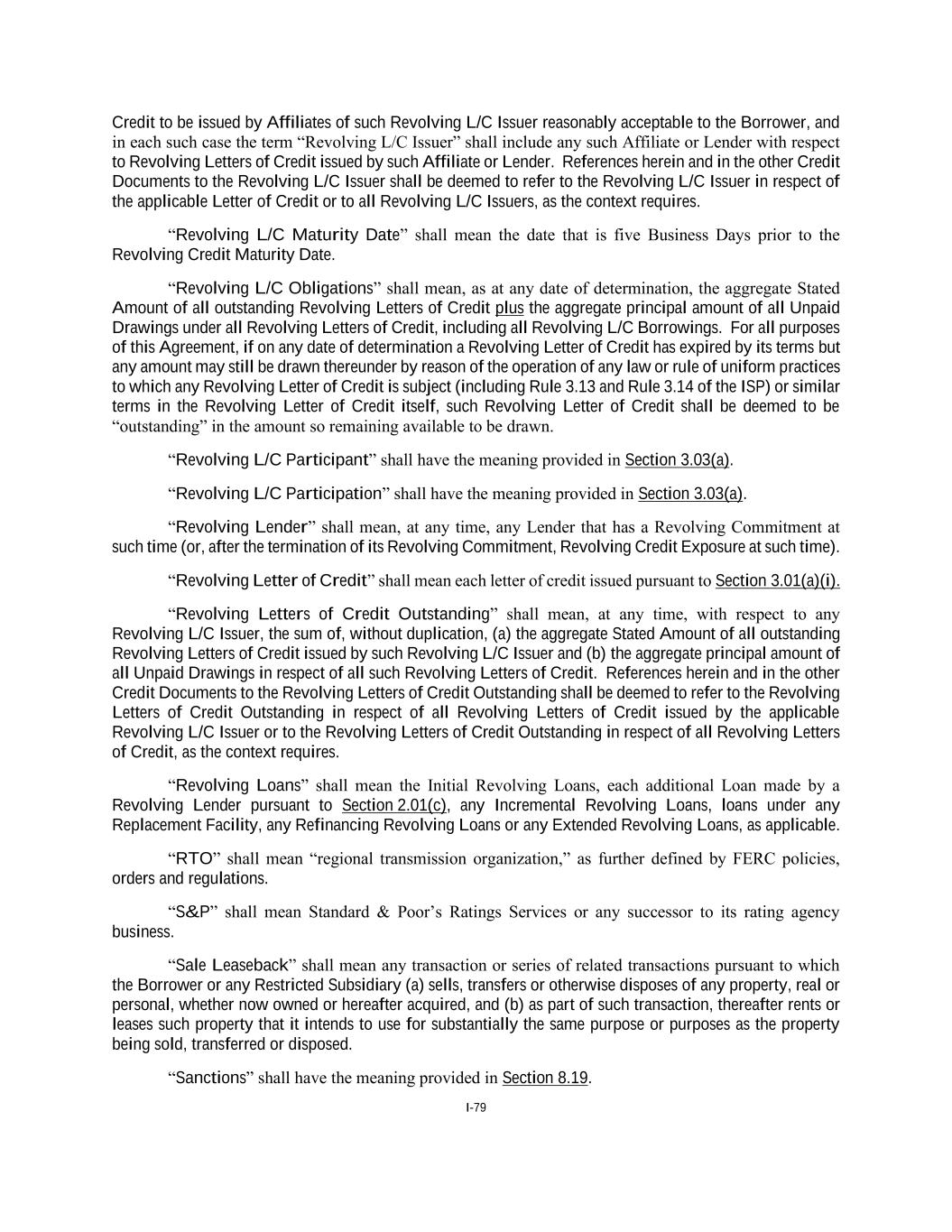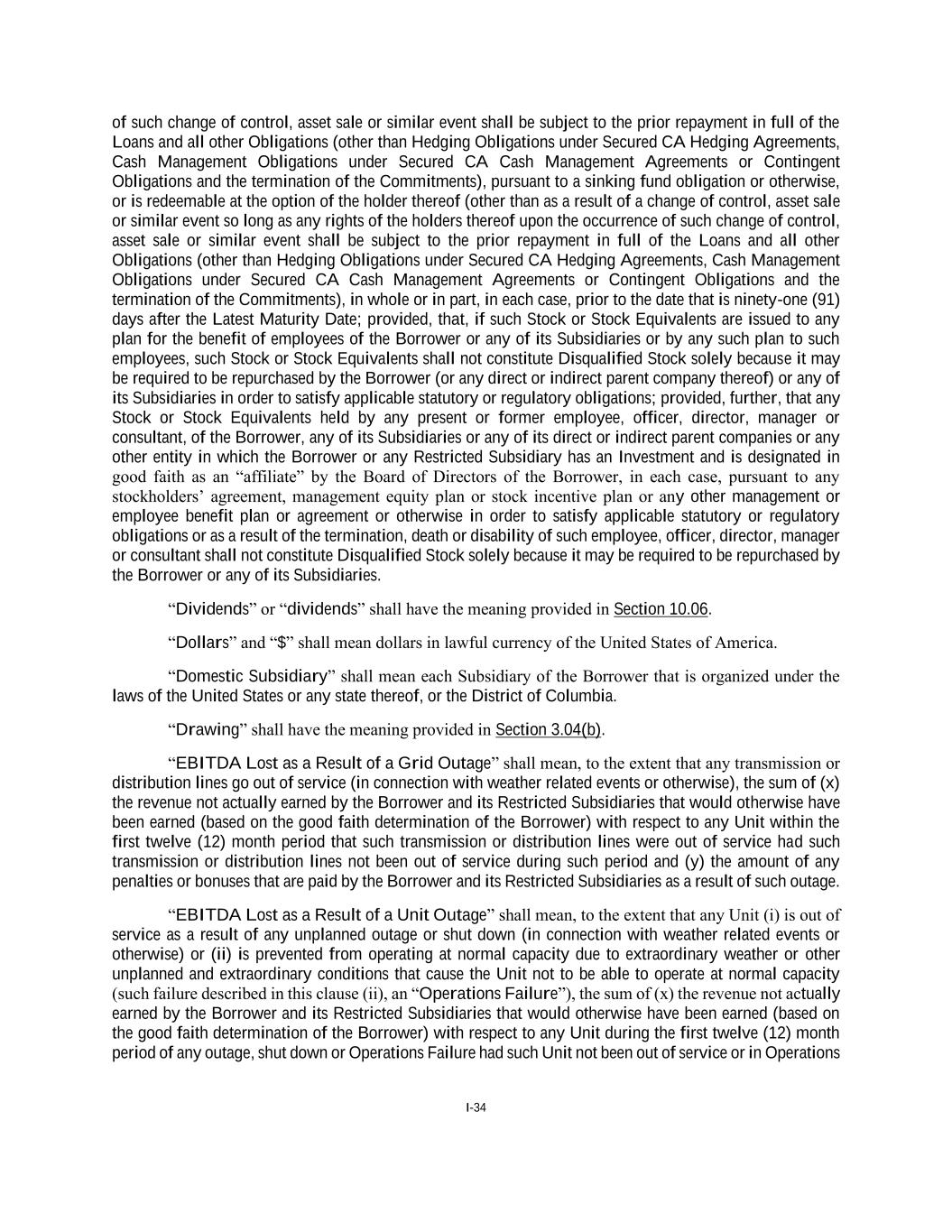 I-34 of such change of control, asset sale or similar event shall be subject to the prior repayment in full of the Loans and all other Obligations (other than Hedging Obligations under Secured CA Hedging Agreements, Cash Management Obligations under Secured CA Cash Management Agreements or Contingent Obligations and the termination of the Commitments), pursuant to a sinking fund obligation or otherwise, or is redeemable at the option of the holder thereof (other than as a result of a change of control, asset sale or similar event so long as any rights of the holders thereof upon the occurrence of such change of control, asset sale or similar event shall be subject to the prior repayment in full of the Loans and all other Obligations (other than Hedging Obligations under Secured CA Hedging Agreements, Cash Management Obligations under Secured CA Cash Management Agreements or Contingent Obligations and the termination of the Commitments), in whole or in part, in each case, prior to the date that is ninety-one (91) days after the Latest Maturity Date; provided, that, if such Stock or Stock Equivalents are issued to any plan for the benefit of employees of the Borrower or any of its Subsidiaries or by any such plan to such employees, such Stock or Stock Equivalents shall not constitute Disqualified Stock solely because it may be required to be repurchased by the Borrower (or any direct or indirect parent company thereof) or any of its Subsidiaries in order to satisfy applicable statutory or regulatory obligations; provided, further, that any Stock or Stock Equivalents held by any present or former employee, officer, director, manager or consultant, of the Borrower, any of its Subsidiaries or any of its direct or indirect parent companies or any other entity in which the Borrower or any Restricted Subsidiary has an Investment and is designated in good faith as an “affiliate” by the Board of Directors of the Borrower, in each case, pursuant to any stockholders’ agreement, management equity plan or stock incentive plan or any other management or employee benefit plan or agreement or otherwise in order to satisfy applicable statutory or regulatory obligations or as a result of the termination, death or disability of such employee, officer, director, manager or consultant shall not constitute Disqualified Stock solely because it may be required to be repurchased by the Borrower or any of its Subsidiaries. “Dividends” or “dividends” shall have the meaning provided in Section 10.06. “Dollars” and “$” shall mean dollars in lawful currency of the United States of America. “Domestic Subsidiary” shall mean each Subsidiary of the Borrower that is organized under the laws of the United States or any state thereof, or the District of Columbia. “Drawing” shall have the meaning provided in Section 3.04(b). “EBITDA Lost as a Result of a Grid Outage” shall mean, to the extent that any transmission or distribution lines go out of service (in connection with weather related events or otherwise), the sum of (x) the revenue not actually earned by the Borrower and its Restricted Subsidiaries that would otherwise have been earned (based on the good faith determination of the Borrower) with respect to any Unit within the first twelve (12) month period that such transmission or distribution lines were out of service had such transmission or distribution lines not been out of service during such period and (y) the amount of any penalties or bonuses that are paid by the Borrower and its Restricted Subsidiaries as a result of such outage. “EBITDA Lost as a Result of a Unit Outage” shall mean, to the extent that any Unit (i) is out of service as a result of any unplanned outage or shut down (in connection with weather related events or otherwise) or (ii) is prevented from operating at normal capacity due to extraordinary weather or other unplanned and extraordinary conditions that cause the Unit not to be able to operate at normal capacity (such failure described in this clause (ii), an “Operations Failure”), the sum of (x) the revenue not actually earned by the Borrower and its Restricted Subsidiaries that would otherwise have been earned (based on the good faith determination of the Borrower) with respect to any Unit during the first twelve (12) month period of any outage, shut down or Operations Failure had such Unit not been out of service or in Operations