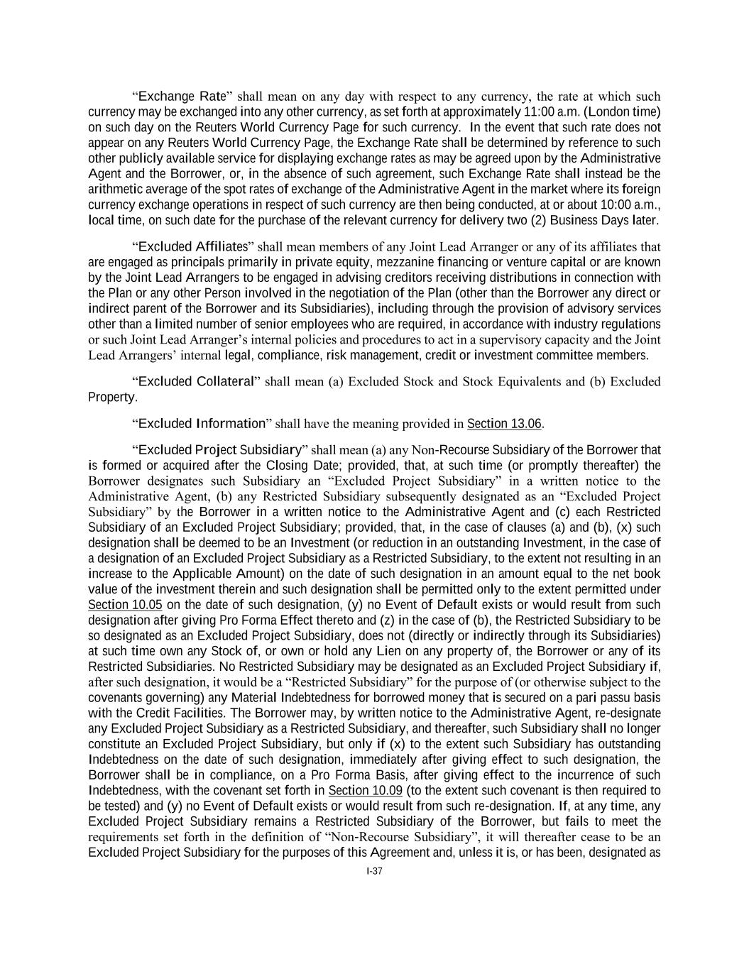 I-37 “Exchange Rate” shall mean on any day with respect to any currency, the rate at which such currency may be exchanged into any other currency, as set forth at approximately 11:00 a.m. (London time) on such day on the Reuters World Currency Page for such currency. In the event that such rate does not appear on any Reuters World Currency Page, the Exchange Rate shall be determined by reference to such other publicly available service for displaying exchange rates as may be agreed upon by the Administrative Agent and the Borrower, or, in the absence of such agreement, such Exchange Rate shall instead be the arithmetic average of the spot rates of exchange of the Administrative Agent in the market where its foreign currency exchange operations in respect of such currency are then being conducted, at or about 10:00 a.m., local time, on such date for the purchase of the relevant currency for delivery two (2) Business Days later. “Excluded Affiliates” shall mean members of any Joint Lead Arranger or any of its affiliates that are engaged as principals primarily in private equity, mezzanine financing or venture capital or are known by the Joint Lead Arrangers to be engaged in advising creditors receiving distributions in connection with the Plan or any other Person involved in the negotiation of the Plan (other than the Borrower any direct or indirect parent of the Borrower and its Subsidiaries), including through the provision of advisory services other than a limited number of senior employees who are required, in accordance with industry regulations or such Joint Lead Arranger’s internal policies and procedures to act in a supervisory capacity and the Joint Lead Arrangers’ internal legal, compliance, risk management, credit or investment committee members. “Excluded Collateral” shall mean (a) Excluded Stock and Stock Equivalents and (b) Excluded Property. “Excluded Information” shall have the meaning provided in Section 13.06. “Excluded Project Subsidiary” shall mean (a) any Non-Recourse Subsidiary of the Borrower that is formed or acquired after the Closing Date; provided, that, at such time (or promptly thereafter) the Borrower designates such Subsidiary an “Excluded Project Subsidiary” in a written notice to the Administrative Agent, (b) any Restricted Subsidiary subsequently designated as an “Excluded Project Subsidiary” by the Borrower in a written notice to the Administrative Agent and (c) each Restricted Subsidiary of an Excluded Project Subsidiary; provided, that, in the case of clauses (a) and (b), (x) such designation shall be deemed to be an Investment (or reduction in an outstanding Investment, in the case of a designation of an Excluded Project Subsidiary as a Restricted Subsidiary, to the extent not resulting in an increase to the Applicable Amount) on the date of such designation in an amount equal to the net book value of the investment therein and such designation shall be permitted only to the extent permitted under Section 10.05 on the date of such designation, (y) no Event of Default exists or would result from such designation after giving Pro Forma Effect thereto and (z) in the case of (b), the Restricted Subsidiary to be so designated as an Excluded Project Subsidiary, does not (directly or indirectly through its Subsidiaries) at such time own any Stock of, or own or hold any Lien on any property of, the Borrower or any of its Restricted Subsidiaries. No Restricted Subsidiary may be designated as an Excluded Project Subsidiary if, after such designation, it would be a “Restricted Subsidiary” for the purpose of (or otherwise subject to the covenants governing) any Material Indebtedness for borrowed money that is secured on a pari passu basis with the Credit Facilities. The Borrower may, by written notice to the Administrative Agent, re-designate any Excluded Project Subsidiary as a Restricted Subsidiary, and thereafter, such Subsidiary shall no longer constitute an Excluded Project Subsidiary, but only if (x) to the extent such Subsidiary has outstanding Indebtedness on the date of such designation, immediately after giving effect to such designation, the Borrower shall be in compliance, on a Pro Forma Basis, after giving effect to the incurrence of such Indebtedness, with the covenant set forth in Section 10.09 (to the extent such covenant is then required to be tested) and (y) no Event of Default exists or would result from such re-designation. If, at any time, any Excluded Project Subsidiary remains a Restricted Subsidiary of the Borrower, but fails to meet the requirements set forth in the definition of “Non-Recourse Subsidiary”, it will thereafter cease to be an Excluded Project Subsidiary for the purposes of this Agreement and, unless it is, or has been, designated as
