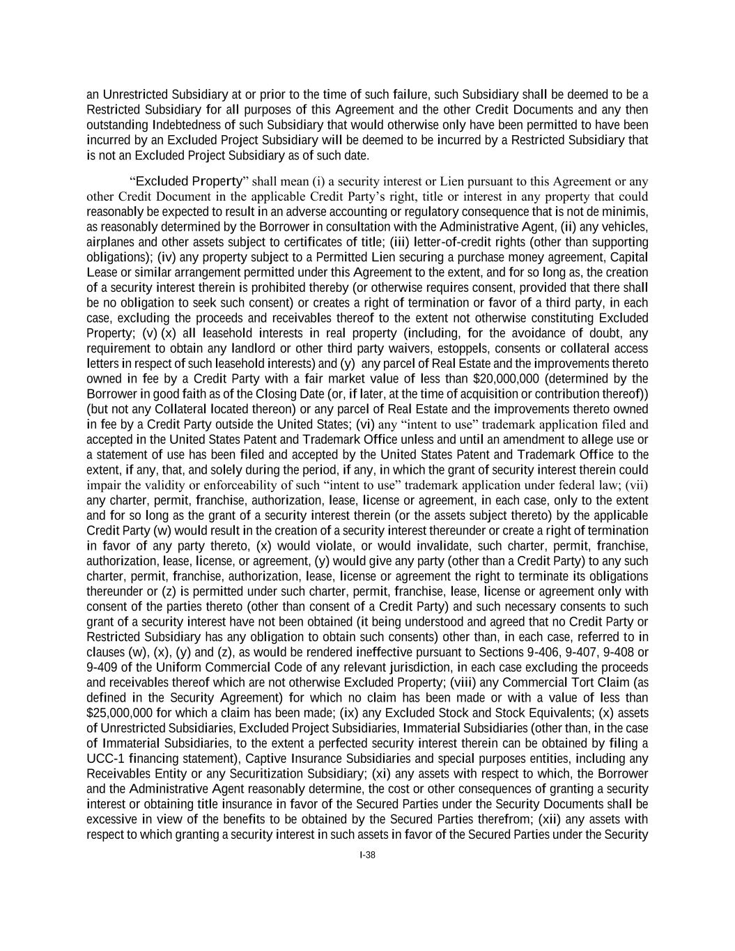 I-38 an Unrestricted Subsidiary at or prior to the time of such failure, such Subsidiary shall be deemed to be a Restricted Subsidiary for all purposes of this Agreement and the other Credit Documents and any then outstanding Indebtedness of such Subsidiary that would otherwise only have been permitted to have been incurred by an Excluded Project Subsidiary will be deemed to be incurred by a Restricted Subsidiary that is not an Excluded Project Subsidiary as of such date. “Excluded Property” shall mean (i) a security interest or Lien pursuant to this Agreement or any other Credit Document in the applicable Credit Party’s right, title or interest in any property that could reasonably be expected to result in an adverse accounting or regulatory consequence that is not de minimis, as reasonably determined by the Borrower in consultation with the Administrative Agent, (ii) any vehicles, airplanes and other assets subject to certificates of title; (iii) letter-of-credit rights (other than supporting obligations); (iv) any property subject to a Permitted Lien securing a purchase money agreement, Capital Lease or similar arrangement permitted under this Agreement to the extent, and for so long as, the creation of a security interest therein is prohibited thereby (or otherwise requires consent, provided that there shall be no obligation to seek such consent) or creates a right of termination or favor of a third party, in each case, excluding the proceeds and receivables thereof to the extent not otherwise constituting Excluded Property; (v) (x) all leasehold interests in real property (including, for the avoidance of doubt, any requirement to obtain any landlord or other third party waivers, estoppels, consents or collateral access letters in respect of such leasehold interests) and (y) any parcel of Real Estate and the improvements thereto owned in fee by a Credit Party with a fair market value of less than $20,000,000 (determined by the Borrower in good faith as of the Closing Date (or, if later, at the time of acquisition or contribution thereof)) (but not any Collateral located thereon) or any parcel of Real Estate and the improvements thereto owned in fee by a Credit Party outside the United States; (vi) any “intent to use” trademark application filed and accepted in the United States Patent and Trademark Office unless and until an amendment to allege use or a statement of use has been filed and accepted by the United States Patent and Trademark Office to the extent, if any, that, and solely during the period, if any, in which the grant of security interest therein could impair the validity or enforceability of such “intent to use” trademark application under federal law; (vii) any charter, permit, franchise, authorization, lease, license or agreement, in each case, only to the extent and for so long as the grant of a security interest therein (or the assets subject thereto) by the applicable Credit Party (w) would result in the creation of a security interest thereunder or create a right of termination in favor of any party thereto, (x) would violate, or would invalidate, such charter, permit, franchise, authorization, lease, license, or agreement, (y) would give any party (other than a Credit Party) to any such charter, permit, franchise, authorization, lease, license or agreement the right to terminate its obligations thereunder or (z) is permitted under such charter, permit, franchise, lease, license or agreement only with consent of the parties thereto (other than consent of a Credit Party) and such necessary consents to such grant of a security interest have not been obtained (it being understood and agreed that no Credit Party or Restricted Subsidiary has any obligation to obtain such consents) other than, in each case, referred to in clauses (w), (x), (y) and (z), as would be rendered ineffective pursuant to Sections 9-406, 9-407, 9-408 or 9-409 of the Uniform Commercial Code of any relevant jurisdiction, in each case excluding the proceeds and receivables thereof which are not otherwise Excluded Property; (viii) any Commercial Tort Claim (as defined in the Security Agreement) for which no claim has been made or with a value of less than $25,000,000 for which a claim has been made; (ix) any Excluded Stock and Stock Equivalents; (x) assets of Unrestricted Subsidiaries, Excluded Project Subsidiaries, Immaterial Subsidiaries (other than, in the case of Immaterial Subsidiaries, to the extent a perfected security interest therein can be obtained by filing a UCC-1 financing statement), Captive Insurance Subsidiaries and special purposes entities, including any Receivables Entity or any Securitization Subsidiary; (xi) any assets with respect to which, the Borrower and the Administrative Agent reasonably determine, the cost or other consequences of granting a security interest or obtaining title insurance in favor of the Secured Parties under the Security Documents shall be excessive in view of the benefits to be obtained by the Secured Parties therefrom; (xii) any assets with respect to which granting a security interest in such assets in favor of the Secured Parties under the Security