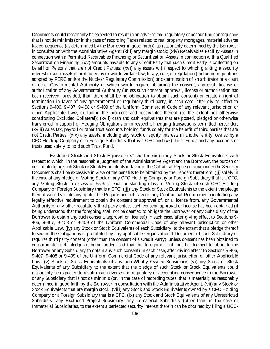 I-39 Documents could reasonably be expected to result in an adverse tax, regulatory or accounting consequence that is not de minimis (or in the case of recording Taxes related to real property mortgages, material adverse tax consequence (as determined by the Borrower in good faith)), as reasonably determined by the Borrower in consultation with the Administrative Agent; (xiii) any margin stock; (xiv) Receivables Facility Assets in connection with a Permitted Receivables Financing or Securitization Assets in connection with a Qualified Securitization Financing; (xv) amounts payable to any Credit Party that such Credit Party is collecting on behalf of Persons that are not Credit Parties; (xvi) any assets with respect to which granting a security interest in such assets is prohibited by or would violate law, treaty, rule, or regulation (including regulations adopted by FERC and/or the Nuclear Regulatory Commission) or determination of an arbitrator or a court or other Governmental Authority or which would require obtaining the consent, approval, license or authorization of any Governmental Authority (unless such consent, approval, license or authorization has been received; provided, that, there shall be no obligation to obtain such consent) or create a right of termination in favor of any governmental or regulatory third party, in each case, after giving effect to Sections 9-406, 9-407, 9-408 or 9-409 of the Uniform Commercial Code of any relevant jurisdiction or other Applicable Law, excluding the proceeds and receivables thereof (to the extent not otherwise constituting Excluded Collateral); (xvii) cash and cash equivalents that are posted, pledged or otherwise transferred in support of Hedging Obligations or in respect of hedging transactions permitted hereunder; (xviii) sales tax, payroll or other trust accounts holding funds solely for the benefit of third parties that are not Credit Parties; (xix) any assets, including any stock or equity interests in another entity, owned by a CFC Holding Company or a Foreign Subsidiary that is a CFC and (xx) Trust Funds and any accounts or trusts used solely to hold such Trust Fund. “Excluded Stock and Stock Equivalents” shall mean (i) any Stock or Stock Equivalents with respect to which, in the reasonable judgment of the Administrative Agent and the Borrower, the burden or cost of pledging such Stock or Stock Equivalents in favor of the Collateral Representative under the Security Documents shall be excessive in view of the benefits to be obtained by the Lenders therefrom, (ii) solely in the case of any pledge of Voting Stock of any CFC Holding Company or Foreign Subsidiary that is a CFC, any Voting Stock in excess of 65% of each outstanding class of Voting Stock of such CFC Holding Company or Foreign Subsidiary that is a CFC, (iii) any Stock or Stock Equivalents to the extent the pledge thereof would violate any applicable Requirement of Law or, any Contractual Requirement (including any legally effective requirement to obtain the consent or approval of, or a license from, any Governmental Authority or any other regulatory third party unless such consent, approval or license has been obtained (it being understood that the foregoing shall not be deemed to obligate the Borrower or any Subsidiary of the Borrower to obtain any such consent, approval or license)) in each case, after giving effect to Sections 9- 406, 9-407, 9-408 or 9-409 of the Uniform Commercial Code of any relevant jurisdiction or other Applicable Law, (iv) any Stock or Stock Equivalents of each Subsidiary to the extent that a pledge thereof to secure the Obligations is prohibited by any applicable Organizational Document of such Subsidiary or requires third party consent (other than the consent of a Credit Party), unless consent has been obtained to consummate such pledge (it being understood that the foregoing shall not be deemed to obligate the Borrower or any Subsidiary to obtain any such consent) in each case, after giving effect to Sections 9-406, 9-407, 9-408 or 9-409 of the Uniform Commercial Code of any relevant jurisdiction or other Applicable Law, (v) Stock or Stock Equivalents of any non-Wholly Owned Subsidiary, (vi) any Stock or Stock Equivalents of any Subsidiary to the extent that the pledge of such Stock or Stock Equivalents could reasonably be expected to result in an adverse tax, regulatory or accounting consequence to the Borrower or any Subsidiary that is not de minimis (or, in the case of recording taxes, that is material), as reasonably determined in good faith by the Borrower in consultation with the Administrative Agent, (vii) any Stock or Stock Equivalents that are margin stock, (viii) any Stock and Stock Equivalents owned by a CFC Holding Company or a Foreign Subsidiary that is a CFC, (ix) any Stock and Stock Equivalents of any Unrestricted Subsidiary, any Excluded Project Subsidiary, any Immaterial Subsidiary (other than, in the case of Immaterial Subsidiaries, to the extent a perfected security interest therein can be obtained by filing a UCC-
