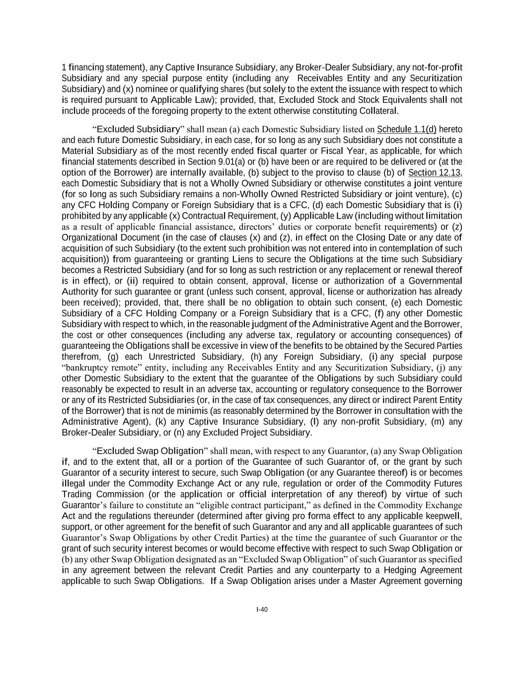 I-40 1 financing statement), any Captive Insurance Subsidiary, any Broker-Dealer Subsidiary, any not-for-profit Subsidiary and any special purpose entity (including any Receivables Entity and any Securitization Subsidiary) and (x) nominee or qualifying shares (but solely to the extent the issuance with respect to which is required pursuant to Applicable Law); provided, that, Excluded Stock and Stock Equivalents shall not include proceeds of the foregoing property to the extent otherwise constituting Collateral. “Excluded Subsidiary” shall mean (a) each Domestic Subsidiary listed on Schedule 1.1(d) hereto and each future Domestic Subsidiary, in each case, for so long as any such Subsidiary does not constitute a Material Subsidiary as of the most recently ended fiscal quarter or Fiscal Year, as applicable, for which financial statements described in Section 9.01(a) or (b) have been or are required to be delivered or (at the option of the Borrower) are internally available, (b) subject to the proviso to clause (b) of Section 12.13, each Domestic Subsidiary that is not a Wholly Owned Subsidiary or otherwise constitutes a joint venture (for so long as such Subsidiary remains a non-Wholly Owned Restricted Subsidiary or joint venture), (c) any CFC Holding Company or Foreign Subsidiary that is a CFC, (d) each Domestic Subsidiary that is (i) prohibited by any applicable (x) Contractual Requirement, (y) Applicable Law (including without limitation as a result of applicable financial assistance, directors’ duties or corporate benefit requirements) or (z) Organizational Document (in the case of clauses (x) and (z), in effect on the Closing Date or any date of acquisition of such Subsidiary (to the extent such prohibition was not entered into in contemplation of such acquisition)) from guaranteeing or granting Liens to secure the Obligations at the time such Subsidiary becomes a Restricted Subsidiary (and for so long as such restriction or any replacement or renewal thereof is in effect), or (ii) required to obtain consent, approval, license or authorization of a Governmental Authority for such guarantee or grant (unless such consent, approval, license or authorization has already been received); provided, that, there shall be no obligation to obtain such consent, (e) each Domestic Subsidiary of a CFC Holding Company or a Foreign Subsidiary that is a CFC, (f) any other Domestic Subsidiary with respect to which, in the reasonable judgment of the Administrative Agent and the Borrower, the cost or other consequences (including any adverse tax, regulatory or accounting consequences) of guaranteeing the Obligations shall be excessive in view of the benefits to be obtained by the Secured Parties therefrom, (g) each Unrestricted Subsidiary, (h) any Foreign Subsidiary, (i) any special purpose “bankruptcy remote” entity, including any Receivables Entity and any Securitization Subsidiary, (j) any other Domestic Subsidiary to the extent that the guarantee of the Obligations by such Subsidiary could reasonably be expected to result in an adverse tax, accounting or regulatory consequence to the Borrower or any of its Restricted Subsidiaries (or, in the case of tax consequences, any direct or indirect Parent Entity of the Borrower) that is not de minimis (as reasonably determined by the Borrower in consultation with the Administrative Agent), (k) any Captive Insurance Subsidiary, (l) any non-profit Subsidiary, (m) any Broker-Dealer Subsidiary, or (n) any Excluded Project Subsidiary. “Excluded Swap Obligation” shall mean, with respect to any Guarantor, (a) any Swap Obligation if, and to the extent that, all or a portion of the Guarantee of such Guarantor of, or the grant by such Guarantor of a security interest to secure, such Swap Obligation (or any Guarantee thereof) is or becomes illegal under the Commodity Exchange Act or any rule, regulation or order of the Commodity Futures Trading Commission (or the application or official interpretation of any thereof) by virtue of such Guarantor’s failure to constitute an “eligible contract participant,” as defined in the Commodity Exchange Act and the regulations thereunder (determined after giving pro forma effect to any applicable keepwell, support, or other agreement for the benefit of such Guarantor and any and all applicable guarantees of such Guarantor’s Swap Obligations by other Credit Parties) at the time the guarantee of such Guarantor or the grant of such security interest becomes or would become effective with respect to such Swap Obligation or (b) any other Swap Obligation designated as an “Excluded Swap Obligation” of such Guarantor as specified in any agreement between the relevant Credit Parties and any counterparty to a Hedging Agreement applicable to such Swap Obligations. If a Swap Obligation arises under a Master Agreement governing