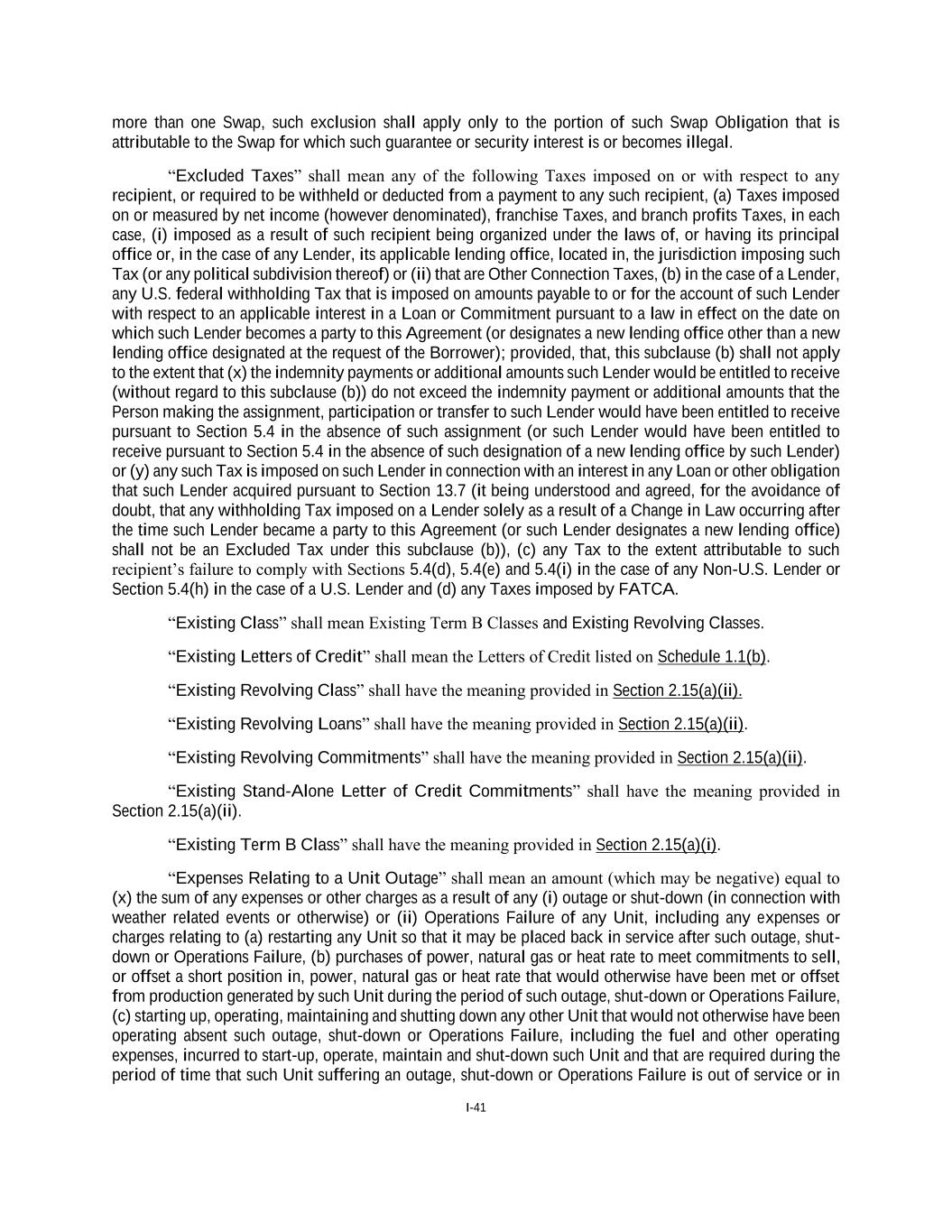 I-41 more than one Swap, such exclusion shall apply only to the portion of such Swap Obligation that is attributable to the Swap for which such guarantee or security interest is or becomes illegal. “Excluded Taxes” shall mean any of the following Taxes imposed on or with respect to any recipient, or required to be withheld or deducted from a payment to any such recipient, (a) Taxes imposed on or measured by net income (however denominated), franchise Taxes, and branch profits Taxes, in each case, (i) imposed as a result of such recipient being organized under the laws of, or having its principal office or, in the case of any Lender, its applicable lending office, located in, the jurisdiction imposing such Tax (or any political subdivision thereof) or (ii) that are Other Connection Taxes, (b) in the case of a Lender, any U.S. federal withholding Tax that is imposed on amounts payable to or for the account of such Lender with respect to an applicable interest in a Loan or Commitment pursuant to a law in effect on the date on which such Lender becomes a party to this Agreement (or designates a new lending office other than a new lending office designated at the request of the Borrower); provided, that, this subclause (b) shall not apply to the extent that (x) the indemnity payments or additional amounts such Lender would be entitled to receive (without regard to this subclause (b)) do not exceed the indemnity payment or additional amounts that the Person making the assignment, participation or transfer to such Lender would have been entitled to receive pursuant to Section 5.4 in the absence of such assignment (or such Lender would have been entitled to receive pursuant to Section 5.4 in the absence of such designation of a new lending office by such Lender) or (y) any such Tax is imposed on such Lender in connection with an interest in any Loan or other obligation that such Lender acquired pursuant to Section 13.7 (it being understood and agreed, for the avoidance of doubt, that any withholding Tax imposed on a Lender solely as a result of a Change in Law occurring after the time such Lender became a party to this Agreement (or such Lender designates a new lending office) shall not be an Excluded Tax under this subclause (b)), (c) any Tax to the extent attributable to such recipient’s failure to comply with Sections 5.4(d), 5.4(e) and 5.4(i) in the case of any Non-U.S. Lender or Section 5.4(h) in the case of a U.S. Lender and (d) any Taxes imposed by FATCA. “Existing Class” shall mean Existing Term B Classes and Existing Revolving Classes. “Existing Letters of Credit” shall mean the Letters of Credit listed on Schedule 1.1(b). “Existing Revolving Class” shall have the meaning provided in Section 2.15(a)(ii). “Existing Revolving Loans” shall have the meaning provided in Section 2.15(a)(ii). “Existing Revolving Commitments” shall have the meaning provided in Section 2.15(a)(ii). “Existing Stand-Alone Letter of Credit Commitments” shall have the meaning provided in Section 2.15(a)(ii). “Existing Term B Class” shall have the meaning provided in Section 2.15(a)(i). “Expenses Relating to a Unit Outage” shall mean an amount (which may be negative) equal to (x) the sum of any expenses or other charges as a result of any (i) outage or shut-down (in connection with weather related events or otherwise) or (ii) Operations Failure of any Unit, including any expenses or charges relating to (a) restarting any Unit so that it may be placed back in service after such outage, shut- down or Operations Failure, (b) purchases of power, natural gas or heat rate to meet commitments to sell, or offset a short position in, power, natural gas or heat rate that would otherwise have been met or offset from production generated by such Unit during the period of such outage, shut-down or Operations Failure, (c) starting up, operating, maintaining and shutting down any other Unit that would not otherwise have been operating absent such outage, shut-down or Operations Failure, including the fuel and other operating expenses, incurred to start-up, operate, maintain and shut-down such Unit and that are required during the period of time that such Unit suffering an outage, shut-down or Operations Failure is out of service or in