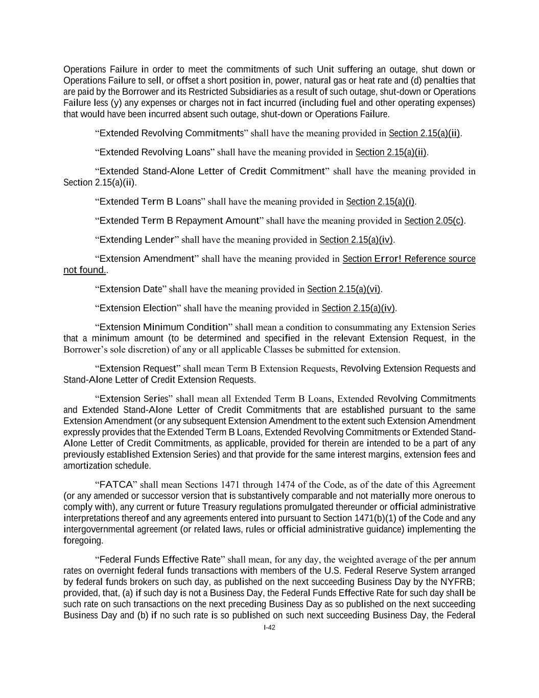 I-42 Operations Failure in order to meet the commitments of such Unit suffering an outage, shut down or Operations Failure to sell, or offset a short position in, power, natural gas or heat rate and (d) penalties that are paid by the Borrower and its Restricted Subsidiaries as a result of such outage, shut-down or Operations Failure less (y) any expenses or charges not in fact incurred (including fuel and other operating expenses) that would have been incurred absent such outage, shut-down or Operations Failure. “Extended Revolving Commitments” shall have the meaning provided in Section 2.15(a)(ii). “Extended Revolving Loans” shall have the meaning provided in Section 2.15(a)(ii). “Extended Stand-Alone Letter of Credit Commitment” shall have the meaning provided in Section 2.15(a)(ii). “Extended Term B Loans” shall have the meaning provided in Section 2.15(a)(i). “Extended Term B Repayment Amount” shall have the meaning provided in Section 2.05(c). “Extending Lender” shall have the meaning provided in Section 2.15(a)(iv). “Extension Amendment” shall have the meaning provided in Section Error! Reference source not found.. “Extension Date” shall have the meaning provided in Section 2.15(a)(vi). “Extension Election” shall have the meaning provided in Section 2.15(a)(iv). “Extension Minimum Condition” shall mean a condition to consummating any Extension Series that a minimum amount (to be determined and specified in the relevant Extension Request, in the Borrower’s sole discretion) of any or all applicable Classes be submitted for extension. “Extension Request” shall mean Term B Extension Requests, Revolving Extension Requests and Stand-Alone Letter of Credit Extension Requests. “Extension Series” shall mean all Extended Term B Loans, Extended Revolving Commitments and Extended Stand-Alone Letter of Credit Commitments that are established pursuant to the same Extension Amendment (or any subsequent Extension Amendment to the extent such Extension Amendment expressly provides that the Extended Term B Loans, Extended Revolving Commitments or Extended Stand- Alone Letter of Credit Commitments, as applicable, provided for therein are intended to be a part of any previously established Extension Series) and that provide for the same interest margins, extension fees and amortization schedule. “FATCA” shall mean Sections 1471 through 1474 of the Code, as of the date of this Agreement (or any amended or successor version that is substantively comparable and not materially more onerous to comply with), any current or future Treasury regulations promulgated thereunder or official administrative interpretations thereof and any agreements entered into pursuant to Section 1471(b)(1) of the Code and any intergovernmental agreement (or related laws, rules or official administrative guidance) implementing the foregoing. “Federal Funds Effective Rate” shall mean, for any day, the weighted average of the per annum rates on overnight federal funds transactions with members of the U.S. Federal Reserve System arranged by federal funds brokers on such day, as published on the next succeeding Business Day by the NYFRB; provided, that, (a) if such day is not a Business Day, the Federal Funds Effective Rate for such day shall be such rate on such transactions on the next preceding Business Day as so published on the next succeeding Business Day and (b) if no such rate is so published on such next succeeding Business Day, the Federal