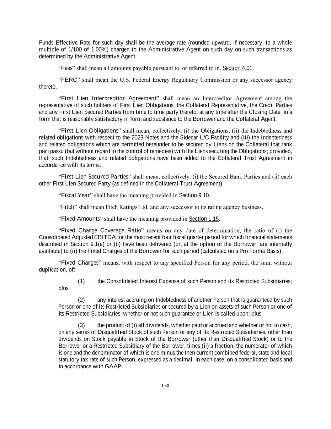 I-43 Funds Effective Rate for such day shall be the average rate (rounded upward, if necessary, to a whole multiple of 1/100 of 1.00%) charged to the Administrative Agent on such day on such transactions as determined by the Administrative Agent. “Fees” shall mean all amounts payable pursuant to, or referred to in, Section 4.01. “FERC” shall mean the U.S. Federal Energy Regulatory Commission or any successor agency thereto. “First Lien Intercreditor Agreement” shall mean an Intercreditor Agreement among the representative of such holders of First Lien Obligations, the Collateral Representative, the Credit Parties and any First Lien Secured Parties from time to time party thereto, at any time after the Closing Date, in a form that is reasonably satisfactory in form and substance to the Borrower and the Collateral Agent. “First Lien Obligations” shall mean, collectively, (i) the Obligations, (ii) the Indebtedness and related obligations with respect to the 2023 Notes and the Sidecar L/C Facility and (iii) the Indebtedness and related obligations which are permitted hereunder to be secured by Liens on the Collateral that rank pari passu (but without regard to the control of remedies) with the Liens securing the Obligations; provided, that, such Indebtedness and related obligations have been added to the Collateral Trust Agreement in accordance with its terms. “First Lien Secured Parties” shall mean, collectively, (i) the Secured Bank Parties and (ii) each other First Lien Secured Party (as defined in the Collateral Trust Agreement). “Fiscal Year” shall have the meaning provided in Section 9.10. “Fitch” shall mean Fitch Ratings Ltd. and any successor to its rating agency business. “Fixed Amounts” shall have the meaning provided in Section 1.15. “Fixed Charge Coverage Ratio” means on any date of determination, the ratio of (i) the Consolidated Adjusted EBITDA for the most recent four fiscal quarter period for which financial statements described in Section 9.1(a) or (b) have been delivered (or, at the option of the Borrower, are internally available) to (ii) the Fixed Charges of the Borrower for such period (calculated on a Pro Forma Basis). “Fixed Charges” means, with respect to any specified Person for any period, the sum, without duplication, of: (1) the Consolidated Interest Expense of such Person and its Restricted Subsidiaries; plus (2) any interest accruing on Indebtedness of another Person that is guaranteed by such Person or one of its Restricted Subsidiaries or secured by a Lien on assets of such Person or one of its Restricted Subsidiaries, whether or not such guarantee or Lien is called upon; plus (3) the product of (i) all dividends, whether paid or accrued and whether or not in cash, on any series of Disqualified Stock of such Person or any of its Restricted Subsidiaries, other than dividends on Stock payable in Stock of the Borrower (other than Disqualified Stock) or to the Borrower or a Restricted Subsidiary of the Borrower, times (ii) a fraction, the numerator of which is one and the denominator of which is one minus the then current combined federal, state and local statutory tax rate of such Person, expressed as a decimal, in each case, on a consolidated basis and in accordance with GAAP;