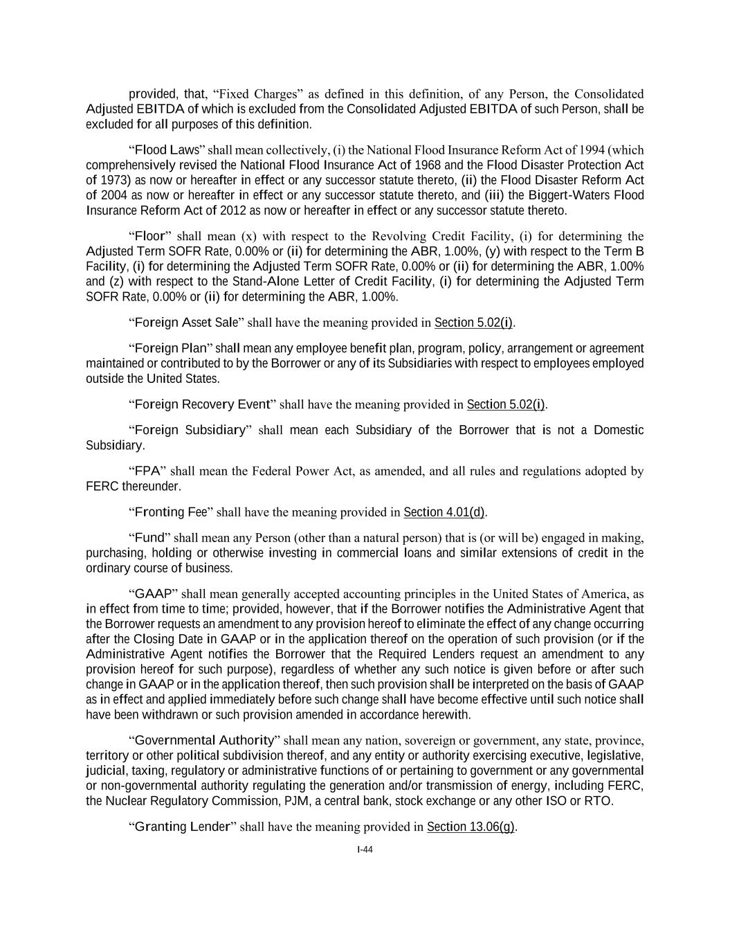 I-44 provided, that, “Fixed Charges” as defined in this definition, of any Person, the Consolidated Adjusted EBITDA of which is excluded from the Consolidated Adjusted EBITDA of such Person, shall be excluded for all purposes of this definition. “Flood Laws” shall mean collectively, (i) the National Flood Insurance Reform Act of 1994 (which comprehensively revised the National Flood Insurance Act of 1968 and the Flood Disaster Protection Act of 1973) as now or hereafter in effect or any successor statute thereto, (ii) the Flood Disaster Reform Act of 2004 as now or hereafter in effect or any successor statute thereto, and (iii) the Biggert-Waters Flood Insurance Reform Act of 2012 as now or hereafter in effect or any successor statute thereto. “Floor” shall mean (x) with respect to the Revolving Credit Facility, (i) for determining the Adjusted Term SOFR Rate, 0.00% or (ii) for determining the ABR, 1.00%, (y) with respect to the Term B Facility, (i) for determining the Adjusted Term SOFR Rate, 0.00% or (ii) for determining the ABR, 1.00% and (z) with respect to the Stand-Alone Letter of Credit Facility, (i) for determining the Adjusted Term SOFR Rate, 0.00% or (ii) for determining the ABR, 1.00%. “Foreign Asset Sale” shall have the meaning provided in Section 5.02(i). “Foreign Plan” shall mean any employee benefit plan, program, policy, arrangement or agreement maintained or contributed to by the Borrower or any of its Subsidiaries with respect to employees employed outside the United States. “Foreign Recovery Event” shall have the meaning provided in Section 5.02(i). “Foreign Subsidiary” shall mean each Subsidiary of the Borrower that is not a Domestic Subsidiary. “FPA” shall mean the Federal Power Act, as amended, and all rules and regulations adopted by FERC thereunder. “Fronting Fee” shall have the meaning provided in Section 4.01(d). “Fund” shall mean any Person (other than a natural person) that is (or will be) engaged in making, purchasing, holding or otherwise investing in commercial loans and similar extensions of credit in the ordinary course of business. “GAAP” shall mean generally accepted accounting principles in the United States of America, as in effect from time to time; provided, however, that if the Borrower notifies the Administrative Agent that the Borrower requests an amendment to any provision hereof to eliminate the effect of any change occurring after the Closing Date in GAAP or in the application thereof on the operation of such provision (or if the Administrative Agent notifies the Borrower that the Required Lenders request an amendment to any provision hereof for such purpose), regardless of whether any such notice is given before or after such change in GAAP or in the application thereof, then such provision shall be interpreted on the basis of GAAP as in effect and applied immediately before such change shall have become effective until such notice shall have been withdrawn or such provision amended in accordance herewith. “Governmental Authority” shall mean any nation, sovereign or government, any state, province, territory or other political subdivision thereof, and any entity or authority exercising executive, legislative, judicial, taxing, regulatory or administrative functions of or pertaining to government or any governmental or non-governmental authority regulating the generation and/or transmission of energy, including FERC, the Nuclear Regulatory Commission, PJM, a central bank, stock exchange or any other ISO or RTO. “Granting Lender” shall have the meaning provided in Section 13.06(g).