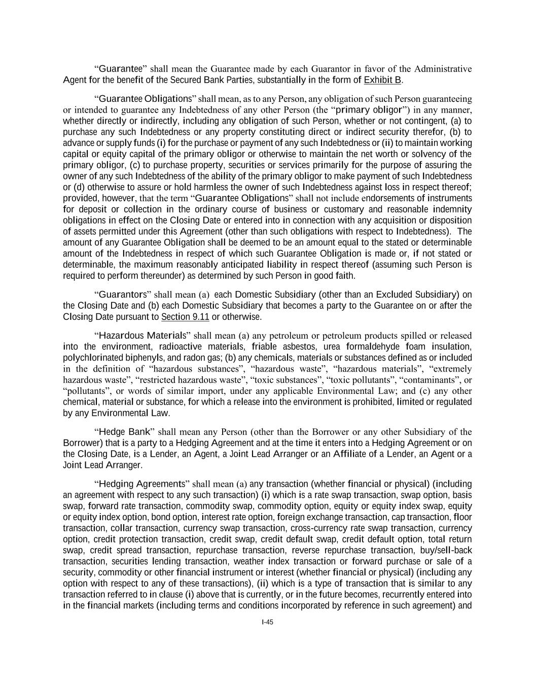 I-45 “Guarantee” shall mean the Guarantee made by each Guarantor in favor of the Administrative Agent for the benefit of the Secured Bank Parties, substantially in the form of Exhibit B. “Guarantee Obligations” shall mean, as to any Person, any obligation of such Person guaranteeing or intended to guarantee any Indebtedness of any other Person (the “primary obligor”) in any manner, whether directly or indirectly, including any obligation of such Person, whether or not contingent, (a) to purchase any such Indebtedness or any property constituting direct or indirect security therefor, (b) to advance or supply funds (i) for the purchase or payment of any such Indebtedness or (ii) to maintain working capital or equity capital of the primary obligor or otherwise to maintain the net worth or solvency of the primary obligor, (c) to purchase property, securities or services primarily for the purpose of assuring the owner of any such Indebtedness of the ability of the primary obligor to make payment of such Indebtedness or (d) otherwise to assure or hold harmless the owner of such Indebtedness against loss in respect thereof; provided, however, that the term “Guarantee Obligations” shall not include endorsements of instruments for deposit or collection in the ordinary course of business or customary and reasonable indemnity obligations in effect on the Closing Date or entered into in connection with any acquisition or disposition of assets permitted under this Agreement (other than such obligations with respect to Indebtedness). The amount of any Guarantee Obligation shall be deemed to be an amount equal to the stated or determinable amount of the Indebtedness in respect of which such Guarantee Obligation is made or, if not stated or determinable, the maximum reasonably anticipated liability in respect thereof (assuming such Person is required to perform thereunder) as determined by such Person in good faith. “Guarantors” shall mean (a) each Domestic Subsidiary (other than an Excluded Subsidiary) on the Closing Date and (b) each Domestic Subsidiary that becomes a party to the Guarantee on or after the Closing Date pursuant to Section 9.11 or otherwise. “Hazardous Materials” shall mean (a) any petroleum or petroleum products spilled or released into the environment, radioactive materials, friable asbestos, urea formaldehyde foam insulation, polychlorinated biphenyls, and radon gas; (b) any chemicals, materials or substances defined as or included in the definition of “hazardous substances”, “hazardous waste”, “hazardous materials”, “extremely hazardous waste”, “restricted hazardous waste”, “toxic substances”, “toxic pollutants”, “contaminants”, or “pollutants”, or words of similar import, under any applicable Environmental Law; and (c) any other chemical, material or substance, for which a release into the environment is prohibited, limited or regulated by any Environmental Law. “Hedge Bank” shall mean any Person (other than the Borrower or any other Subsidiary of the Borrower) that is a party to a Hedging Agreement and at the time it enters into a Hedging Agreement or on the Closing Date, is a Lender, an Agent, a Joint Lead Arranger or an Affiliate of a Lender, an Agent or a Joint Lead Arranger. “Hedging Agreements” shall mean (a) any transaction (whether financial or physical) (including an agreement with respect to any such transaction) (i) which is a rate swap transaction, swap option, basis swap, forward rate transaction, commodity swap, commodity option, equity or equity index swap, equity or equity index option, bond option, interest rate option, foreign exchange transaction, cap transaction, floor transaction, collar transaction, currency swap transaction, cross-currency rate swap transaction, currency option, credit protection transaction, credit swap, credit default swap, credit default option, total return swap, credit spread transaction, repurchase transaction, reverse repurchase transaction, buy/sell-back transaction, securities lending transaction, weather index transaction or forward purchase or sale of a security, commodity or other financial instrument or interest (whether financial or physical) (including any option with respect to any of these transactions), (ii) which is a type of transaction that is similar to any transaction referred to in clause (i) above that is currently, or in the future becomes, recurrently entered into in the financial markets (including terms and conditions incorporated by reference in such agreement) and