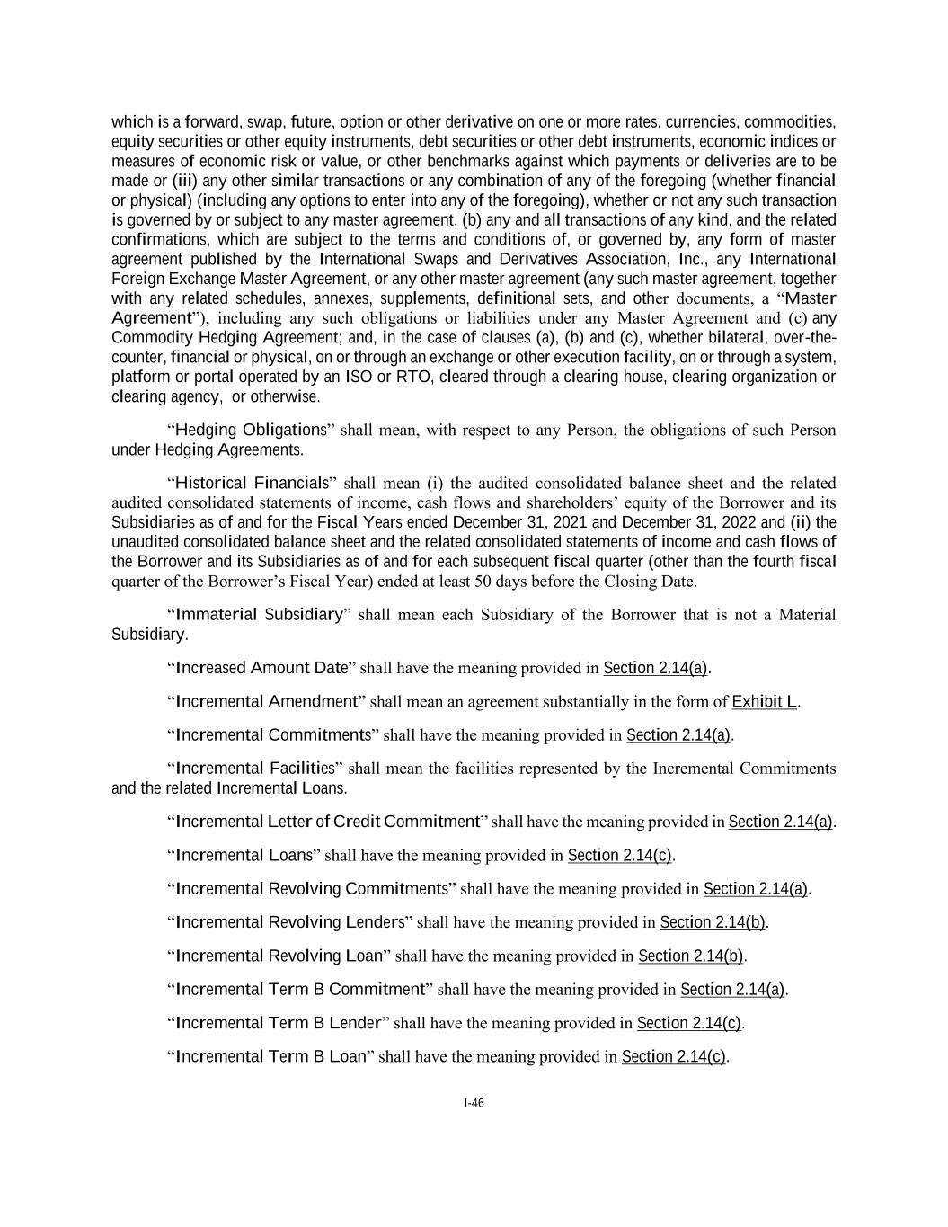 I-46 which is a forward, swap, future, option or other derivative on one or more rates, currencies, commodities, equity securities or other equity instruments, debt securities or other debt instruments, economic indices or measures of economic risk or value, or other benchmarks against which payments or deliveries are to be made or (iii) any other similar transactions or any combination of any of the foregoing (whether financial or physical) (including any options to enter into any of the foregoing), whether or not any such transaction is governed by or subject to any master agreement, (b) any and all transactions of any kind, and the related confirmations, which are subject to the terms and conditions of, or governed by, any form of master agreement published by the International Swaps and Derivatives Association, Inc., any International Foreign Exchange Master Agreement, or any other master agreement (any such master agreement, together with any related schedules, annexes, supplements, definitional sets, and other documents, a “Master Agreement”), including any such obligations or liabilities under any Master Agreement and (c) any Commodity Hedging Agreement; and, in the case of clauses (a), (b) and (c), whether bilateral, over-the- counter, financial or physical, on or through an exchange or other execution facility, on or through a system, platform or portal operated by an ISO or RTO, cleared through a clearing house, clearing organization or clearing agency, or otherwise. “Hedging Obligations” shall mean, with respect to any Person, the obligations of such Person under Hedging Agreements. “Historical Financials” shall mean (i) the audited consolidated balance sheet and the related audited consolidated statements of income, cash flows and shareholders’ equity of the Borrower and its Subsidiaries as of and for the Fiscal Years ended December 31, 2021 and December 31, 2022 and (ii) the unaudited consolidated balance sheet and the related consolidated statements of income and cash flows of the Borrower and its Subsidiaries as of and for each subsequent fiscal quarter (other than the fourth fiscal quarter of the Borrower’s Fiscal Year) ended at least 50 days before the Closing Date. “Immaterial Subsidiary” shall mean each Subsidiary of the Borrower that is not a Material Subsidiary. “Increased Amount Date” shall have the meaning provided in Section 2.14(a). “Incremental Amendment” shall mean an agreement substantially in the form of Exhibit L. “Incremental Commitments” shall have the meaning provided in Section 2.14(a). “Incremental Facilities” shall mean the facilities represented by the Incremental Commitments and the related Incremental Loans. “Incremental Letter of Credit Commitment” shall have the meaning provided in Section 2.14(a). “Incremental Loans” shall have the meaning provided in Section 2.14(c). “Incremental Revolving Commitments” shall have the meaning provided in Section 2.14(a). “Incremental Revolving Lenders” shall have the meaning provided in Section 2.14(b). “Incremental Revolving Loan” shall have the meaning provided in Section 2.14(b). “Incremental Term B Commitment” shall have the meaning provided in Section 2.14(a). “Incremental Term B Lender” shall have the meaning provided in Section 2.14(c). “Incremental Term B Loan” shall have the meaning provided in Section 2.14(c).