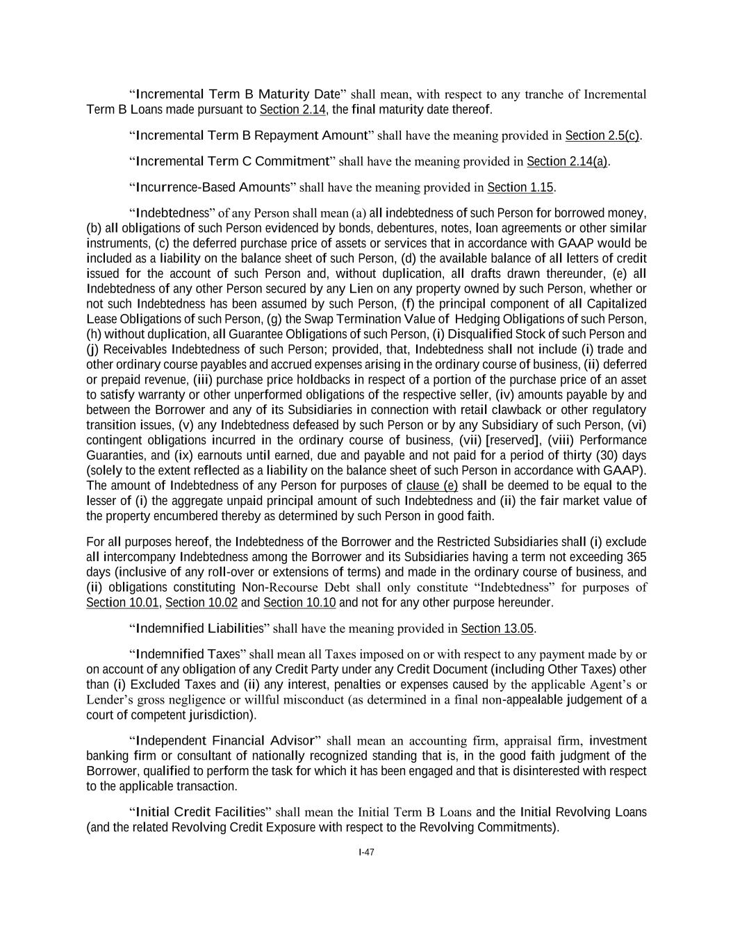 I-47 “Incremental Term B Maturity Date” shall mean, with respect to any tranche of Incremental Term B Loans made pursuant to Section 2.14, the final maturity date thereof. “Incremental Term B Repayment Amount” shall have the meaning provided in Section 2.5(c). “Incremental Term C Commitment” shall have the meaning provided in Section 2.14(a). “Incurrence-Based Amounts” shall have the meaning provided in Section 1.15. “Indebtedness” of any Person shall mean (a) all indebtedness of such Person for borrowed money, (b) all obligations of such Person evidenced by bonds, debentures, notes, loan agreements or other similar instruments, (c) the deferred purchase price of assets or services that in accordance with GAAP would be included as a liability on the balance sheet of such Person, (d) the available balance of all letters of credit issued for the account of such Person and, without duplication, all drafts drawn thereunder, (e) all Indebtedness of any other Person secured by any Lien on any property owned by such Person, whether or not such Indebtedness has been assumed by such Person, (f) the principal component of all Capitalized Lease Obligations of such Person, (g) the Swap Termination Value of Hedging Obligations of such Person, (h) without duplication, all Guarantee Obligations of such Person, (i) Disqualified Stock of such Person and (j) Receivables Indebtedness of such Person; provided, that, Indebtedness shall not include (i) trade and other ordinary course payables and accrued expenses arising in the ordinary course of business, (ii) deferred or prepaid revenue, (iii) purchase price holdbacks in respect of a portion of the purchase price of an asset to satisfy warranty or other unperformed obligations of the respective seller, (iv) amounts payable by and between the Borrower and any of its Subsidiaries in connection with retail clawback or other regulatory transition issues, (v) any Indebtedness defeased by such Person or by any Subsidiary of such Person, (vi) contingent obligations incurred in the ordinary course of business, (vii) [reserved], (viii) Performance Guaranties, and (ix) earnouts until earned, due and payable and not paid for a period of thirty (30) days (solely to the extent reflected as a liability on the balance sheet of such Person in accordance with GAAP). The amount of Indebtedness of any Person for purposes of clause (e) shall be deemed to be equal to the lesser of (i) the aggregate unpaid principal amount of such Indebtedness and (ii) the fair market value of the property encumbered thereby as determined by such Person in good faith. For all purposes hereof, the Indebtedness of the Borrower and the Restricted Subsidiaries shall (i) exclude all intercompany Indebtedness among the Borrower and its Subsidiaries having a term not exceeding 365 days (inclusive of any roll-over or extensions of terms) and made in the ordinary course of business, and (ii) obligations constituting Non-Recourse Debt shall only constitute “Indebtedness” for purposes of Section 10.01, Section 10.02 and Section 10.10 and not for any other purpose hereunder. “Indemnified Liabilities” shall have the meaning provided in Section 13.05. “Indemnified Taxes” shall mean all Taxes imposed on or with respect to any payment made by or on account of any obligation of any Credit Party under any Credit Document (including Other Taxes) other than (i) Excluded Taxes and (ii) any interest, penalties or expenses caused by the applicable Agent’s or Lender’s gross negligence or willful misconduct (as determined in a final non-appealable judgement of a court of competent jurisdiction). “Independent Financial Advisor” shall mean an accounting firm, appraisal firm, investment banking firm or consultant of nationally recognized standing that is, in the good faith judgment of the Borrower, qualified to perform the task for which it has been engaged and that is disinterested with respect to the applicable transaction. “Initial Credit Facilities” shall mean the Initial Term B Loans and the Initial Revolving Loans (and the related Revolving Credit Exposure with respect to the Revolving Commitments).