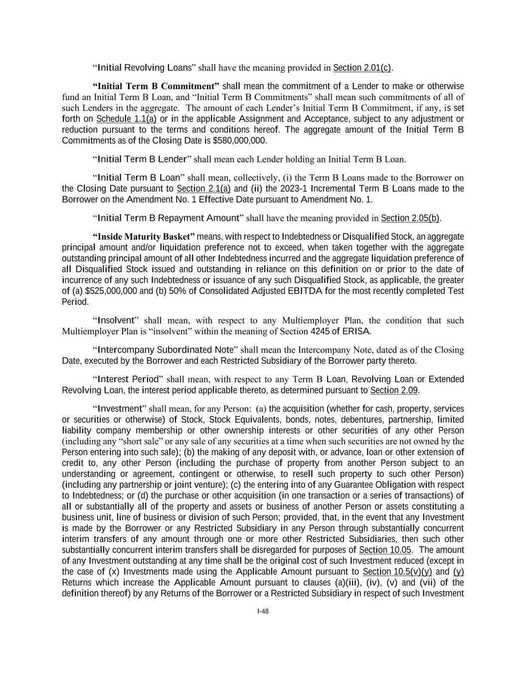 I-48 “Initial Revolving Loans” shall have the meaning provided in Section 2.01(c). “Initial Term B Commitment” shall mean the commitment of a Lender to make or otherwise fund an Initial Term B Loan, and “Initial Term B Commitments” shall mean such commitments of all of such Lenders in the aggregate. The amount of each Lender’s Initial Term B Commitment, if any, is set forth on Schedule 1.1(a) or in the applicable Assignment and Acceptance, subject to any adjustment or reduction pursuant to the terms and conditions hereof. The aggregate amount of the Initial Term B Commitments as of the Closing Date is $580,000,000. “Initial Term B Lender” shall mean each Lender holding an Initial Term B Loan. “Initial Term B Loan” shall mean, collectively, (i) the Term B Loans made to the Borrower on the Closing Date pursuant to Section 2.1(a) and (ii) the 2023-1 Incremental Term B Loans made to the Borrower on the Amendment No. 1 Effective Date pursuant to Amendment No. 1. “Initial Term B Repayment Amount” shall have the meaning provided in Section 2.05(b). “Inside Maturity Basket” means, with respect to Indebtedness or Disqualified Stock, an aggregate principal amount and/or liquidation preference not to exceed, when taken together with the aggregate outstanding principal amount of all other Indebtedness incurred and the aggregate liquidation preference of all Disqualified Stock issued and outstanding in reliance on this definition on or prior to the date of incurrence of any such Indebtedness or issuance of any such Disqualified Stock, as applicable, the greater of (a) $525,000,000 and (b) 50% of Consolidated Adjusted EBITDA for the most recently completed Test Period. “Insolvent” shall mean, with respect to any Multiemployer Plan, the condition that such Multiemployer Plan is “insolvent” within the meaning of Section 4245 of ERISA. “Intercompany Subordinated Note” shall mean the Intercompany Note, dated as of the Closing Date, executed by the Borrower and each Restricted Subsidiary of the Borrower party thereto. “Interest Period” shall mean, with respect to any Term B Loan, Revolving Loan or Extended Revolving Loan, the interest period applicable thereto, as determined pursuant to Section 2.09. “Investment” shall mean, for any Person: (a) the acquisition (whether for cash, property, services or securities or otherwise) of Stock, Stock Equivalents, bonds, notes, debentures, partnership, limited liability company membership or other ownership interests or other securities of any other Person (including any “short sale” or any sale of any securities at a time when such securities are not owned by the Person entering into such sale); (b) the making of any deposit with, or advance, loan or other extension of credit to, any other Person (including the purchase of property from another Person subject to an understanding or agreement, contingent or otherwise, to resell such property to such other Person) (including any partnership or joint venture); (c) the entering into of any Guarantee Obligation with respect to Indebtedness; or (d) the purchase or other acquisition (in one transaction or a series of transactions) of all or substantially all of the property and assets or business of another Person or assets constituting a business unit, line of business or division of such Person; provided, that, in the event that any Investment is made by the Borrower or any Restricted Subsidiary in any Person through substantially concurrent interim transfers of any amount through one or more other Restricted Subsidiaries, then such other substantially concurrent interim transfers shall be disregarded for purposes of Section 10.05. The amount of any Investment outstanding at any time shall be the original cost of such Investment reduced (except in the case of (x) Investments made using the Applicable Amount pursuant to Section 10.5(v)(y) and (y) Returns which increase the Applicable Amount pursuant to clauses (a)(iii), (iv), (v) and (vii) of the definition thereof) by any Returns of the Borrower or a Restricted Subsidiary in respect of such Investment