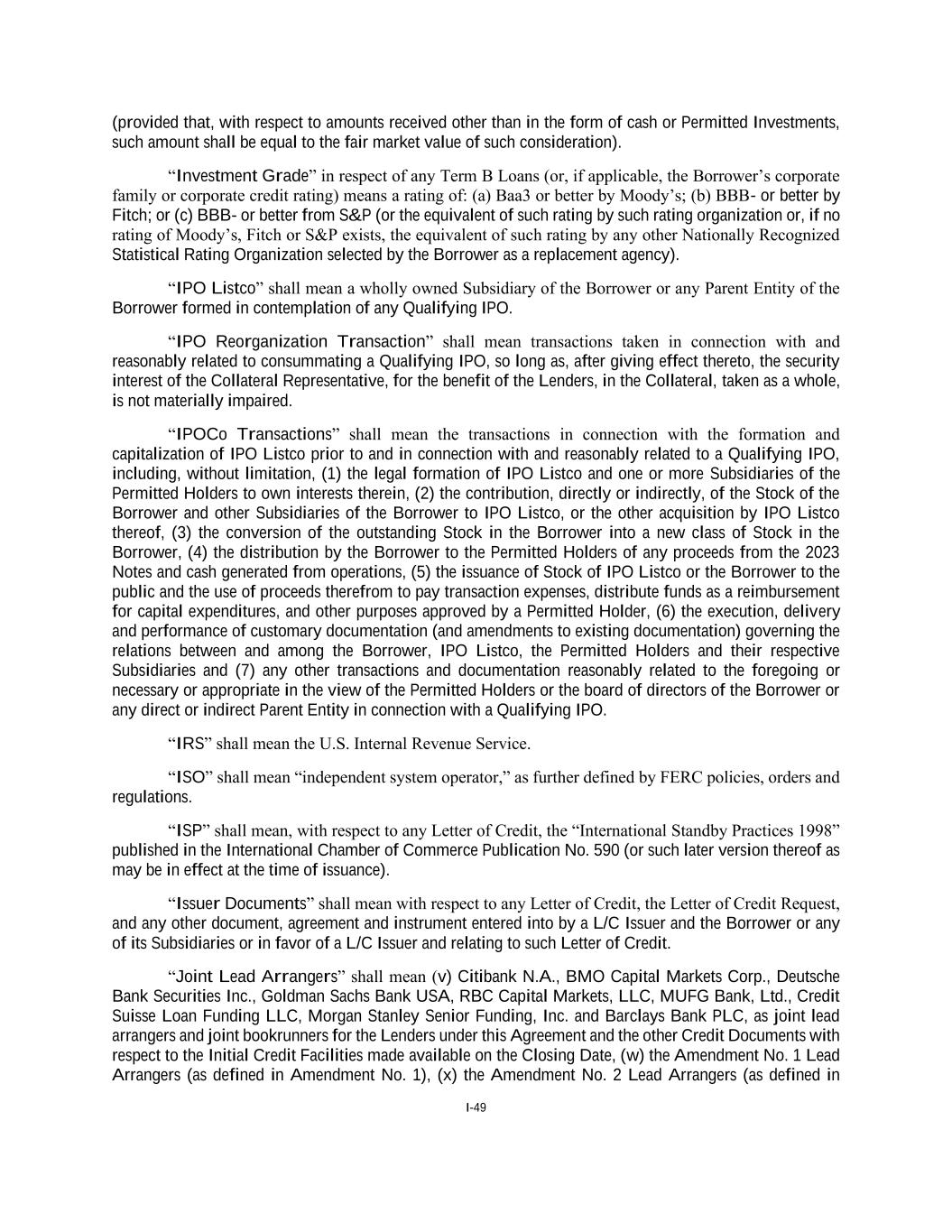 I-49 (provided that, with respect to amounts received other than in the form of cash or Permitted Investments, such amount shall be equal to the fair market value of such consideration). “Investment Grade” in respect of any Term B Loans (or, if applicable, the Borrower’s corporate family or corporate credit rating) means a rating of: (a) Baa3 or better by Moody’s; (b) BBB- or better by Fitch; or (c) BBB- or better from S&P (or the equivalent of such rating by such rating organization or, if no rating of Moody’s, Fitch or S&P exists, the equivalent of such rating by any other Nationally Recognized Statistical Rating Organization selected by the Borrower as a replacement agency). “IPO Listco” shall mean a wholly owned Subsidiary of the Borrower or any Parent Entity of the Borrower formed in contemplation of any Qualifying IPO. “IPO Reorganization Transaction” shall mean transactions taken in connection with and reasonably related to consummating a Qualifying IPO, so long as, after giving effect thereto, the security interest of the Collateral Representative, for the benefit of the Lenders, in the Collateral, taken as a whole, is not materially impaired. “IPOCo Transactions” shall mean the transactions in connection with the formation and capitalization of IPO Listco prior to and in connection with and reasonably related to a Qualifying IPO, including, without limitation, (1) the legal formation of IPO Listco and one or more Subsidiaries of the Permitted Holders to own interests therein, (2) the contribution, directly or indirectly, of the Stock of the Borrower and other Subsidiaries of the Borrower to IPO Listco, or the other acquisition by IPO Listco thereof, (3) the conversion of the outstanding Stock in the Borrower into a new class of Stock in the Borrower, (4) the distribution by the Borrower to the Permitted Holders of any proceeds from the 2023 Notes and cash generated from operations, (5) the issuance of Stock of IPO Listco or the Borrower to the public and the use of proceeds therefrom to pay transaction expenses, distribute funds as a reimbursement for capital expenditures, and other purposes approved by a Permitted Holder, (6) the execution, delivery and performance of customary documentation (and amendments to existing documentation) governing the relations between and among the Borrower, IPO Listco, the Permitted Holders and their respective Subsidiaries and (7) any other transactions and documentation reasonably related to the foregoing or necessary or appropriate in the view of the Permitted Holders or the board of directors of the Borrower or any direct or indirect Parent Entity in connection with a Qualifying IPO. “IRS” shall mean the U.S. Internal Revenue Service. “ISO” shall mean “independent system operator,” as further defined by FERC policies, orders and regulations. “ISP” shall mean, with respect to any Letter of Credit, the “International Standby Practices 1998” published in the International Chamber of Commerce Publication No. 590 (or such later version thereof as may be in effect at the time of issuance). “Issuer Documents” shall mean with respect to any Letter of Credit, the Letter of Credit Request, and any other document, agreement and instrument entered into by a L/C Issuer and the Borrower or any of its Subsidiaries or in favor of a L/C Issuer and relating to such Letter of Credit. “Joint Lead Arrangers” shall mean (v) Citibank N.A., BMO Capital Markets Corp., Deutsche Bank Securities Inc., Goldman Sachs Bank USA, RBC Capital Markets, LLC, MUFG Bank, Ltd., Credit Suisse Loan Funding LLC, Morgan Stanley Senior Funding, Inc. and Barclays Bank PLC, as joint lead arrangers and joint bookrunners for the Lenders under this Agreement and the other Credit Documents with respect to the Initial Credit Facilities made available on the Closing Date, (w) the Amendment No. 1 Lead Arrangers (as defined in Amendment No. 1), (x) the Amendment No. 2 Lead Arrangers (as defined in