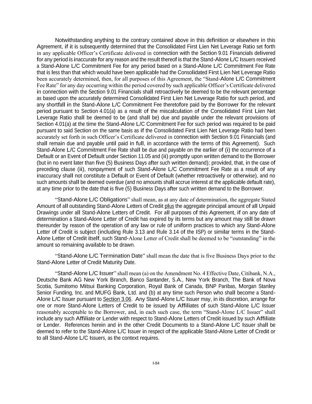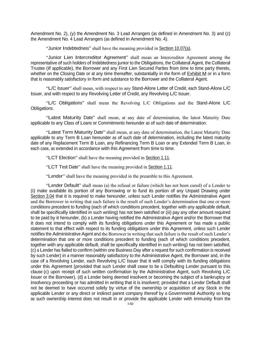 I-50 Amendment No. 2), (y) the Amendment No. 3 Lead Arrangers (as defined in Amendment No. 3) and (z) the Amendment No. 4 Lead Arrangers (as defined in Amendment No. 4). “Junior Indebtedness” shall have the meaning provided in Section 10.07(a). “Junior Lien Intercreditor Agreement” shall mean an Intercreditor Agreement among the representative of such holders of Indebtedness junior to the Obligations, the Collateral Agent, the Collateral Trustee (if applicable), the Borrower and any First Lien Secured Parties from time to time party thereto, whether on the Closing Date or at any time thereafter, substantially in the form of Exhibit M or in a form that is reasonably satisfactory in form and substance to the Borrower and the Collateral Agent. “L/C Issuer” shall mean, with respect to any Stand-Alone Letter of Credit, each Stand-Alone L/C Issuer, and with respect to any Revolving Letter of Credit, any Revolving L/C Issuer. “L/C Obligations” shall mean the Revolving L/C Obligations and the Stand-Alone L/C Obligations. “Latest Maturity Date” shall mean, at any date of determination, the latest Maturity Date applicable to any Class of Loans or Commitments hereunder as of such date of determination. “Latest Term Maturity Date” shall mean, at any date of determination, the Latest Maturity Date applicable to any Term B Loan hereunder as of such date of determination, including the latest maturity date of any Replacement Term B Loan, any Refinancing Term B Loan or any Extended Term B Loan, in each case, as extended in accordance with this Agreement from time to time. “LCT Election” shall have the meaning provided in Section 1.11. “LCT Test Date” shall have the meaning provided in Section 1.11. “Lender” shall have the meaning provided in the preamble to this Agreement. “Lender Default” shall mean (a) the refusal or failure (which has not been cured) of a Lender to (i) make available its portion of any Borrowing or to fund its portion of any Unpaid Drawing under Section 3.04 that it is required to make hereunder, unless such Lender notifies the Administrative Agent and the Borrower in writing that such failure is the result of such Lender’s determination that one or more conditions precedent to funding (each of which conditions precedent, together with any applicable default, shall be specifically identified in such writing) has not been satisfied or (ii) pay any other amount required to be paid by it hereunder, (b) a Lender having notified the Administrative Agent and/or the Borrower that it does not intend to comply with its funding obligations under this Agreement or has made a public statement to that effect with respect to its funding obligations under this Agreement, unless such Lender notifies the Administrative Agent and the Borrower in writing that such failure is the result of such Lender’s determination that one or more conditions precedent to funding (each of which conditions precedent, together with any applicable default, shall be specifically identified in such writing) has not been satisfied, (c) a Lender has failed to confirm (within one Business Day after a request for such confirmation is received by such Lender) in a manner reasonably satisfactory to the Administrative Agent, the Borrower and, in the case of a Revolving Lender, each Revolving L/C Issuer that it will comply with its funding obligations under this Agreement (provided that such Lender shall cease to be a Defaulting Lender pursuant to this clause (c) upon receipt of such written confirmation by the Administrative Agent, such Revolving L/C Issuer or the Borrower), (d) a Lender being deemed insolvent or becoming the subject of a bankruptcy or insolvency proceeding or has admitted in writing that it is insolvent; provided that a Lender Default shall not be deemed to have occurred solely by virtue of the ownership or acquisition of any Stock in the applicable Lender or any direct or indirect parent company thereof by a Governmental Authority so long as such ownership interest does not result in or provide the applicable Lender with immunity from the
