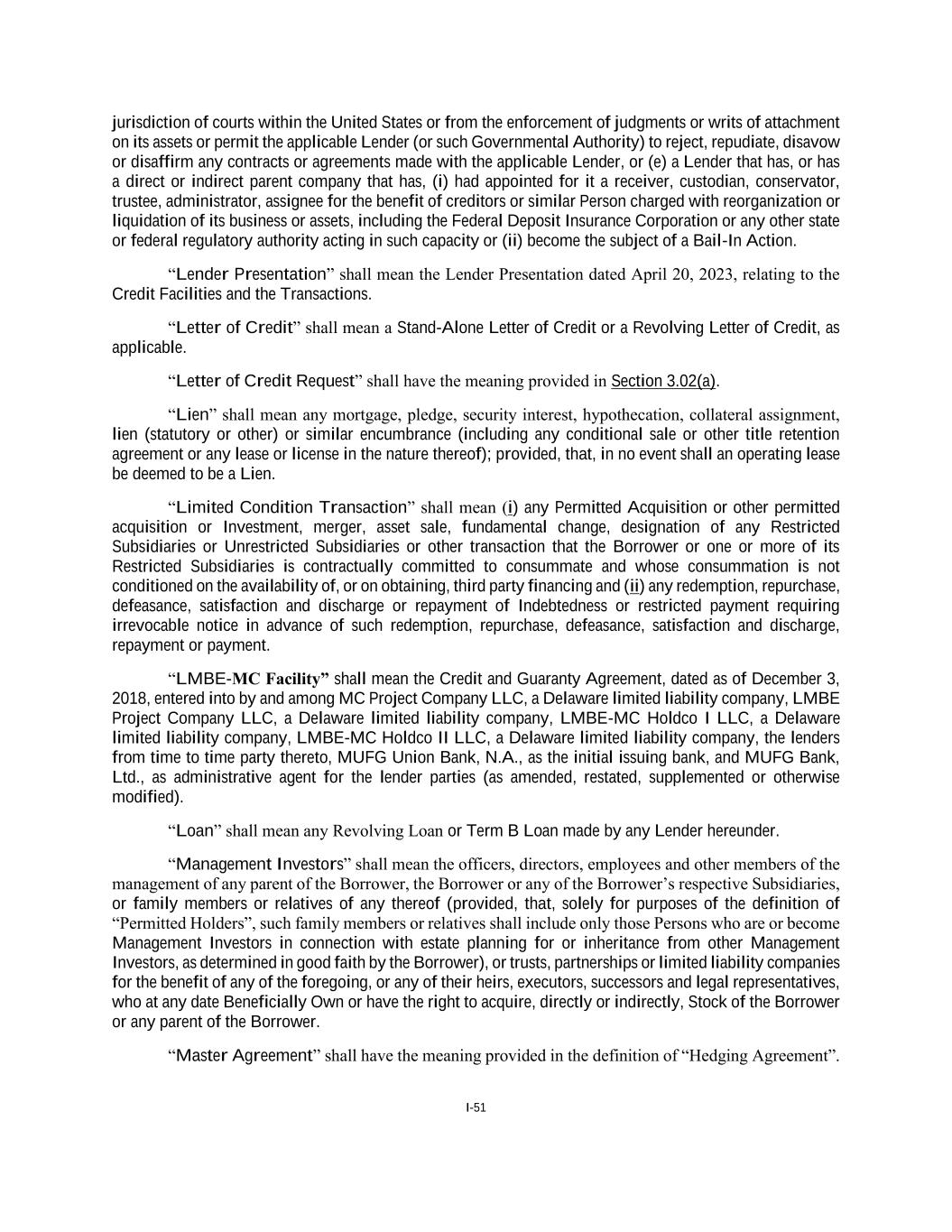 I-51 jurisdiction of courts within the United States or from the enforcement of judgments or writs of attachment on its assets or permit the applicable Lender (or such Governmental Authority) to reject, repudiate, disavow or disaffirm any contracts or agreements made with the applicable Lender, or (e) a Lender that has, or has a direct or indirect parent company that has, (i) had appointed for it a receiver, custodian, conservator, trustee, administrator, assignee for the benefit of creditors or similar Person charged with reorganization or liquidation of its business or assets, including the Federal Deposit Insurance Corporation or any other state or federal regulatory authority acting in such capacity or (ii) become the subject of a Bail-In Action. “Lender Presentation” shall mean the Lender Presentation dated April 20, 2023, relating to the Credit Facilities and the Transactions. “Letter of Credit” shall mean a Stand-Alone Letter of Credit or a Revolving Letter of Credit, as applicable. “Letter of Credit Request” shall have the meaning provided in Section 3.02(a). “Lien” shall mean any mortgage, pledge, security interest, hypothecation, collateral assignment, lien (statutory or other) or similar encumbrance (including any conditional sale or other title retention agreement or any lease or license in the nature thereof); provided, that, in no event shall an operating lease be deemed to be a Lien. “Limited Condition Transaction” shall mean (i) any Permitted Acquisition or other permitted acquisition or Investment, merger, asset sale, fundamental change, designation of any Restricted Subsidiaries or Unrestricted Subsidiaries or other transaction that the Borrower or one or more of its Restricted Subsidiaries is contractually committed to consummate and whose consummation is not conditioned on the availability of, or on obtaining, third party financing and (ii) any redemption, repurchase, defeasance, satisfaction and discharge or repayment of Indebtedness or restricted payment requiring irrevocable notice in advance of such redemption, repurchase, defeasance, satisfaction and discharge, repayment or payment. “LMBE-MC Facility” shall mean the Credit and Guaranty Agreement, dated as of December 3, 2018, entered into by and among MC Project Company LLC, a Delaware limited liability company, LMBE Project Company LLC, a Delaware limited liability company, LMBE-MC Holdco I LLC, a Delaware limited liability company, LMBE-MC Holdco II LLC, a Delaware limited liability company, the lenders from time to time party thereto, MUFG Union Bank, N.A., as the initial issuing bank, and MUFG Bank, Ltd., as administrative agent for the lender parties (as amended, restated, supplemented or otherwise modified). “Loan” shall mean any Revolving Loan or Term B Loan made by any Lender hereunder. “Management Investors” shall mean the officers, directors, employees and other members of the management of any parent of the Borrower, the Borrower or any of the Borrower’s respective Subsidiaries, or family members or relatives of any thereof (provided, that, solely for purposes of the definition of “Permitted Holders”, such family members or relatives shall include only those Persons who are or become Management Investors in connection with estate planning for or inheritance from other Management Investors, as determined in good faith by the Borrower), or trusts, partnerships or limited liability companies for the benefit of any of the foregoing, or any of their heirs, executors, successors and legal representatives, who at any date Beneficially Own or have the right to acquire, directly or indirectly, Stock of the Borrower or any parent of the Borrower. “Master Agreement” shall have the meaning provided in the definition of “Hedging Agreement”.