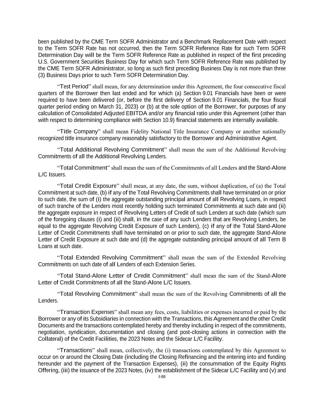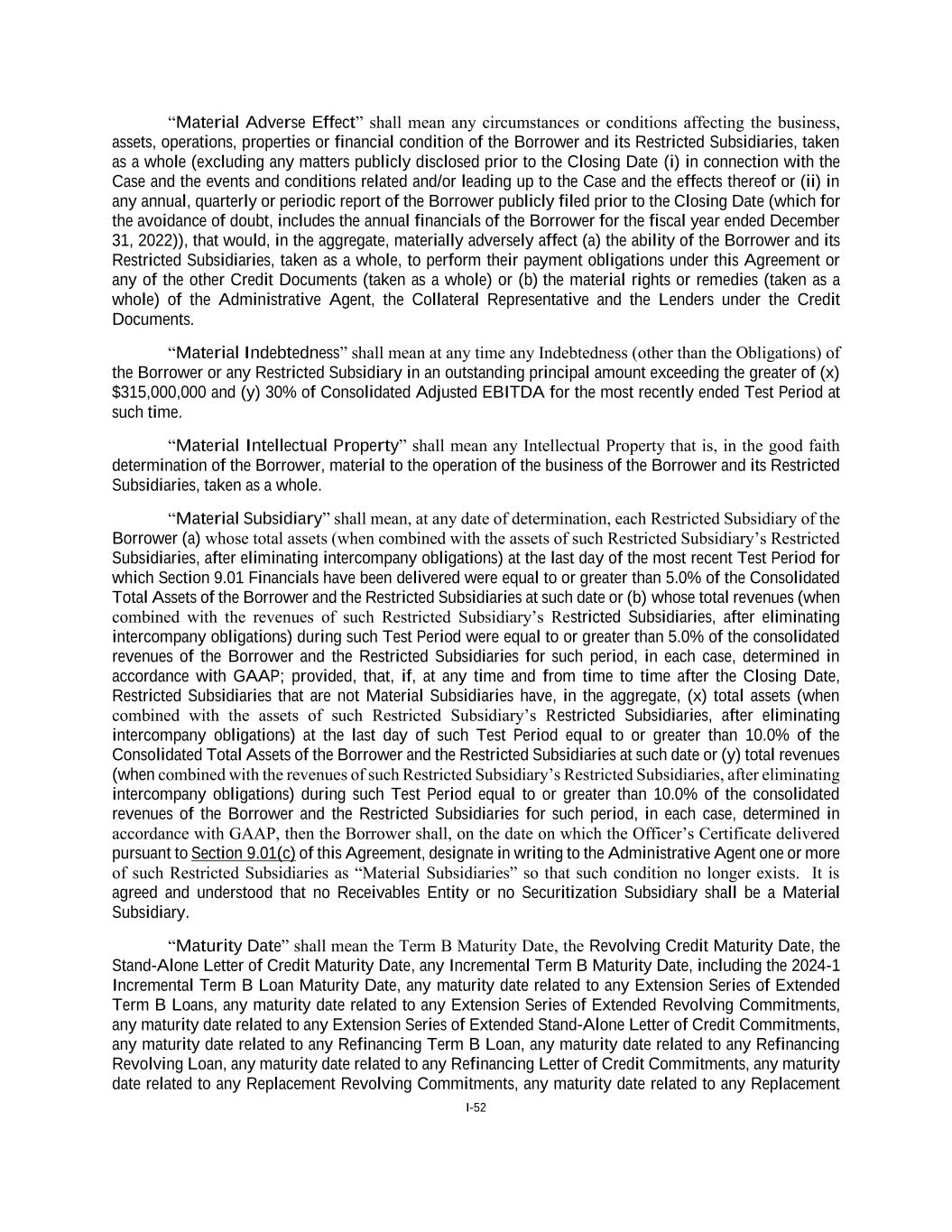 I-52 “Material Adverse Effect” shall mean any circumstances or conditions affecting the business, assets, operations, properties or financial condition of the Borrower and its Restricted Subsidiaries, taken as a whole (excluding any matters publicly disclosed prior to the Closing Date (i) in connection with the Case and the events and conditions related and/or leading up to the Case and the effects thereof or (ii) in any annual, quarterly or periodic report of the Borrower publicly filed prior to the Closing Date (which for the avoidance of doubt, includes the annual financials of the Borrower for the fiscal year ended December 31, 2022)), that would, in the aggregate, materially adversely affect (a) the ability of the Borrower and its Restricted Subsidiaries, taken as a whole, to perform their payment obligations under this Agreement or any of the other Credit Documents (taken as a whole) or (b) the material rights or remedies (taken as a whole) of the Administrative Agent, the Collateral Representative and the Lenders under the Credit Documents. “Material Indebtedness” shall mean at any time any Indebtedness (other than the Obligations) of the Borrower or any Restricted Subsidiary in an outstanding principal amount exceeding the greater of (x) $315,000,000 and (y) 30% of Consolidated Adjusted EBITDA for the most recently ended Test Period at such time. “Material Intellectual Property” shall mean any Intellectual Property that is, in the good faith determination of the Borrower, material to the operation of the business of the Borrower and its Restricted Subsidiaries, taken as a whole. “Material Subsidiary” shall mean, at any date of determination, each Restricted Subsidiary of the Borrower (a) whose total assets (when combined with the assets of such Restricted Subsidiary’s Restricted Subsidiaries, after eliminating intercompany obligations) at the last day of the most recent Test Period for which Section 9.01 Financials have been delivered were equal to or greater than 5.0% of the Consolidated Total Assets of the Borrower and the Restricted Subsidiaries at such date or (b) whose total revenues (when combined with the revenues of such Restricted Subsidiary’s Restricted Subsidiaries, after eliminating intercompany obligations) during such Test Period were equal to or greater than 5.0% of the consolidated revenues of the Borrower and the Restricted Subsidiaries for such period, in each case, determined in accordance with GAAP; provided, that, if, at any time and from time to time after the Closing Date, Restricted Subsidiaries that are not Material Subsidiaries have, in the aggregate, (x) total assets (when combined with the assets of such Restricted Subsidiary’s Restricted Subsidiaries, after eliminating intercompany obligations) at the last day of such Test Period equal to or greater than 10.0% of the Consolidated Total Assets of the Borrower and the Restricted Subsidiaries at such date or (y) total revenues (when combined with the revenues of such Restricted Subsidiary’s Restricted Subsidiaries, after eliminating intercompany obligations) during such Test Period equal to or greater than 10.0% of the consolidated revenues of the Borrower and the Restricted Subsidiaries for such period, in each case, determined in accordance with GAAP, then the Borrower shall, on the date on which the Officer’s Certificate delivered pursuant to Section 9.01(c) of this Agreement, designate in writing to the Administrative Agent one or more of such Restricted Subsidiaries as “Material Subsidiaries” so that such condition no longer exists. It is agreed and understood that no Receivables Entity or no Securitization Subsidiary shall be a Material Subsidiary. “Maturity Date” shall mean the Term B Maturity Date, the Revolving Credit Maturity Date, the Stand-Alone Letter of Credit Maturity Date, any Incremental Term B Maturity Date, including the 2024-1 Incremental Term B Loan Maturity Date, any maturity date related to any Extension Series of Extended Term B Loans, any maturity date related to any Extension Series of Extended Revolving Commitments, any maturity date related to any Extension Series of Extended Stand-Alone Letter of Credit Commitments, any maturity date related to any Refinancing Term B Loan, any maturity date related to any Refinancing Revolving Loan, any maturity date related to any Refinancing Letter of Credit Commitments, any maturity date related to any Replacement Revolving Commitments, any maturity date related to any Replacement