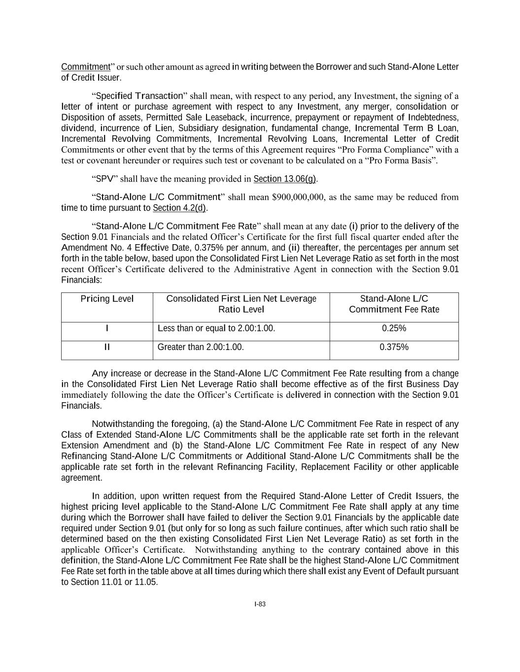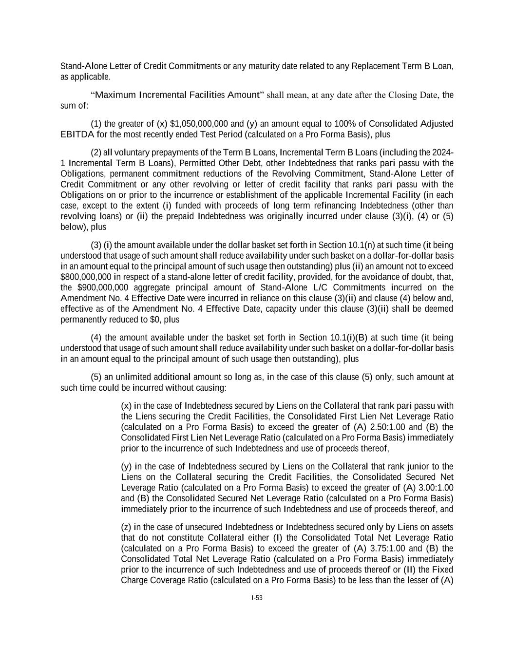 I-53 Stand-Alone Letter of Credit Commitments or any maturity date related to any Replacement Term B Loan, as applicable. “Maximum Incremental Facilities Amount” shall mean, at any date after the Closing Date, the sum of: (1) the greater of (x) $1,050,000,000 and (y) an amount equal to 100% of Consolidated Adjusted EBITDA for the most recently ended Test Period (calculated on a Pro Forma Basis), plus (2) all voluntary prepayments of the Term B Loans, Incremental Term B Loans (including the 2024- 1 Incremental Term B Loans), Permitted Other Debt, other Indebtedness that ranks pari passu with the Obligations, permanent commitment reductions of the Revolving Commitment, Stand-Alone Letter of Credit Commitment or any other revolving or letter of credit facility that ranks pari passu with the Obligations on or prior to the incurrence or establishment of the applicable Incremental Facility (in each case, except to the extent (i) funded with proceeds of long term refinancing Indebtedness (other than revolving loans) or (ii) the prepaid Indebtedness was originally incurred under clause (3)(i), (4) or (5) below), plus (3) (i) the amount available under the dollar basket set forth in Section 10.1(n) at such time (it being understood that usage of such amount shall reduce availability under such basket on a dollar-for-dollar basis in an amount equal to the principal amount of such usage then outstanding) plus (ii) an amount not to exceed $800,000,000 in respect of a stand-alone letter of credit facility, provided, for the avoidance of doubt, that, the $900,000,000 aggregate principal amount of Stand-Alone L/C Commitments incurred on the Amendment No. 4 Effective Date were incurred in reliance on this clause (3)(ii) and clause (4) below and, effective as of the Amendment No. 4 Effective Date, capacity under this clause (3)(ii) shall be deemed permanently reduced to $0, plus (4) the amount available under the basket set forth in Section 10.1(i)(B) at such time (it being understood that usage of such amount shall reduce availability under such basket on a dollar-for-dollar basis in an amount equal to the principal amount of such usage then outstanding), plus (5) an unlimited additional amount so long as, in the case of this clause (5) only, such amount at such time could be incurred without causing: (x) in the case of Indebtedness secured by Liens on the Collateral that rank pari passu with the Liens securing the Credit Facilities, the Consolidated First Lien Net Leverage Ratio (calculated on a Pro Forma Basis) to exceed the greater of (A) 2.50:1.00 and (B) the Consolidated First Lien Net Leverage Ratio (calculated on a Pro Forma Basis) immediately prior to the incurrence of such Indebtedness and use of proceeds thereof, (y) in the case of Indebtedness secured by Liens on the Collateral that rank junior to the Liens on the Collateral securing the Credit Facilities, the Consolidated Secured Net Leverage Ratio (calculated on a Pro Forma Basis) to exceed the greater of (A) 3.00:1.00 and (B) the Consolidated Secured Net Leverage Ratio (calculated on a Pro Forma Basis) immediately prior to the incurrence of such Indebtedness and use of proceeds thereof, and (z) in the case of unsecured Indebtedness or Indebtedness secured only by Liens on assets that do not constitute Collateral either (I) the Consolidated Total Net Leverage Ratio (calculated on a Pro Forma Basis) to exceed the greater of (A) 3.75:1.00 and (B) the Consolidated Total Net Leverage Ratio (calculated on a Pro Forma Basis) immediately prior to the incurrence of such Indebtedness and use of proceeds thereof or (II) the Fixed Charge Coverage Ratio (calculated on a Pro Forma Basis) to be less than the lesser of (A)
