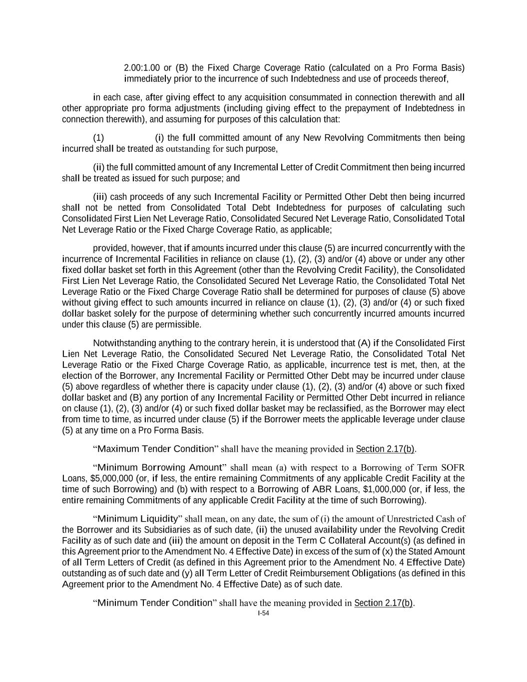 I-54 2.00:1.00 or (B) the Fixed Charge Coverage Ratio (calculated on a Pro Forma Basis) immediately prior to the incurrence of such Indebtedness and use of proceeds thereof, in each case, after giving effect to any acquisition consummated in connection therewith and all other appropriate pro forma adjustments (including giving effect to the prepayment of Indebtedness in connection therewith), and assuming for purposes of this calculation that: (1) (i) the full committed amount of any New Revolving Commitments then being incurred shall be treated as outstanding for such purpose, (ii) the full committed amount of any Incremental Letter of Credit Commitment then being incurred shall be treated as issued for such purpose; and (iii) cash proceeds of any such Incremental Facility or Permitted Other Debt then being incurred shall not be netted from Consolidated Total Debt Indebtedness for purposes of calculating such Consolidated First Lien Net Leverage Ratio, Consolidated Secured Net Leverage Ratio, Consolidated Total Net Leverage Ratio or the Fixed Charge Coverage Ratio, as applicable; provided, however, that if amounts incurred under this clause (5) are incurred concurrently with the incurrence of Incremental Facilities in reliance on clause (1), (2), (3) and/or (4) above or under any other fixed dollar basket set forth in this Agreement (other than the Revolving Credit Facility), the Consolidated First Lien Net Leverage Ratio, the Consolidated Secured Net Leverage Ratio, the Consolidated Total Net Leverage Ratio or the Fixed Charge Coverage Ratio shall be determined for purposes of clause (5) above without giving effect to such amounts incurred in reliance on clause (1), (2), (3) and/or (4) or such fixed dollar basket solely for the purpose of determining whether such concurrently incurred amounts incurred under this clause (5) are permissible. Notwithstanding anything to the contrary herein, it is understood that (A) if the Consolidated First Lien Net Leverage Ratio, the Consolidated Secured Net Leverage Ratio, the Consolidated Total Net Leverage Ratio or the Fixed Charge Coverage Ratio, as applicable, incurrence test is met, then, at the election of the Borrower, any Incremental Facility or Permitted Other Debt may be incurred under clause (5) above regardless of whether there is capacity under clause (1), (2), (3) and/or (4) above or such fixed dollar basket and (B) any portion of any Incremental Facility or Permitted Other Debt incurred in reliance on clause (1), (2), (3) and/or (4) or such fixed dollar basket may be reclassified, as the Borrower may elect from time to time, as incurred under clause (5) if the Borrower meets the applicable leverage under clause (5) at any time on a Pro Forma Basis. “Maximum Tender Condition” shall have the meaning provided in Section 2.17(b). “Minimum Borrowing Amount” shall mean (a) with respect to a Borrowing of Term SOFR Loans, $5,000,000 (or, if less, the entire remaining Commitments of any applicable Credit Facility at the time of such Borrowing) and (b) with respect to a Borrowing of ABR Loans, $1,000,000 (or, if less, the entire remaining Commitments of any applicable Credit Facility at the time of such Borrowing). “Minimum Liquidity” shall mean, on any date, the sum of (i) the amount of Unrestricted Cash of the Borrower and its Subsidiaries as of such date, (ii) the unused availability under the Revolving Credit Facility as of such date and (iii) the amount on deposit in the Term C Collateral Account(s) (as defined in this Agreement prior to the Amendment No. 4 Effective Date) in excess of the sum of (x) the Stated Amount of all Term Letters of Credit (as defined in this Agreement prior to the Amendment No. 4 Effective Date) outstanding as of such date and (y) all Term Letter of Credit Reimbursement Obligations (as defined in this Agreement prior to the Amendment No. 4 Effective Date) as of such date. “Minimum Tender Condition” shall have the meaning provided in Section 2.17(b).