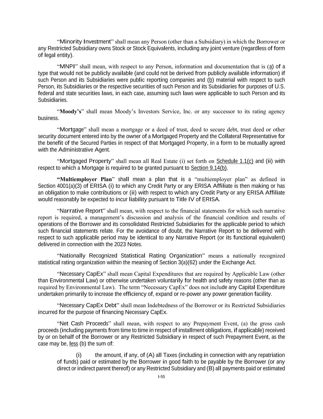 I-55 “Minority Investment” shall mean any Person (other than a Subsidiary) in which the Borrower or any Restricted Subsidiary owns Stock or Stock Equivalents, including any joint venture (regardless of form of legal entity). “MNPI” shall mean, with respect to any Person, information and documentation that is (a) of a type that would not be publicly available (and could not be derived from publicly available information) if such Person and its Subsidiaries were public reporting companies and (b) material with respect to such Person, its Subsidiaries or the respective securities of such Person and its Subsidiaries for purposes of U.S. federal and state securities laws, in each case, assuming such laws were applicable to such Person and its Subsidiaries. “Moody’s” shall mean Moody’s Investors Service, Inc. or any successor to its rating agency business. “Mortgage” shall mean a mortgage or a deed of trust, deed to secure debt, trust deed or other security document entered into by the owner of a Mortgaged Property and the Collateral Representative for the benefit of the Secured Parties in respect of that Mortgaged Property, in a form to be mutually agreed with the Administrative Agent. “Mortgaged Property” shall mean all Real Estate (i) set forth on Schedule 1.1(c) and (ii) with respect to which a Mortgage is required to be granted pursuant to Section 9.14(b). “Multiemployer Plan” shall mean a plan that is a “multiemployer plan” as defined in Section 4001(a)(3) of ERISA (i) to which any Credit Party or any ERISA Affiliate is then making or has an obligation to make contributions or (ii) with respect to which any Credit Party or any ERISA Affiliate would reasonably be expected to incur liability pursuant to Title IV of ERISA. “Narrative Report” shall mean, with respect to the financial statements for which such narrative report is required, a management’s discussion and analysis of the financial condition and results of operations of the Borrower and its consolidated Restricted Subsidiaries for the applicable period to which such financial statements relate. For the avoidance of doubt, the Narrative Report to be delivered with respect to such applicable period may be identical to any Narrative Report (or its functional equivalent) delivered in connection with the 2023 Notes. “Nationally Recognized Statistical Rating Organization” means a nationally recognized statistical rating organization within the meaning of Section 3(a)(62) under the Exchange Act. “Necessary CapEx” shall mean Capital Expenditures that are required by Applicable Law (other than Environmental Law) or otherwise undertaken voluntarily for health and safety reasons (other than as required by Environmental Law). The term “Necessary CapEx” does not include any Capital Expenditure undertaken primarily to increase the efficiency of, expand or re-power any power generation facility. “Necessary CapEx Debt” shall mean Indebtedness of the Borrower or its Restricted Subsidiaries incurred for the purpose of financing Necessary CapEx. “Net Cash Proceeds” shall mean, with respect to any Prepayment Event, (a) the gross cash proceeds (including payments from time to time in respect of installment obligations, if applicable) received by or on behalf of the Borrower or any Restricted Subsidiary in respect of such Prepayment Event, as the case may be, less (b) the sum of: (i) the amount, if any, of (A) all Taxes (including in connection with any repatriation of funds) paid or estimated by the Borrower in good faith to be payable by the Borrower (or any direct or indirect parent thereof) or any Restricted Subsidiary and (B) all payments paid or estimated