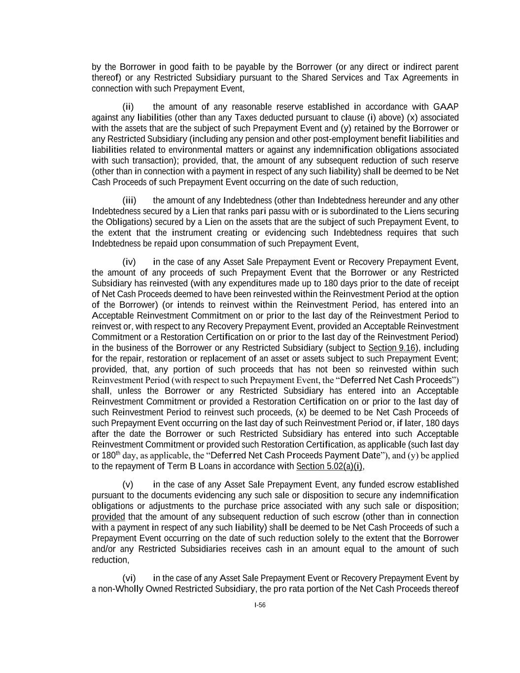 I-56 by the Borrower in good faith to be payable by the Borrower (or any direct or indirect parent thereof) or any Restricted Subsidiary pursuant to the Shared Services and Tax Agreements in connection with such Prepayment Event, (ii) the amount of any reasonable reserve established in accordance with GAAP against any liabilities (other than any Taxes deducted pursuant to clause (i) above) (x) associated with the assets that are the subject of such Prepayment Event and (y) retained by the Borrower or any Restricted Subsidiary (including any pension and other post-employment benefit liabilities and liabilities related to environmental matters or against any indemnification obligations associated with such transaction); provided, that, the amount of any subsequent reduction of such reserve (other than in connection with a payment in respect of any such liability) shall be deemed to be Net Cash Proceeds of such Prepayment Event occurring on the date of such reduction, (iii) the amount of any Indebtedness (other than Indebtedness hereunder and any other Indebtedness secured by a Lien that ranks pari passu with or is subordinated to the Liens securing the Obligations) secured by a Lien on the assets that are the subject of such Prepayment Event, to the extent that the instrument creating or evidencing such Indebtedness requires that such Indebtedness be repaid upon consummation of such Prepayment Event, (iv) in the case of any Asset Sale Prepayment Event or Recovery Prepayment Event, the amount of any proceeds of such Prepayment Event that the Borrower or any Restricted Subsidiary has reinvested (with any expenditures made up to 180 days prior to the date of receipt of Net Cash Proceeds deemed to have been reinvested within the Reinvestment Period at the option of the Borrower) (or intends to reinvest within the Reinvestment Period, has entered into an Acceptable Reinvestment Commitment on or prior to the last day of the Reinvestment Period to reinvest or, with respect to any Recovery Prepayment Event, provided an Acceptable Reinvestment Commitment or a Restoration Certification on or prior to the last day of the Reinvestment Period) in the business of the Borrower or any Restricted Subsidiary (subject to Section 9.16), including for the repair, restoration or replacement of an asset or assets subject to such Prepayment Event; provided, that, any portion of such proceeds that has not been so reinvested within such Reinvestment Period (with respect to such Prepayment Event, the “Deferred Net Cash Proceeds”) shall, unless the Borrower or any Restricted Subsidiary has entered into an Acceptable Reinvestment Commitment or provided a Restoration Certification on or prior to the last day of such Reinvestment Period to reinvest such proceeds, (x) be deemed to be Net Cash Proceeds of such Prepayment Event occurring on the last day of such Reinvestment Period or, if later, 180 days after the date the Borrower or such Restricted Subsidiary has entered into such Acceptable Reinvestment Commitment or provided such Restoration Certification, as applicable (such last day or 180th day, as applicable, the “Deferred Net Cash Proceeds Payment Date”), and (y) be applied to the repayment of Term B Loans in accordance with Section 5.02(a)(i), (v) in the case of any Asset Sale Prepayment Event, any funded escrow established pursuant to the documents evidencing any such sale or disposition to secure any indemnification obligations or adjustments to the purchase price associated with any such sale or disposition; provided that the amount of any subsequent reduction of such escrow (other than in connection with a payment in respect of any such liability) shall be deemed to be Net Cash Proceeds of such a Prepayment Event occurring on the date of such reduction solely to the extent that the Borrower and/or any Restricted Subsidiaries receives cash in an amount equal to the amount of such reduction, (vi) in the case of any Asset Sale Prepayment Event or Recovery Prepayment Event by a non-Wholly Owned Restricted Subsidiary, the pro rata portion of the Net Cash Proceeds thereof
