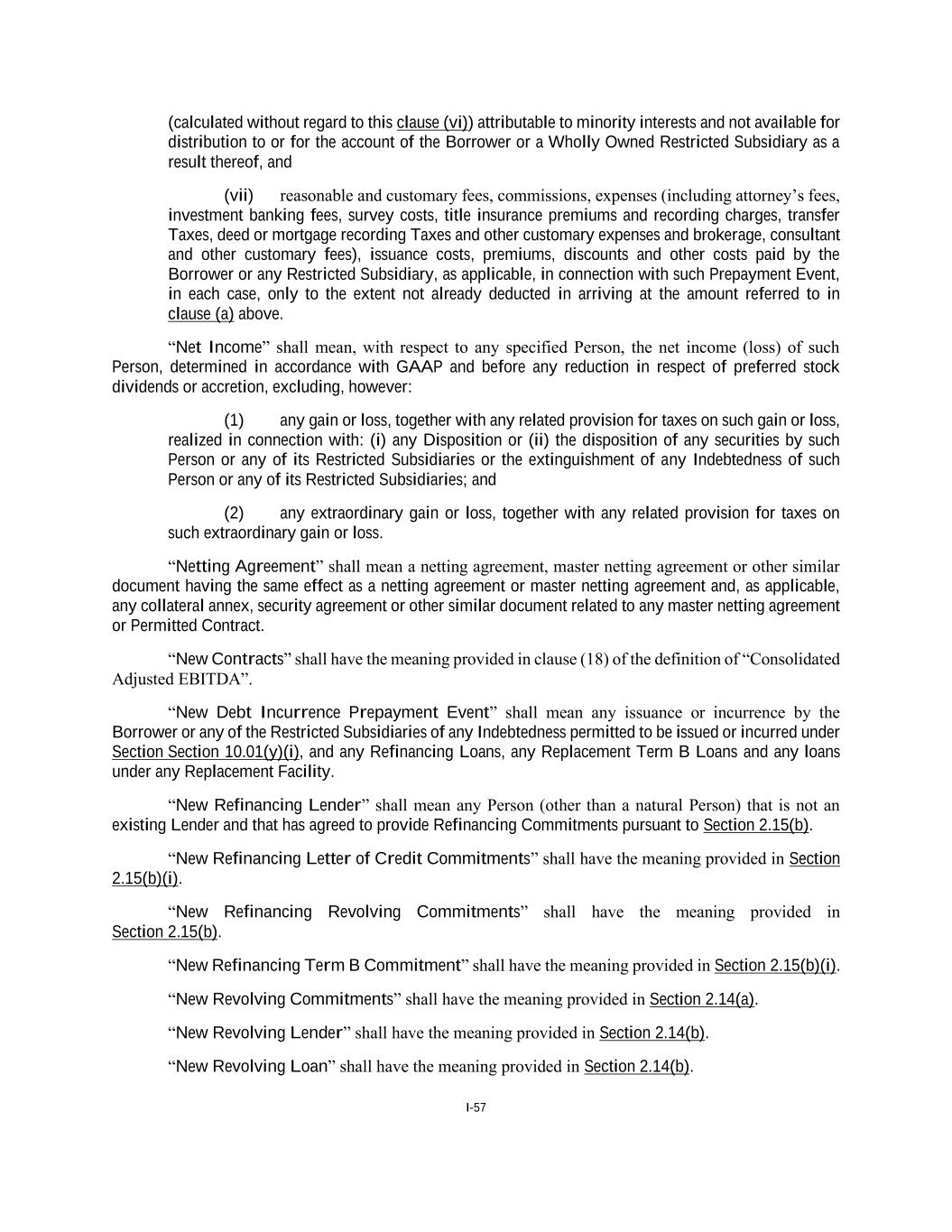 I-57 (calculated without regard to this clause (vi)) attributable to minority interests and not available for distribution to or for the account of the Borrower or a Wholly Owned Restricted Subsidiary as a result thereof, and (vii) reasonable and customary fees, commissions, expenses (including attorney’s fees, investment banking fees, survey costs, title insurance premiums and recording charges, transfer Taxes, deed or mortgage recording Taxes and other customary expenses and brokerage, consultant and other customary fees), issuance costs, premiums, discounts and other costs paid by the Borrower or any Restricted Subsidiary, as applicable, in connection with such Prepayment Event, in each case, only to the extent not already deducted in arriving at the amount referred to in clause (a) above. “Net Income” shall mean, with respect to any specified Person, the net income (loss) of such Person, determined in accordance with GAAP and before any reduction in respect of preferred stock dividends or accretion, excluding, however: (1) any gain or loss, together with any related provision for taxes on such gain or loss, realized in connection with: (i) any Disposition or (ii) the disposition of any securities by such Person or any of its Restricted Subsidiaries or the extinguishment of any Indebtedness of such Person or any of its Restricted Subsidiaries; and (2) any extraordinary gain or loss, together with any related provision for taxes on such extraordinary gain or loss. “Netting Agreement” shall mean a netting agreement, master netting agreement or other similar document having the same effect as a netting agreement or master netting agreement and, as applicable, any collateral annex, security agreement or other similar document related to any master netting agreement or Permitted Contract. “New Contracts” shall have the meaning provided in clause (18) of the definition of “Consolidated Adjusted EBITDA”. “New Debt Incurrence Prepayment Event” shall mean any issuance or incurrence by the Borrower or any of the Restricted Subsidiaries of any Indebtedness permitted to be issued or incurred under Section Section 10.01(y)(i), and any Refinancing Loans, any Replacement Term B Loans and any loans under any Replacement Facility. “New Refinancing Lender” shall mean any Person (other than a natural Person) that is not an existing Lender and that has agreed to provide Refinancing Commitments pursuant to Section 2.15(b). “New Refinancing Letter of Credit Commitments” shall have the meaning provided in Section 2.15(b)(i). “New Refinancing Revolving Commitments” shall have the meaning provided in Section 2.15(b). “New Refinancing Term B Commitment” shall have the meaning provided in Section 2.15(b)(i). “New Revolving Commitments” shall have the meaning provided in Section 2.14(a). “New Revolving Lender” shall have the meaning provided in Section 2.14(b). “New Revolving Loan” shall have the meaning provided in Section 2.14(b).