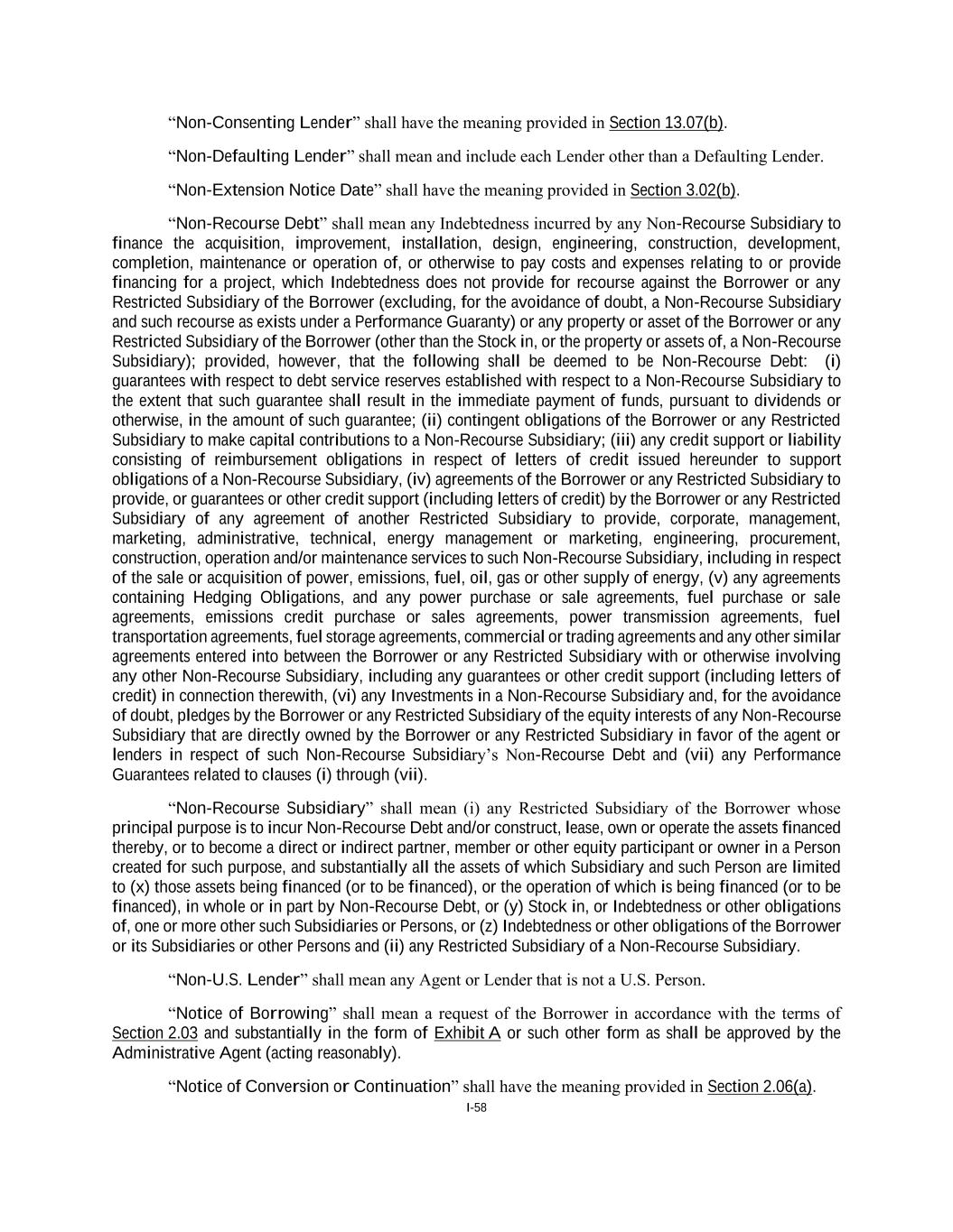 I-58 “Non-Consenting Lender” shall have the meaning provided in Section 13.07(b). “Non-Defaulting Lender” shall mean and include each Lender other than a Defaulting Lender. “Non-Extension Notice Date” shall have the meaning provided in Section 3.02(b). “Non-Recourse Debt” shall mean any Indebtedness incurred by any Non-Recourse Subsidiary to finance the acquisition, improvement, installation, design, engineering, construction, development, completion, maintenance or operation of, or otherwise to pay costs and expenses relating to or provide financing for a project, which Indebtedness does not provide for recourse against the Borrower or any Restricted Subsidiary of the Borrower (excluding, for the avoidance of doubt, a Non-Recourse Subsidiary and such recourse as exists under a Performance Guaranty) or any property or asset of the Borrower or any Restricted Subsidiary of the Borrower (other than the Stock in, or the property or assets of, a Non-Recourse Subsidiary); provided, however, that the following shall be deemed to be Non-Recourse Debt: (i) guarantees with respect to debt service reserves established with respect to a Non-Recourse Subsidiary to the extent that such guarantee shall result in the immediate payment of funds, pursuant to dividends or otherwise, in the amount of such guarantee; (ii) contingent obligations of the Borrower or any Restricted Subsidiary to make capital contributions to a Non-Recourse Subsidiary; (iii) any credit support or liability consisting of reimbursement obligations in respect of letters of credit issued hereunder to support obligations of a Non-Recourse Subsidiary, (iv) agreements of the Borrower or any Restricted Subsidiary to provide, or guarantees or other credit support (including letters of credit) by the Borrower or any Restricted Subsidiary of any agreement of another Restricted Subsidiary to provide, corporate, management, marketing, administrative, technical, energy management or marketing, engineering, procurement, construction, operation and/or maintenance services to such Non-Recourse Subsidiary, including in respect of the sale or acquisition of power, emissions, fuel, oil, gas or other supply of energy, (v) any agreements containing Hedging Obligations, and any power purchase or sale agreements, fuel purchase or sale agreements, emissions credit purchase or sales agreements, power transmission agreements, fuel transportation agreements, fuel storage agreements, commercial or trading agreements and any other similar agreements entered into between the Borrower or any Restricted Subsidiary with or otherwise involving any other Non-Recourse Subsidiary, including any guarantees or other credit support (including letters of credit) in connection therewith, (vi) any Investments in a Non-Recourse Subsidiary and, for the avoidance of doubt, pledges by the Borrower or any Restricted Subsidiary of the equity interests of any Non-Recourse Subsidiary that are directly owned by the Borrower or any Restricted Subsidiary in favor of the agent or lenders in respect of such Non-Recourse Subsidiary’s Non-Recourse Debt and (vii) any Performance Guarantees related to clauses (i) through (vii). “Non-Recourse Subsidiary” shall mean (i) any Restricted Subsidiary of the Borrower whose principal purpose is to incur Non-Recourse Debt and/or construct, lease, own or operate the assets financed thereby, or to become a direct or indirect partner, member or other equity participant or owner in a Person created for such purpose, and substantially all the assets of which Subsidiary and such Person are limited to (x) those assets being financed (or to be financed), or the operation of which is being financed (or to be financed), in whole or in part by Non-Recourse Debt, or (y) Stock in, or Indebtedness or other obligations of, one or more other such Subsidiaries or Persons, or (z) Indebtedness or other obligations of the Borrower or its Subsidiaries or other Persons and (ii) any Restricted Subsidiary of a Non-Recourse Subsidiary. “Non-U.S. Lender” shall mean any Agent or Lender that is not a U.S. Person. “Notice of Borrowing” shall mean a request of the Borrower in accordance with the terms of Section 2.03 and substantially in the form of Exhibit A or such other form as shall be approved by the Administrative Agent (acting reasonably). “Notice of Conversion or Continuation” shall have the meaning provided in Section 2.06(a).