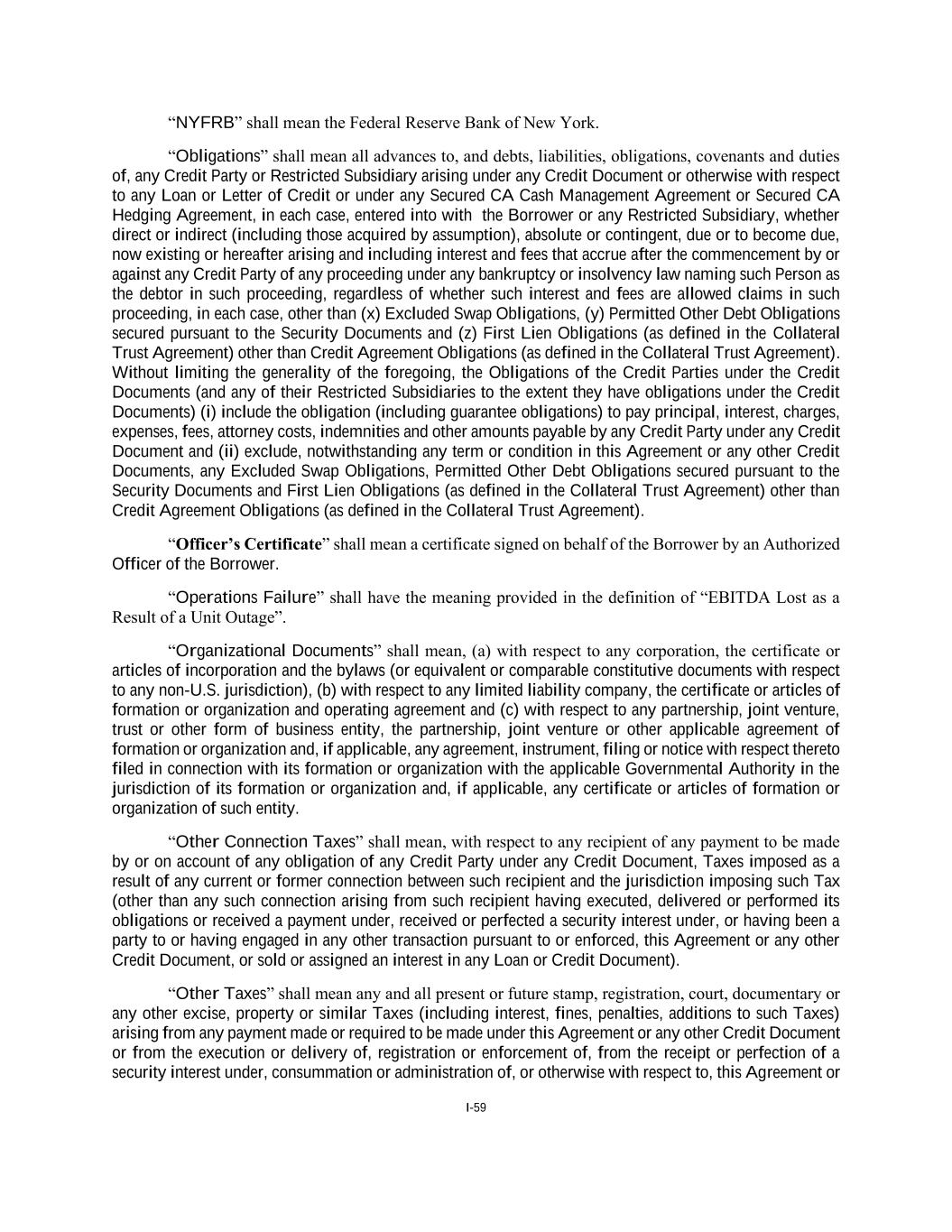 I-59 “NYFRB” shall mean the Federal Reserve Bank of New York. “Obligations” shall mean all advances to, and debts, liabilities, obligations, covenants and duties of, any Credit Party or Restricted Subsidiary arising under any Credit Document or otherwise with respect to any Loan or Letter of Credit or under any Secured CA Cash Management Agreement or Secured CA Hedging Agreement, in each case, entered into with the Borrower or any Restricted Subsidiary, whether direct or indirect (including those acquired by assumption), absolute or contingent, due or to become due, now existing or hereafter arising and including interest and fees that accrue after the commencement by or against any Credit Party of any proceeding under any bankruptcy or insolvency law naming such Person as the debtor in such proceeding, regardless of whether such interest and fees are allowed claims in such proceeding, in each case, other than (x) Excluded Swap Obligations, (y) Permitted Other Debt Obligations secured pursuant to the Security Documents and (z) First Lien Obligations (as defined in the Collateral Trust Agreement) other than Credit Agreement Obligations (as defined in the Collateral Trust Agreement). Without limiting the generality of the foregoing, the Obligations of the Credit Parties under the Credit Documents (and any of their Restricted Subsidiaries to the extent they have obligations under the Credit Documents) (i) include the obligation (including guarantee obligations) to pay principal, interest, charges, expenses, fees, attorney costs, indemnities and other amounts payable by any Credit Party under any Credit Document and (ii) exclude, notwithstanding any term or condition in this Agreement or any other Credit Documents, any Excluded Swap Obligations, Permitted Other Debt Obligations secured pursuant to the Security Documents and First Lien Obligations (as defined in the Collateral Trust Agreement) other than Credit Agreement Obligations (as defined in the Collateral Trust Agreement). “Officer’s Certificate” shall mean a certificate signed on behalf of the Borrower by an Authorized Officer of the Borrower. “Operations Failure” shall have the meaning provided in the definition of “EBITDA Lost as a Result of a Unit Outage”. “Organizational Documents” shall mean, (a) with respect to any corporation, the certificate or articles of incorporation and the bylaws (or equivalent or comparable constitutive documents with respect to any non-U.S. jurisdiction), (b) with respect to any limited liability company, the certificate or articles of formation or organization and operating agreement and (c) with respect to any partnership, joint venture, trust or other form of business entity, the partnership, joint venture or other applicable agreement of formation or organization and, if applicable, any agreement, instrument, filing or notice with respect thereto filed in connection with its formation or organization with the applicable Governmental Authority in the jurisdiction of its formation or organization and, if applicable, any certificate or articles of formation or organization of such entity. “Other Connection Taxes” shall mean, with respect to any recipient of any payment to be made by or on account of any obligation of any Credit Party under any Credit Document, Taxes imposed as a result of any current or former connection between such recipient and the jurisdiction imposing such Tax (other than any such connection arising from such recipient having executed, delivered or performed its obligations or received a payment under, received or perfected a security interest under, or having been a party to or having engaged in any other transaction pursuant to or enforced, this Agreement or any other Credit Document, or sold or assigned an interest in any Loan or Credit Document). “Other Taxes” shall mean any and all present or future stamp, registration, court, documentary or any other excise, property or similar Taxes (including interest, fines, penalties, additions to such Taxes) arising from any payment made or required to be made under this Agreement or any other Credit Document or from the execution or delivery of, registration or enforcement of, from the receipt or perfection of a security interest under, consummation or administration of, or otherwise with respect to, this Agreement or