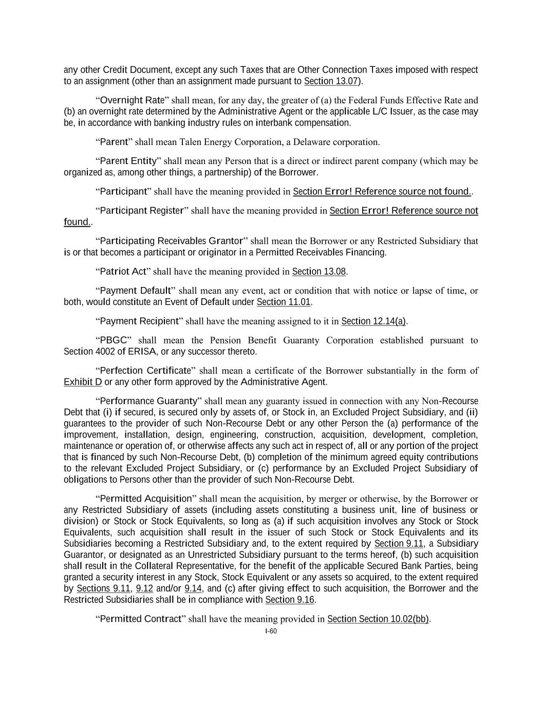 I-60 any other Credit Document, except any such Taxes that are Other Connection Taxes imposed with respect to an assignment (other than an assignment made pursuant to Section 13.07). “Overnight Rate” shall mean, for any day, the greater of (a) the Federal Funds Effective Rate and (b) an overnight rate determined by the Administrative Agent or the applicable L/C Issuer, as the case may be, in accordance with banking industry rules on interbank compensation. “Parent” shall mean Talen Energy Corporation, a Delaware corporation. “Parent Entity” shall mean any Person that is a direct or indirect parent company (which may be organized as, among other things, a partnership) of the Borrower. “Participant” shall have the meaning provided in Section Error! Reference source not found.. “Participant Register” shall have the meaning provided in Section Error! Reference source not found.. “Participating Receivables Grantor” shall mean the Borrower or any Restricted Subsidiary that is or that becomes a participant or originator in a Permitted Receivables Financing. “Patriot Act” shall have the meaning provided in Section 13.08. “Payment Default” shall mean any event, act or condition that with notice or lapse of time, or both, would constitute an Event of Default under Section 11.01. “Payment Recipient” shall have the meaning assigned to it in Section 12.14(a). “PBGC” shall mean the Pension Benefit Guaranty Corporation established pursuant to Section 4002 of ERISA, or any successor thereto. “Perfection Certificate” shall mean a certificate of the Borrower substantially in the form of Exhibit D or any other form approved by the Administrative Agent. “Performance Guaranty” shall mean any guaranty issued in connection with any Non-Recourse Debt that (i) if secured, is secured only by assets of, or Stock in, an Excluded Project Subsidiary, and (ii) guarantees to the provider of such Non-Recourse Debt or any other Person the (a) performance of the improvement, installation, design, engineering, construction, acquisition, development, completion, maintenance or operation of, or otherwise affects any such act in respect of, all or any portion of the project that is financed by such Non-Recourse Debt, (b) completion of the minimum agreed equity contributions to the relevant Excluded Project Subsidiary, or (c) performance by an Excluded Project Subsidiary of obligations to Persons other than the provider of such Non-Recourse Debt. “Permitted Acquisition” shall mean the acquisition, by merger or otherwise, by the Borrower or any Restricted Subsidiary of assets (including assets constituting a business unit, line of business or division) or Stock or Stock Equivalents, so long as (a) if such acquisition involves any Stock or Stock Equivalents, such acquisition shall result in the issuer of such Stock or Stock Equivalents and its Subsidiaries becoming a Restricted Subsidiary and, to the extent required by Section 9.11, a Subsidiary Guarantor, or designated as an Unrestricted Subsidiary pursuant to the terms hereof, (b) such acquisition shall result in the Collateral Representative, for the benefit of the applicable Secured Bank Parties, being granted a security interest in any Stock, Stock Equivalent or any assets so acquired, to the extent required by Sections 9.11, 9.12 and/or 9.14, and (c) after giving effect to such acquisition, the Borrower and the Restricted Subsidiaries shall be in compliance with Section 9.16. “Permitted Contract” shall have the meaning provided in Section Section 10.02(bb).