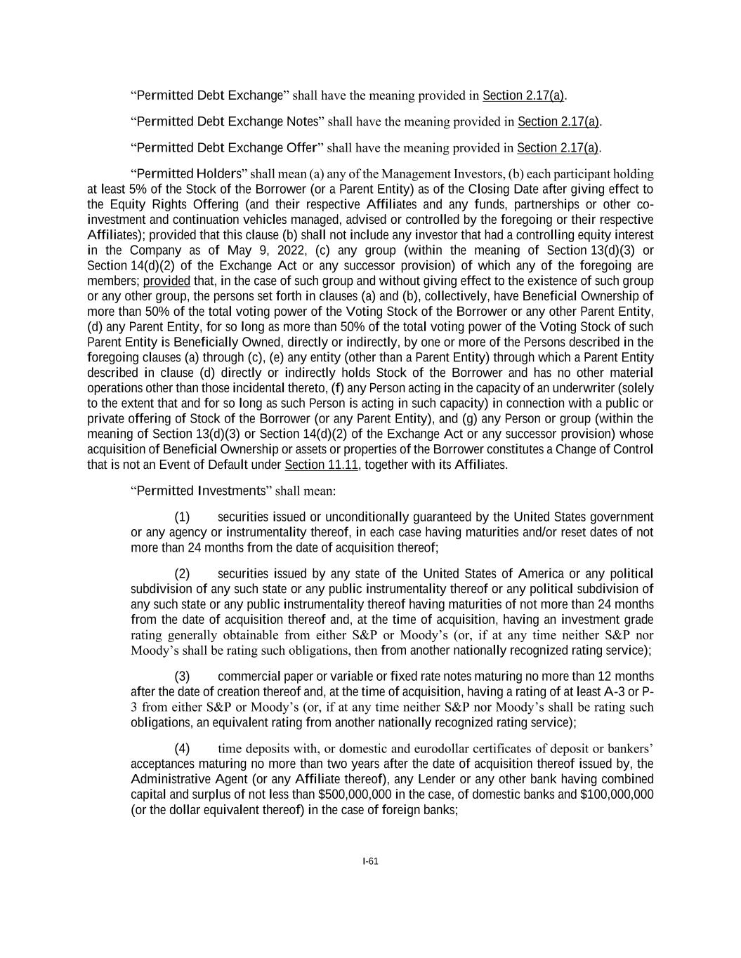 I-61 “Permitted Debt Exchange” shall have the meaning provided in Section 2.17(a). “Permitted Debt Exchange Notes” shall have the meaning provided in Section 2.17(a). “Permitted Debt Exchange Offer” shall have the meaning provided in Section 2.17(a). “Permitted Holders” shall mean (a) any of the Management Investors, (b) each participant holding at least 5% of the Stock of the Borrower (or a Parent Entity) as of the Closing Date after giving effect to the Equity Rights Offering (and their respective Affiliates and any funds, partnerships or other co- investment and continuation vehicles managed, advised or controlled by the foregoing or their respective Affiliates); provided that this clause (b) shall not include any investor that had a controlling equity interest in the Company as of May 9, 2022, (c) any group (within the meaning of Section 13(d)(3) or Section 14(d)(2) of the Exchange Act or any successor provision) of which any of the foregoing are members; provided that, in the case of such group and without giving effect to the existence of such group or any other group, the persons set forth in clauses (a) and (b), collectively, have Beneficial Ownership of more than 50% of the total voting power of the Voting Stock of the Borrower or any other Parent Entity, (d) any Parent Entity, for so long as more than 50% of the total voting power of the Voting Stock of such Parent Entity is Beneficially Owned, directly or indirectly, by one or more of the Persons described in the foregoing clauses (a) through (c), (e) any entity (other than a Parent Entity) through which a Parent Entity described in clause (d) directly or indirectly holds Stock of the Borrower and has no other material operations other than those incidental thereto, (f) any Person acting in the capacity of an underwriter (solely to the extent that and for so long as such Person is acting in such capacity) in connection with a public or private offering of Stock of the Borrower (or any Parent Entity), and (g) any Person or group (within the meaning of Section 13(d)(3) or Section 14(d)(2) of the Exchange Act or any successor provision) whose acquisition of Beneficial Ownership or assets or properties of the Borrower constitutes a Change of Control that is not an Event of Default under Section 11.11, together with its Affiliates. “Permitted Investments” shall mean: (1) securities issued or unconditionally guaranteed by the United States government or any agency or instrumentality thereof, in each case having maturities and/or reset dates of not more than 24 months from the date of acquisition thereof; (2) securities issued by any state of the United States of America or any political subdivision of any such state or any public instrumentality thereof or any political subdivision of any such state or any public instrumentality thereof having maturities of not more than 24 months from the date of acquisition thereof and, at the time of acquisition, having an investment grade rating generally obtainable from either S&P or Moody’s (or, if at any time neither S&P nor Moody’s shall be rating such obligations, then from another nationally recognized rating service); (3) commercial paper or variable or fixed rate notes maturing no more than 12 months after the date of creation thereof and, at the time of acquisition, having a rating of at least A-3 or P- 3 from either S&P or Moody’s (or, if at any time neither S&P nor Moody’s shall be rating such obligations, an equivalent rating from another nationally recognized rating service); (4) time deposits with, or domestic and eurodollar certificates of deposit or bankers’ acceptances maturing no more than two years after the date of acquisition thereof issued by, the Administrative Agent (or any Affiliate thereof), any Lender or any other bank having combined capital and surplus of not less than $500,000,000 in the case, of domestic banks and $100,000,000 (or the dollar equivalent thereof) in the case of foreign banks;