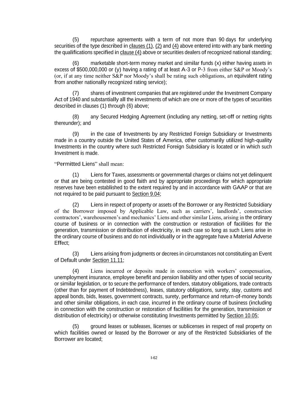I-62 (5) repurchase agreements with a term of not more than 90 days for underlying securities of the type described in clauses (1), (2) and (4) above entered into with any bank meeting the qualifications specified in clause (4) above or securities dealers of recognized national standing; (6) marketable short-term money market and similar funds (x) either having assets in excess of $500,000,000 or (y) having a rating of at least A-3 or P-3 from either S&P or Moody’s (or, if at any time neither S&P nor Moody’s shall be rating such obligations, an equivalent rating from another nationally recognized rating service); (7) shares of investment companies that are registered under the Investment Company Act of 1940 and substantially all the investments of which are one or more of the types of securities described in clauses (1) through (6) above; (8) any Secured Hedging Agreement (including any netting, set-off or netting rights thereunder); and (9) in the case of Investments by any Restricted Foreign Subsidiary or Investments made in a country outside the United States of America, other customarily utilized high-quality Investments in the country where such Restricted Foreign Subsidiary is located or in which such Investment is made. “Permitted Liens” shall mean: (1) Liens for Taxes, assessments or governmental charges or claims not yet delinquent or that are being contested in good faith and by appropriate proceedings for which appropriate reserves have been established to the extent required by and in accordance with GAAP or that are not required to be paid pursuant to Section 9.04; (2) Liens in respect of property or assets of the Borrower or any Restricted Subsidiary of the Borrower imposed by Applicable Law, such as carriers’, landlords’, construction contractors’, warehousemen’s and mechanics’ Liens and other similar Liens, arising in the ordinary course of business or in connection with the construction or restoration of facilities for the generation, transmission or distribution of electricity, in each case so long as such Liens arise in the ordinary course of business and do not individually or in the aggregate have a Material Adverse Effect; (3) Liens arising from judgments or decrees in circumstances not constituting an Event of Default under Section 11.11; (4) Liens incurred or deposits made in connection with workers’ compensation, unemployment insurance, employee benefit and pension liability and other types of social security or similar legislation, or to secure the performance of tenders, statutory obligations, trade contracts (other than for payment of Indebtedness), leases, statutory obligations, surety, stay, customs and appeal bonds, bids, leases, government contracts, surety, performance and return-of-money bonds and other similar obligations, in each case, incurred in the ordinary course of business (including in connection with the construction or restoration of facilities for the generation, transmission or distribution of electricity) or otherwise constituting Investments permitted by Section 10.05; (5) ground leases or subleases, licenses or sublicenses in respect of real property on which facilities owned or leased by the Borrower or any of the Restricted Subsidiaries of the Borrower are located;