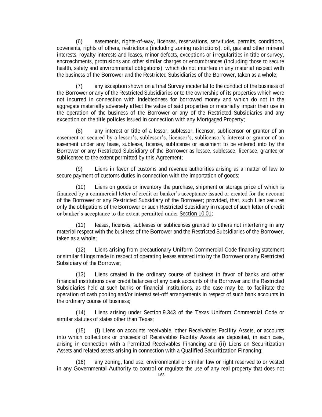 I-63 (6) easements, rights-of-way, licenses, reservations, servitudes, permits, conditions, covenants, rights of others, restrictions (including zoning restrictions), oil, gas and other mineral interests, royalty interests and leases, minor defects, exceptions or irregularities in title or survey, encroachments, protrusions and other similar charges or encumbrances (including those to secure health, safety and environmental obligations), which do not interfere in any material respect with the business of the Borrower and the Restricted Subsidiaries of the Borrower, taken as a whole; (7) any exception shown on a final Survey incidental to the conduct of the business of the Borrower or any of the Restricted Subsidiaries or to the ownership of its properties which were not incurred in connection with Indebtedness for borrowed money and which do not in the aggregate materially adversely affect the value of said properties or materially impair their use in the operation of the business of the Borrower or any of the Restricted Subsidiaries and any exception on the title policies issued in connection with any Mortgaged Property; (8) any interest or title of a lessor, sublessor, licensor, sublicensor or grantor of an easement or secured by a lessor’s, sublessor’s, licensor’s, sublicensor’s interest or grantor of an easement under any lease, sublease, license, sublicense or easement to be entered into by the Borrower or any Restricted Subsidiary of the Borrower as lessee, sublessee, licensee, grantee or sublicensee to the extent permitted by this Agreement; (9) Liens in favor of customs and revenue authorities arising as a matter of law to secure payment of customs duties in connection with the importation of goods; (10) Liens on goods or inventory the purchase, shipment or storage price of which is financed by a commercial letter of credit or banker’s acceptance issued or created for the account of the Borrower or any Restricted Subsidiary of the Borrower; provided, that, such Lien secures only the obligations of the Borrower or such Restricted Subsidiary in respect of such letter of credit or banker’s acceptance to the extent permitted under Section 10.01; (11) leases, licenses, subleases or sublicenses granted to others not interfering in any material respect with the business of the Borrower and the Restricted Subsidiaries of the Borrower, taken as a whole; (12) Liens arising from precautionary Uniform Commercial Code financing statement or similar filings made in respect of operating leases entered into by the Borrower or any Restricted Subsidiary of the Borrower; (13) Liens created in the ordinary course of business in favor of banks and other financial institutions over credit balances of any bank accounts of the Borrower and the Restricted Subsidiaries held at such banks or financial institutions, as the case may be, to facilitate the operation of cash pooling and/or interest set-off arrangements in respect of such bank accounts in the ordinary course of business; (14) Liens arising under Section 9.343 of the Texas Uniform Commercial Code or similar statutes of states other than Texas; (15) (i) Liens on accounts receivable, other Receivables Facility Assets, or accounts into which collections or proceeds of Receivables Facility Assets are deposited, in each case, arising in connection with a Permitted Receivables Financing and (ii) Liens on Securitization Assets and related assets arising in connection with a Qualified Securitization Financing; (16) any zoning, land use, environmental or similar law or right reserved to or vested in any Governmental Authority to control or regulate the use of any real property that does not