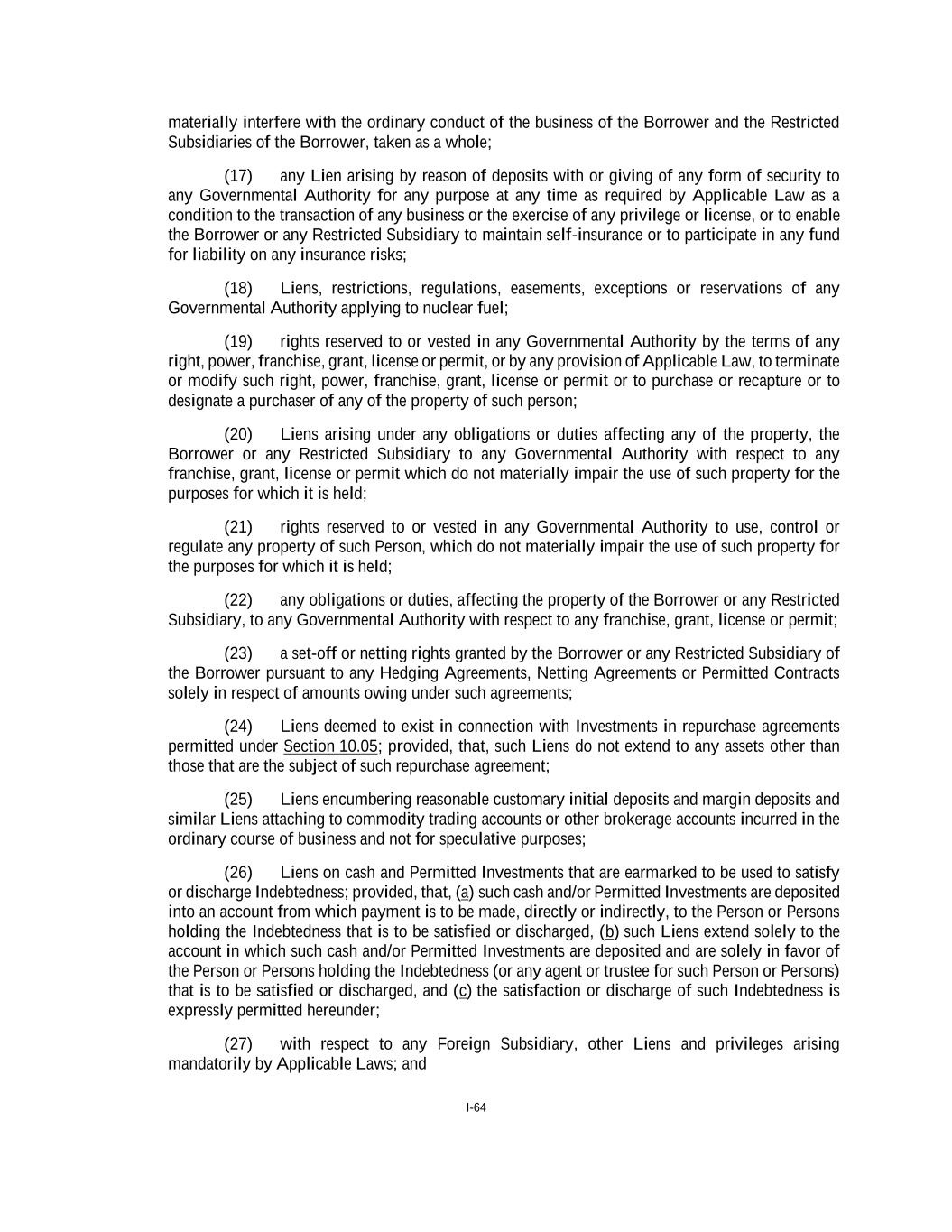 I-64 materially interfere with the ordinary conduct of the business of the Borrower and the Restricted Subsidiaries of the Borrower, taken as a whole; (17) any Lien arising by reason of deposits with or giving of any form of security to any Governmental Authority for any purpose at any time as required by Applicable Law as a condition to the transaction of any business or the exercise of any privilege or license, or to enable the Borrower or any Restricted Subsidiary to maintain self-insurance or to participate in any fund for liability on any insurance risks; (18) Liens, restrictions, regulations, easements, exceptions or reservations of any Governmental Authority applying to nuclear fuel; (19) rights reserved to or vested in any Governmental Authority by the terms of any right, power, franchise, grant, license or permit, or by any provision of Applicable Law, to terminate or modify such right, power, franchise, grant, license or permit or to purchase or recapture or to designate a purchaser of any of the property of such person; (20) Liens arising under any obligations or duties affecting any of the property, the Borrower or any Restricted Subsidiary to any Governmental Authority with respect to any franchise, grant, license or permit which do not materially impair the use of such property for the purposes for which it is held; (21) rights reserved to or vested in any Governmental Authority to use, control or regulate any property of such Person, which do not materially impair the use of such property for the purposes for which it is held; (22) any obligations or duties, affecting the property of the Borrower or any Restricted Subsidiary, to any Governmental Authority with respect to any franchise, grant, license or permit; (23) a set-off or netting rights granted by the Borrower or any Restricted Subsidiary of the Borrower pursuant to any Hedging Agreements, Netting Agreements or Permitted Contracts solely in respect of amounts owing under such agreements; (24) Liens deemed to exist in connection with Investments in repurchase agreements permitted under Section 10.05; provided, that, such Liens do not extend to any assets other than those that are the subject of such repurchase agreement; (25) Liens encumbering reasonable customary initial deposits and margin deposits and similar Liens attaching to commodity trading accounts or other brokerage accounts incurred in the ordinary course of business and not for speculative purposes; (26) Liens on cash and Permitted Investments that are earmarked to be used to satisfy or discharge Indebtedness; provided, that, (a) such cash and/or Permitted Investments are deposited into an account from which payment is to be made, directly or indirectly, to the Person or Persons holding the Indebtedness that is to be satisfied or discharged, (b) such Liens extend solely to the account in which such cash and/or Permitted Investments are deposited and are solely in favor of the Person or Persons holding the Indebtedness (or any agent or trustee for such Person or Persons) that is to be satisfied or discharged, and (c) the satisfaction or discharge of such Indebtedness is expressly permitted hereunder; (27) with respect to any Foreign Subsidiary, other Liens and privileges arising mandatorily by Applicable Laws; and