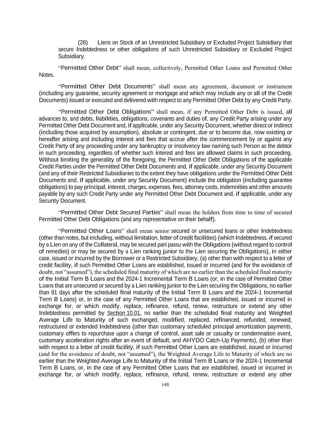I-65 (28) Liens on Stock of an Unrestricted Subsidiary or Excluded Project Subsidiary that secure Indebtedness or other obligations of such Unrestricted Subsidiary or Excluded Project Subsidiary. “Permitted Other Debt” shall mean, collectively, Permitted Other Loans and Permitted Other Notes. “Permitted Other Debt Documents” shall mean any agreement, document or instrument (including any guarantee, security agreement or mortgage and which may include any or all of the Credit Documents) issued or executed and delivered with respect to any Permitted Other Debt by any Credit Party. “Permitted Other Debt Obligations” shall mean, if any Permitted Other Debt is issued, all advances to, and debts, liabilities, obligations, covenants and duties of, any Credit Party arising under any Permitted Other Debt Document and, if applicable, under any Security Document, whether direct or indirect (including those acquired by assumption), absolute or contingent, due or to become due, now existing or hereafter arising and including interest and fees that accrue after the commencement by or against any Credit Party of any proceeding under any bankruptcy or insolvency law naming such Person as the debtor in such proceeding, regardless of whether such interest and fees are allowed claims in such proceeding. Without limiting the generality of the foregoing, the Permitted Other Debt Obligations of the applicable Credit Parties under the Permitted Other Debt Documents and, if applicable, under any Security Document (and any of their Restricted Subsidiaries to the extent they have obligations under the Permitted Other Debt Documents and, if applicable, under any Security Document) include the obligation (including guarantee obligations) to pay principal, interest, charges, expenses, fees, attorney costs, indemnities and other amounts payable by any such Credit Party under any Permitted Other Debt Document and, if applicable, under any Security Document. “Permitted Other Debt Secured Parties” shall mean the holders from time to time of secured Permitted Other Debt Obligations (and any representative on their behalf). “Permitted Other Loans” shall mean senior secured or unsecured loans or other Indebtedness (other than notes, but including, without limitation, letter of credit facilities) (which Indebtedness, if secured by a Lien on any of the Collateral, may be secured pari passu with the Obligations (without regard to control of remedies) or may be secured by a Lien ranking junior to the Lien securing the Obligations), in either case, issued or incurred by the Borrower or a Restricted Subsidiary, (a) other than with respect to a letter of credit facility, if such Permitted Other Loans are established, issued or incurred (and for the avoidance of doubt, not “assumed”), the scheduled final maturity of which are no earlier than the scheduled final maturity of the Initial Term B Loans and the 2024-1 Incremental Term B Loans (or, in the case of Permitted Other Loans that are unsecured or secured by a Lien ranking junior to the Lien securing the Obligations, no earlier than 91 days after the scheduled final maturity of the Initial Term B Loans and the 2024-1 Incremental Term B Loans) or, in the case of any Permitted Other Loans that are established, issued or incurred in exchange for, or which modify, replace, refinance, refund, renew, restructure or extend any other Indebtedness permitted by Section 10.01, no earlier than the scheduled final maturity and Weighted Average Life to Maturity of such exchanged, modified, replaced, refinanced, refunded, renewed, restructured or extended Indebtedness (other than customary scheduled principal amortization payments, customary offers to repurchase upon a change of control, asset sale or casualty or condemnation event, customary acceleration rights after an event of default, and AHYDO Catch-Up Payments), (b) other than with respect to a letter of credit facility, if such Permitted Other Loans are established, issued or incurred (and for the avoidance of doubt, not “assumed”), the Weighted Average Life to Maturity of which are no earlier than the Weighted Average Life to Maturity of the Initial Term B Loans or the 2024-1 Incremental Term B Loans, or, in the case of any Permitted Other Loans that are established, issued or incurred in exchange for, or which modify, replace, refinance, refund, renew, restructure or extend any other