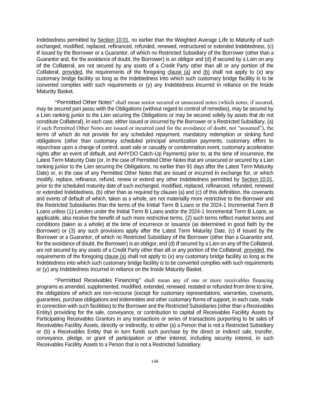 I-66 Indebtedness permitted by Section 10.01, no earlier than the Weighted Average Life to Maturity of such exchanged, modified, replaced, refinanced, refunded, renewed, restructured or extended Indebtedness, (c) if issued by the Borrower or a Guarantor, of which no Restricted Subsidiary of the Borrower (other than a Guarantor and, for the avoidance of doubt, the Borrower) is an obligor and (d) if secured by a Lien on any of the Collateral, are not secured by any assets of a Credit Party other than all or any portion of the Collateral, provided, the requirements of the foregoing clause (a) and (b) shall not apply to (x) any customary bridge facility so long as the Indebtedness into which such customary bridge facility is to be converted complies with such requirements or (y) any Indebtedness incurred in reliance on the Inside Maturity Basket. “Permitted Other Notes” shall mean senior secured or unsecured notes (which notes, if secured, may be secured pari passu with the Obligations (without regard to control of remedies), may be secured by a Lien ranking junior to the Lien securing the Obligations or may be secured solely by assets that do not constitute Collateral), in each case, either issued or incurred by the Borrower or a Restricted Subsidiary, (a) if such Permitted Other Notes are issued or incurred (and for the avoidance of doubt, not “assumed”), the terms of which do not provide for any scheduled repayment, mandatory redemption or sinking fund obligations (other than customary scheduled principal amortization payments, customary offers to repurchase upon a change of control, asset sale or casualty or condemnation event, customary acceleration rights after an event of default, and AHYDO Catch-Up Payments) prior to, at the time of incurrence, the Latest Term Maturity Date (or, in the case of Permitted Other Notes that are unsecured or secured by a Lien ranking junior to the Lien securing the Obligations, no earlier than 91 days after the Latest Term Maturity Date) or, in the case of any Permitted Other Notes that are issued or incurred in exchange for, or which modify, replace, refinance, refund, renew or extend any other Indebtedness permitted by Section 10.01, prior to the scheduled maturity date of such exchanged, modified, replaced, refinanced, refunded, renewed or extended Indebtedness, (b) other than as required by clauses (a) and (c) of this definition, the covenants and events of default of which, taken as a whole, are not materially more restrictive to the Borrower and the Restricted Subsidiaries than the terms of the Initial Term B Loans or the 2024-1 Incremental Term B Loans unless (1) Lenders under the Initial Term B Loans and/or the 2024-1 Incremental Term B Loans, as applicable, also receive the benefit of such more restrictive terms, (2) such terms reflect market terms and conditions (taken as a whole) at the time of incurrence or issuance (as determined in good faith by the Borrower) or (3) any such provisions apply after the Latest Term Maturity Date, (c) if issued by the Borrower or a Guarantor, of which no Restricted Subsidiary of the Borrower (other than a Guarantor and, for the avoidance of doubt, the Borrower) is an obligor, and (d) if secured by a Lien on any of the Collateral, are not secured by any assets of a Credit Party other than all or any portion of the Collateral; provided, the requirements of the foregoing clause (a) shall not apply to (x) any customary bridge facility so long as the Indebtedness into which such customary bridge facility is to be converted complies with such requirements or (y) any Indebtedness incurred in reliance on the Inside Maturity Basket. “Permitted Receivables Financing” shall mean any of one or more receivables financing programs as amended, supplemented, modified, extended, renewed, restated or refunded from time to time, the obligations of which are non-recourse (except for customary representations, warranties, covenants, guarantees, purchase obligations and indemnities and other customary forms of support, in each case, made in connection with such facilities) to the Borrower and the Restricted Subsidiaries (other than a Receivables Entity) providing for the sale, conveyance, or contribution to capital of Receivables Facility Assets by Participating Receivables Grantors in any transactions or series of transactions purporting to be sales of Receivables Facility Assets, directly or indirectly, to either (a) a Person that is not a Restricted Subsidiary or (b) a Receivables Entity that in turn funds such purchase by the direct or indirect sale, transfer, conveyance, pledge, or grant of participation or other interest, including security interest, in such Receivables Facility Assets to a Person that is not a Restricted Subsidiary.