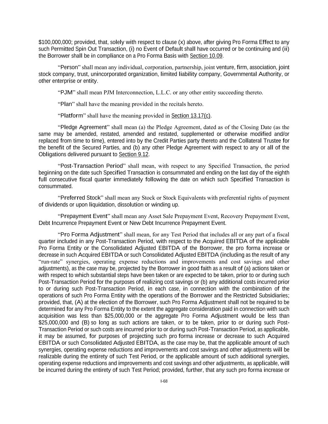 I-68 $100,000,000; provided, that, solely with respect to clause (x) above, after giving Pro Forma Effect to any such Permitted Spin Out Transaction, (i) no Event of Default shall have occurred or be continuing and (ii) the Borrower shall be in compliance on a Pro Forma Basis with Section 10.09. “Person” shall mean any individual, corporation, partnership, joint venture, firm, association, joint stock company, trust, unincorporated organization, limited liability company, Governmental Authority, or other enterprise or entity. “PJM” shall mean PJM Interconnection, L.L.C. or any other entity succeeding thereto. “Plan” shall have the meaning provided in the recitals hereto. “Platform” shall have the meaning provided in Section 13.17(c). “Pledge Agreement” shall mean (a) the Pledge Agreement, dated as of the Closing Date (as the same may be amended, restated, amended and restated, supplemented or otherwise modified and/or replaced from time to time), entered into by the Credit Parties party thereto and the Collateral Trustee for the benefit of the Secured Parties, and (b) any other Pledge Agreement with respect to any or all of the Obligations delivered pursuant to Section 9.12. “Post-Transaction Period” shall mean, with respect to any Specified Transaction, the period beginning on the date such Specified Transaction is consummated and ending on the last day of the eighth full consecutive fiscal quarter immediately following the date on which such Specified Transaction is consummated. “Preferred Stock” shall mean any Stock or Stock Equivalents with preferential rights of payment of dividends or upon liquidation, dissolution or winding up. “Prepayment Event” shall mean any Asset Sale Prepayment Event, Recovery Prepayment Event, Debt Incurrence Prepayment Event or New Debt Incurrence Prepayment Event. “Pro Forma Adjustment” shall mean, for any Test Period that includes all or any part of a fiscal quarter included in any Post-Transaction Period, with respect to the Acquired EBITDA of the applicable Pro Forma Entity or the Consolidated Adjusted EBITDA of the Borrower, the pro forma increase or decrease in such Acquired EBITDA or such Consolidated Adjusted EBITDA (including as the result of any “run-rate” synergies, operating expense reductions and improvements and cost savings and other adjustments), as the case may be, projected by the Borrower in good faith as a result of (a) actions taken or with respect to which substantial steps have been taken or are expected to be taken, prior to or during such Post-Transaction Period for the purposes of realizing cost savings or (b) any additional costs incurred prior to or during such Post-Transaction Period, in each case, in connection with the combination of the operations of such Pro Forma Entity with the operations of the Borrower and the Restricted Subsidiaries; provided, that, (A) at the election of the Borrower, such Pro Forma Adjustment shall not be required to be determined for any Pro Forma Entity to the extent the aggregate consideration paid in connection with such acquisition was less than $25,000,000 or the aggregate Pro Forma Adjustment would be less than $25,000,000 and (B) so long as such actions are taken, or to be taken, prior to or during such Post- Transaction Period or such costs are incurred prior to or during such Post-Transaction Period, as applicable, it may be assumed, for purposes of projecting such pro forma increase or decrease to such Acquired EBITDA or such Consolidated Adjusted EBITDA, as the case may be, that the applicable amount of such synergies, operating expense reductions and improvements and cost savings and other adjustments will be realizable during the entirety of such Test Period, or the applicable amount of such additional synergies, operating expense reductions and improvements and cost savings and other adjustments, as applicable, will be incurred during the entirety of such Test Period; provided, further, that any such pro forma increase or