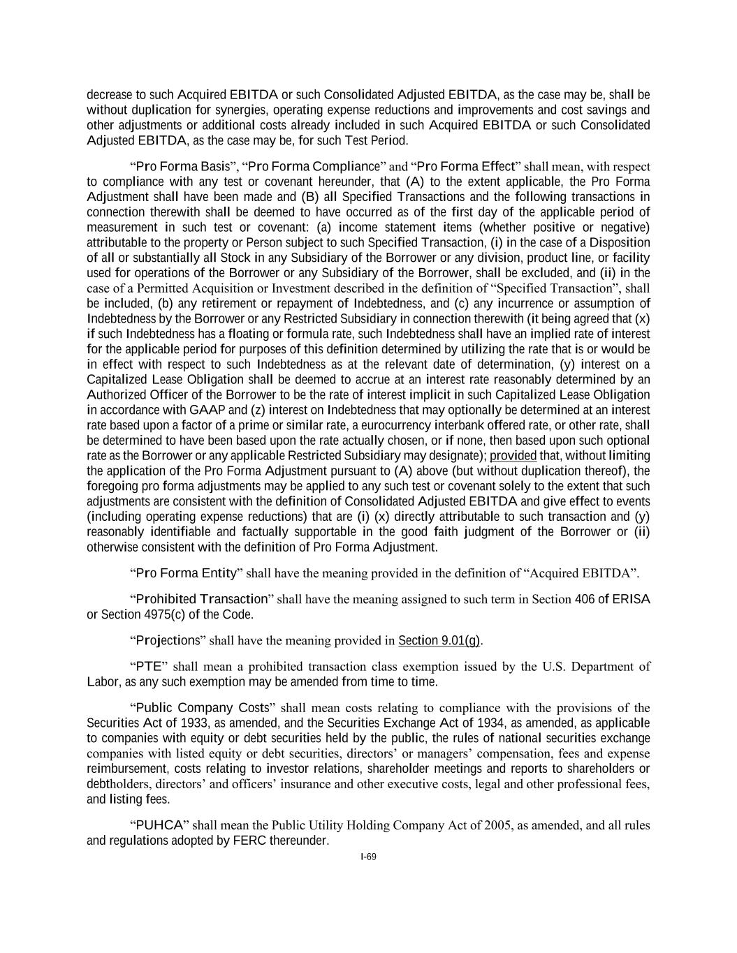 I-69 decrease to such Acquired EBITDA or such Consolidated Adjusted EBITDA, as the case may be, shall be without duplication for synergies, operating expense reductions and improvements and cost savings and other adjustments or additional costs already included in such Acquired EBITDA or such Consolidated Adjusted EBITDA, as the case may be, for such Test Period. “Pro Forma Basis”, “Pro Forma Compliance” and “Pro Forma Effect” shall mean, with respect to compliance with any test or covenant hereunder, that (A) to the extent applicable, the Pro Forma Adjustment shall have been made and (B) all Specified Transactions and the following transactions in connection therewith shall be deemed to have occurred as of the first day of the applicable period of measurement in such test or covenant: (a) income statement items (whether positive or negative) attributable to the property or Person subject to such Specified Transaction, (i) in the case of a Disposition of all or substantially all Stock in any Subsidiary of the Borrower or any division, product line, or facility used for operations of the Borrower or any Subsidiary of the Borrower, shall be excluded, and (ii) in the case of a Permitted Acquisition or Investment described in the definition of “Specified Transaction”, shall be included, (b) any retirement or repayment of Indebtedness, and (c) any incurrence or assumption of Indebtedness by the Borrower or any Restricted Subsidiary in connection therewith (it being agreed that (x) if such Indebtedness has a floating or formula rate, such Indebtedness shall have an implied rate of interest for the applicable period for purposes of this definition determined by utilizing the rate that is or would be in effect with respect to such Indebtedness as at the relevant date of determination, (y) interest on a Capitalized Lease Obligation shall be deemed to accrue at an interest rate reasonably determined by an Authorized Officer of the Borrower to be the rate of interest implicit in such Capitalized Lease Obligation in accordance with GAAP and (z) interest on Indebtedness that may optionally be determined at an interest rate based upon a factor of a prime or similar rate, a eurocurrency interbank offered rate, or other rate, shall be determined to have been based upon the rate actually chosen, or if none, then based upon such optional rate as the Borrower or any applicable Restricted Subsidiary may designate); provided that, without limiting the application of the Pro Forma Adjustment pursuant to (A) above (but without duplication thereof), the foregoing pro forma adjustments may be applied to any such test or covenant solely to the extent that such adjustments are consistent with the definition of Consolidated Adjusted EBITDA and give effect to events (including operating expense reductions) that are (i) (x) directly attributable to such transaction and (y) reasonably identifiable and factually supportable in the good faith judgment of the Borrower or (ii) otherwise consistent with the definition of Pro Forma Adjustment. “Pro Forma Entity” shall have the meaning provided in the definition of “Acquired EBITDA”. “Prohibited Transaction” shall have the meaning assigned to such term in Section 406 of ERISA or Section 4975(c) of the Code. “Projections” shall have the meaning provided in Section 9.01(g). “PTE” shall mean a prohibited transaction class exemption issued by the U.S. Department of Labor, as any such exemption may be amended from time to time. “Public Company Costs” shall mean costs relating to compliance with the provisions of the Securities Act of 1933, as amended, and the Securities Exchange Act of 1934, as amended, as applicable to companies with equity or debt securities held by the public, the rules of national securities exchange companies with listed equity or debt securities, directors’ or managers’ compensation, fees and expense reimbursement, costs relating to investor relations, shareholder meetings and reports to shareholders or debtholders, directors’ and officers’ insurance and other executive costs, legal and other professional fees, and listing fees. “PUHCA” shall mean the Public Utility Holding Company Act of 2005, as amended, and all rules and regulations adopted by FERC thereunder.