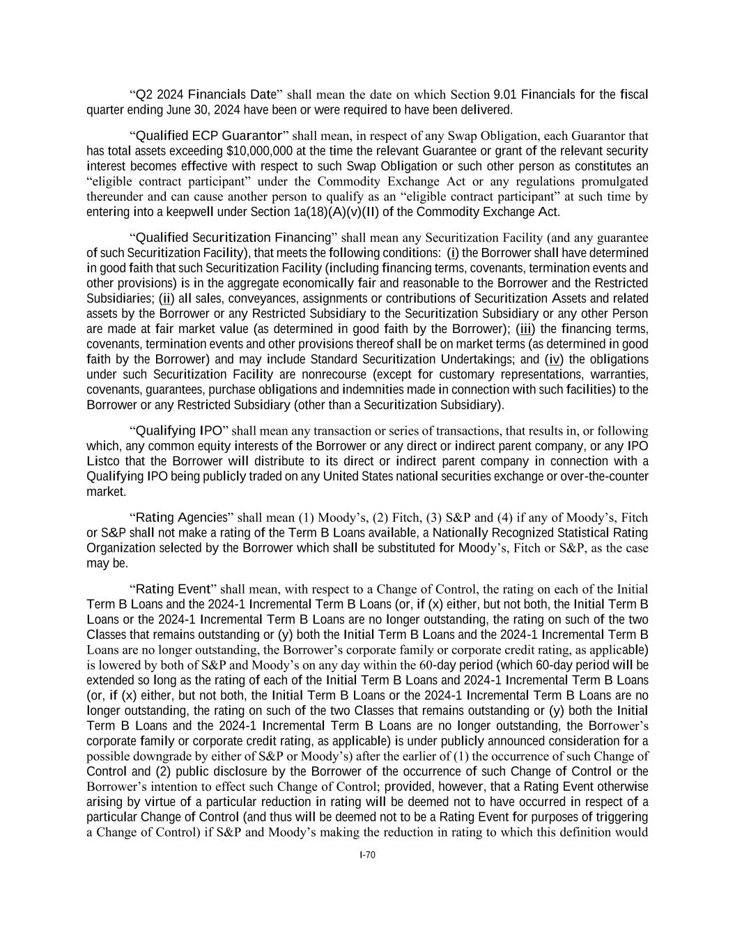 I-70 “Q2 2024 Financials Date” shall mean the date on which Section 9.01 Financials for the fiscal quarter ending June 30, 2024 have been or were required to have been delivered. “Qualified ECP Guarantor” shall mean, in respect of any Swap Obligation, each Guarantor that has total assets exceeding $10,000,000 at the time the relevant Guarantee or grant of the relevant security interest becomes effective with respect to such Swap Obligation or such other person as constitutes an “eligible contract participant” under the Commodity Exchange Act or any regulations promulgated thereunder and can cause another person to qualify as an “eligible contract participant” at such time by entering into a keepwell under Section 1a(18)(A)(v)(II) of the Commodity Exchange Act. “Qualified Securitization Financing” shall mean any Securitization Facility (and any guarantee of such Securitization Facility), that meets the following conditions: (i) the Borrower shall have determined in good faith that such Securitization Facility (including financing terms, covenants, termination events and other provisions) is in the aggregate economically fair and reasonable to the Borrower and the Restricted Subsidiaries; (ii) all sales, conveyances, assignments or contributions of Securitization Assets and related assets by the Borrower or any Restricted Subsidiary to the Securitization Subsidiary or any other Person are made at fair market value (as determined in good faith by the Borrower); (iii) the financing terms, covenants, termination events and other provisions thereof shall be on market terms (as determined in good faith by the Borrower) and may include Standard Securitization Undertakings; and (iv) the obligations under such Securitization Facility are nonrecourse (except for customary representations, warranties, covenants, guarantees, purchase obligations and indemnities made in connection with such facilities) to the Borrower or any Restricted Subsidiary (other than a Securitization Subsidiary). “Qualifying IPO” shall mean any transaction or series of transactions, that results in, or following which, any common equity interests of the Borrower or any direct or indirect parent company, or any IPO Listco that the Borrower will distribute to its direct or indirect parent company in connection with a Qualifying IPO being publicly traded on any United States national securities exchange or over-the-counter market. “Rating Agencies” shall mean (1) Moody’s, (2) Fitch, (3) S&P and (4) if any of Moody’s, Fitch or S&P shall not make a rating of the Term B Loans available, a Nationally Recognized Statistical Rating Organization selected by the Borrower which shall be substituted for Moody’s, Fitch or S&P, as the case may be. “Rating Event” shall mean, with respect to a Change of Control, the rating on each of the Initial Term B Loans and the 2024-1 Incremental Term B Loans (or, if (x) either, but not both, the Initial Term B Loans or the 2024-1 Incremental Term B Loans are no longer outstanding, the rating on such of the two Classes that remains outstanding or (y) both the Initial Term B Loans and the 2024-1 Incremental Term B Loans are no longer outstanding, the Borrower’s corporate family or corporate credit rating, as applicable) is lowered by both of S&P and Moody’s on any day within the 60-day period (which 60-day period will be extended so long as the rating of each of the Initial Term B Loans and 2024-1 Incremental Term B Loans (or, if (x) either, but not both, the Initial Term B Loans or the 2024-1 Incremental Term B Loans are no longer outstanding, the rating on such of the two Classes that remains outstanding or (y) both the Initial Term B Loans and the 2024-1 Incremental Term B Loans are no longer outstanding, the Borrower’s corporate family or corporate credit rating, as applicable) is under publicly announced consideration for a possible downgrade by either of S&P or Moody’s) after the earlier of (1) the occurrence of such Change of Control and (2) public disclosure by the Borrower of the occurrence of such Change of Control or the Borrower’s intention to effect such Change of Control; provided, however, that a Rating Event otherwise arising by virtue of a particular reduction in rating will be deemed not to have occurred in respect of a particular Change of Control (and thus will be deemed not to be a Rating Event for purposes of triggering a Change of Control) if S&P and Moody’s making the reduction in rating to which this definition would