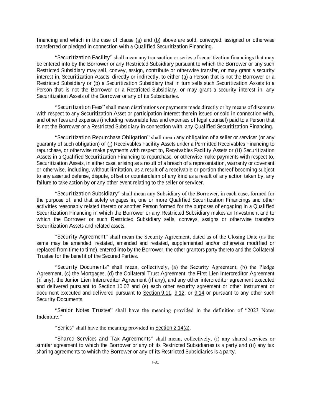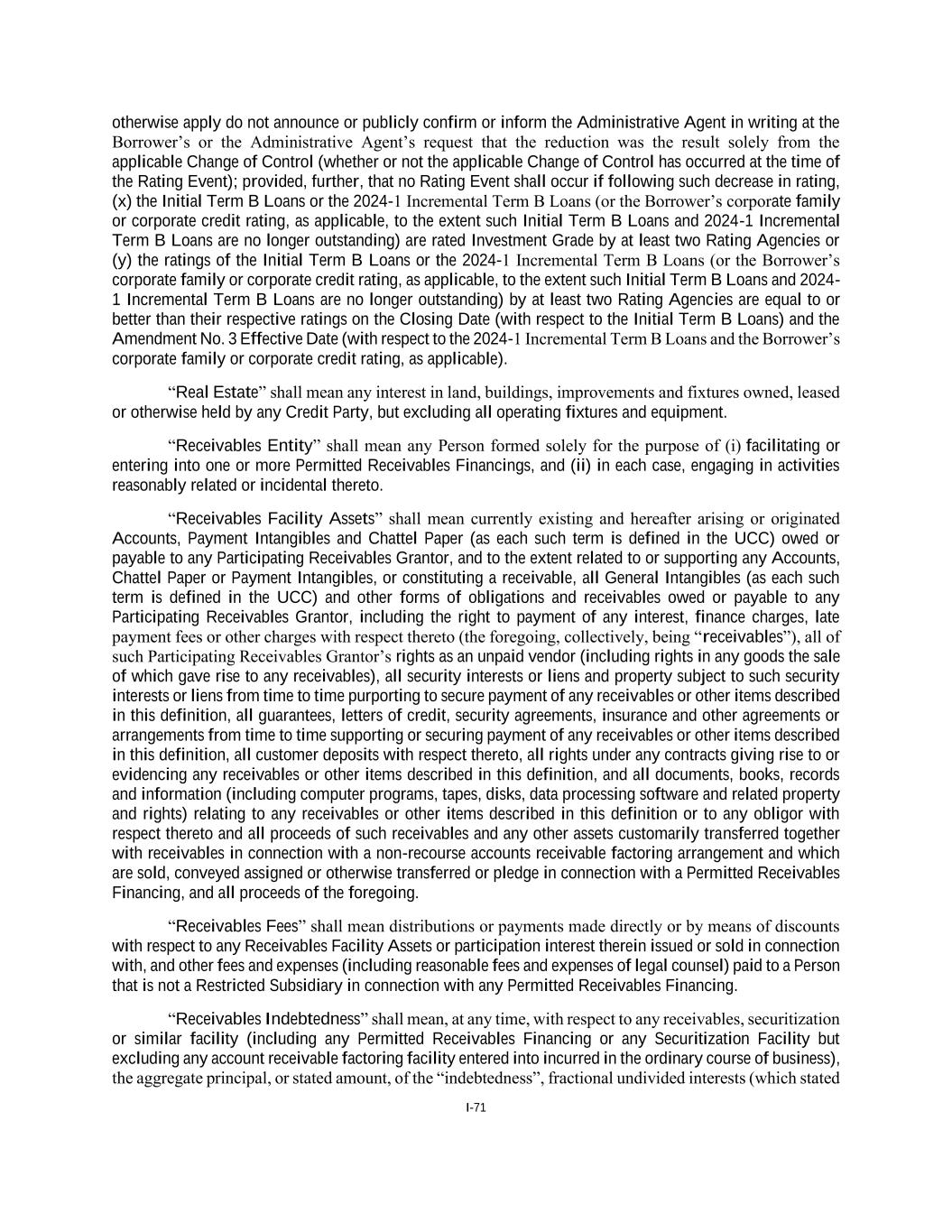 I-71 otherwise apply do not announce or publicly confirm or inform the Administrative Agent in writing at the Borrower’s or the Administrative Agent’s request that the reduction was the result solely from the applicable Change of Control (whether or not the applicable Change of Control has occurred at the time of the Rating Event); provided, further, that no Rating Event shall occur if following such decrease in rating, (x) the Initial Term B Loans or the 2024-1 Incremental Term B Loans (or the Borrower’s corporate family or corporate credit rating, as applicable, to the extent such Initial Term B Loans and 2024-1 Incremental Term B Loans are no longer outstanding) are rated Investment Grade by at least two Rating Agencies or (y) the ratings of the Initial Term B Loans or the 2024-1 Incremental Term B Loans (or the Borrower’s corporate family or corporate credit rating, as applicable, to the extent such Initial Term B Loans and 2024- 1 Incremental Term B Loans are no longer outstanding) by at least two Rating Agencies are equal to or better than their respective ratings on the Closing Date (with respect to the Initial Term B Loans) and the Amendment No. 3 Effective Date (with respect to the 2024-1 Incremental Term B Loans and the Borrower’s corporate family or corporate credit rating, as applicable). “Real Estate” shall mean any interest in land, buildings, improvements and fixtures owned, leased or otherwise held by any Credit Party, but excluding all operating fixtures and equipment. “Receivables Entity” shall mean any Person formed solely for the purpose of (i) facilitating or entering into one or more Permitted Receivables Financings, and (ii) in each case, engaging in activities reasonably related or incidental thereto. “Receivables Facility Assets” shall mean currently existing and hereafter arising or originated Accounts, Payment Intangibles and Chattel Paper (as each such term is defined in the UCC) owed or payable to any Participating Receivables Grantor, and to the extent related to or supporting any Accounts, Chattel Paper or Payment Intangibles, or constituting a receivable, all General Intangibles (as each such term is defined in the UCC) and other forms of obligations and receivables owed or payable to any Participating Receivables Grantor, including the right to payment of any interest, finance charges, late payment fees or other charges with respect thereto (the foregoing, collectively, being “receivables”), all of such Participating Receivables Grantor’s rights as an unpaid vendor (including rights in any goods the sale of which gave rise to any receivables), all security interests or liens and property subject to such security interests or liens from time to time purporting to secure payment of any receivables or other items described in this definition, all guarantees, letters of credit, security agreements, insurance and other agreements or arrangements from time to time supporting or securing payment of any receivables or other items described in this definition, all customer deposits with respect thereto, all rights under any contracts giving rise to or evidencing any receivables or other items described in this definition, and all documents, books, records and information (including computer programs, tapes, disks, data processing software and related property and rights) relating to any receivables or other items described in this definition or to any obligor with respect thereto and all proceeds of such receivables and any other assets customarily transferred together with receivables in connection with a non-recourse accounts receivable factoring arrangement and which are sold, conveyed assigned or otherwise transferred or pledge in connection with a Permitted Receivables Financing, and all proceeds of the foregoing. “Receivables Fees” shall mean distributions or payments made directly or by means of discounts with respect to any Receivables Facility Assets or participation interest therein issued or sold in connection with, and other fees and expenses (including reasonable fees and expenses of legal counsel) paid to a Person that is not a Restricted Subsidiary in connection with any Permitted Receivables Financing. “Receivables Indebtedness” shall mean, at any time, with respect to any receivables, securitization or similar facility (including any Permitted Receivables Financing or any Securitization Facility but excluding any account receivable factoring facility entered into incurred in the ordinary course of business), the aggregate principal, or stated amount, of the “indebtedness”, fractional undivided interests (which stated