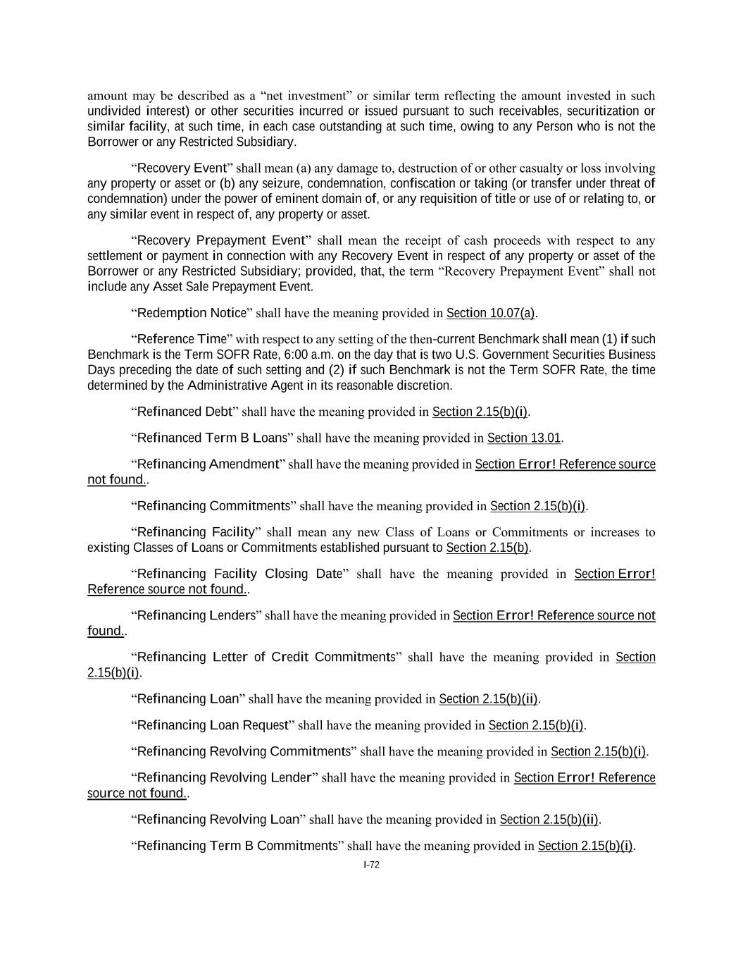 I-72 amount may be described as a “net investment” or similar term reflecting the amount invested in such undivided interest) or other securities incurred or issued pursuant to such receivables, securitization or similar facility, at such time, in each case outstanding at such time, owing to any Person who is not the Borrower or any Restricted Subsidiary. “Recovery Event” shall mean (a) any damage to, destruction of or other casualty or loss involving any property or asset or (b) any seizure, condemnation, confiscation or taking (or transfer under threat of condemnation) under the power of eminent domain of, or any requisition of title or use of or relating to, or any similar event in respect of, any property or asset. “Recovery Prepayment Event” shall mean the receipt of cash proceeds with respect to any settlement or payment in connection with any Recovery Event in respect of any property or asset of the Borrower or any Restricted Subsidiary; provided, that, the term “Recovery Prepayment Event” shall not include any Asset Sale Prepayment Event. “Redemption Notice” shall have the meaning provided in Section 10.07(a). “Reference Time” with respect to any setting of the then-current Benchmark shall mean (1) if such Benchmark is the Term SOFR Rate, 6:00 a.m. on the day that is two U.S. Government Securities Business Days preceding the date of such setting and (2) if such Benchmark is not the Term SOFR Rate, the time determined by the Administrative Agent in its reasonable discretion. “Refinanced Debt” shall have the meaning provided in Section 2.15(b)(i). “Refinanced Term B Loans” shall have the meaning provided in Section 13.01. “Refinancing Amendment” shall have the meaning provided in Section Error! Reference source not found.. “Refinancing Commitments” shall have the meaning provided in Section 2.15(b)(i). “Refinancing Facility” shall mean any new Class of Loans or Commitments or increases to existing Classes of Loans or Commitments established pursuant to Section 2.15(b). “Refinancing Facility Closing Date” shall have the meaning provided in Section Error! Reference source not found.. “Refinancing Lenders” shall have the meaning provided in Section Error! Reference source not found.. “Refinancing Letter of Credit Commitments” shall have the meaning provided in Section 2.15(b)(i). “Refinancing Loan” shall have the meaning provided in Section 2.15(b)(ii). “Refinancing Loan Request” shall have the meaning provided in Section 2.15(b)(i). “Refinancing Revolving Commitments” shall have the meaning provided in Section 2.15(b)(i). “Refinancing Revolving Lender” shall have the meaning provided in Section Error! Reference source not found.. “Refinancing Revolving Loan” shall have the meaning provided in Section 2.15(b)(ii). “Refinancing Term B Commitments” shall have the meaning provided in Section 2.15(b)(i).
