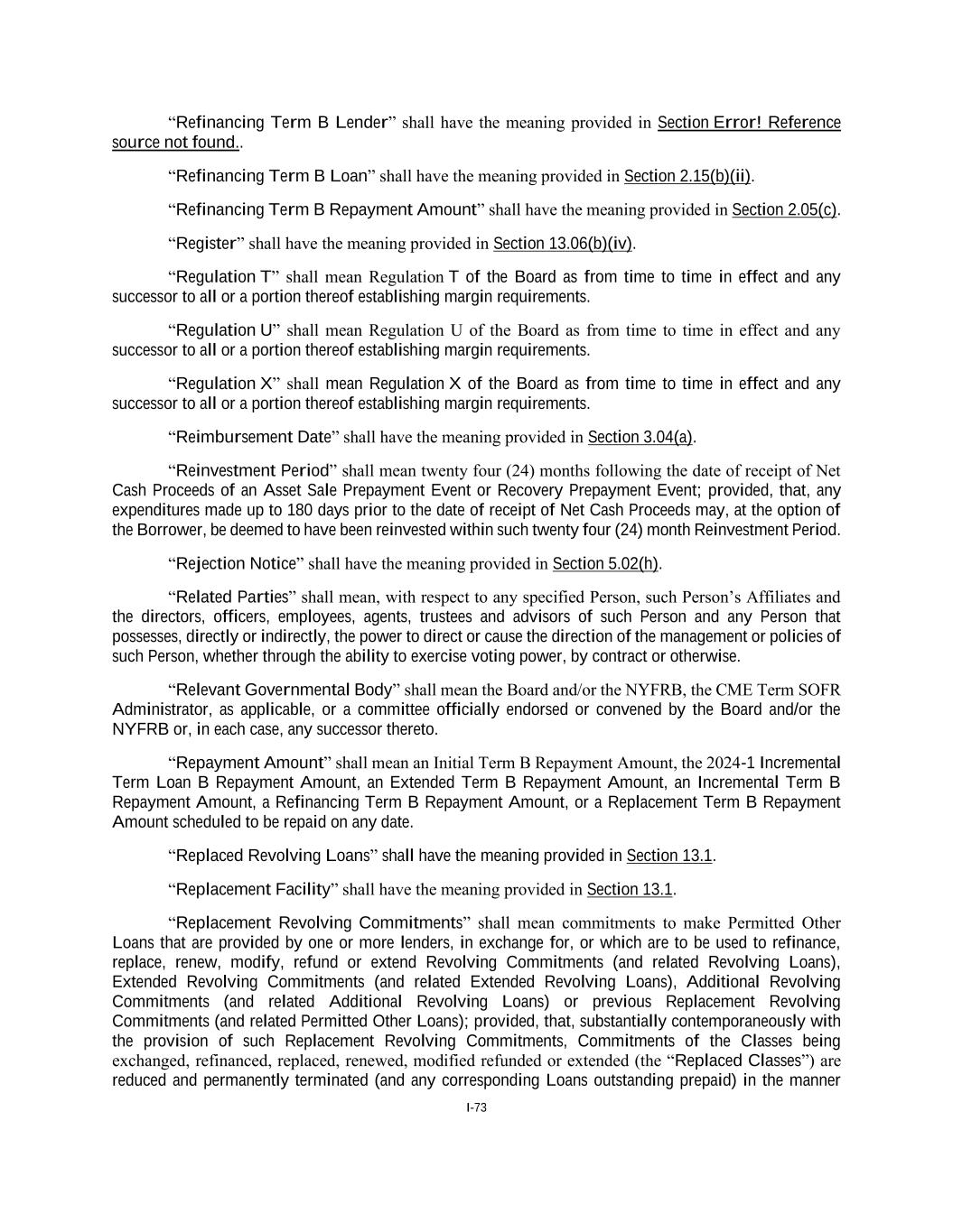 I-73 “Refinancing Term B Lender” shall have the meaning provided in Section Error! Reference source not found.. “Refinancing Term B Loan” shall have the meaning provided in Section 2.15(b)(ii). “Refinancing Term B Repayment Amount” shall have the meaning provided in Section 2.05(c). “Register” shall have the meaning provided in Section 13.06(b)(iv). “Regulation T” shall mean Regulation T of the Board as from time to time in effect and any successor to all or a portion thereof establishing margin requirements. “Regulation U” shall mean Regulation U of the Board as from time to time in effect and any successor to all or a portion thereof establishing margin requirements. “Regulation X” shall mean Regulation X of the Board as from time to time in effect and any successor to all or a portion thereof establishing margin requirements. “Reimbursement Date” shall have the meaning provided in Section 3.04(a). “Reinvestment Period” shall mean twenty four (24) months following the date of receipt of Net Cash Proceeds of an Asset Sale Prepayment Event or Recovery Prepayment Event; provided, that, any expenditures made up to 180 days prior to the date of receipt of Net Cash Proceeds may, at the option of the Borrower, be deemed to have been reinvested within such twenty four (24) month Reinvestment Period. “Rejection Notice” shall have the meaning provided in Section 5.02(h). “Related Parties” shall mean, with respect to any specified Person, such Person’s Affiliates and the directors, officers, employees, agents, trustees and advisors of such Person and any Person that possesses, directly or indirectly, the power to direct or cause the direction of the management or policies of such Person, whether through the ability to exercise voting power, by contract or otherwise. “Relevant Governmental Body” shall mean the Board and/or the NYFRB, the CME Term SOFR Administrator, as applicable, or a committee officially endorsed or convened by the Board and/or the NYFRB or, in each case, any successor thereto. “Repayment Amount” shall mean an Initial Term B Repayment Amount, the 2024-1 Incremental Term Loan B Repayment Amount, an Extended Term B Repayment Amount, an Incremental Term B Repayment Amount, a Refinancing Term B Repayment Amount, or a Replacement Term B Repayment Amount scheduled to be repaid on any date. “Replaced Revolving Loans” shall have the meaning provided in Section 13.1. “Replacement Facility” shall have the meaning provided in Section 13.1. “Replacement Revolving Commitments” shall mean commitments to make Permitted Other Loans that are provided by one or more lenders, in exchange for, or which are to be used to refinance, replace, renew, modify, refund or extend Revolving Commitments (and related Revolving Loans), Extended Revolving Commitments (and related Extended Revolving Loans), Additional Revolving Commitments (and related Additional Revolving Loans) or previous Replacement Revolving Commitments (and related Permitted Other Loans); provided, that, substantially contemporaneously with the provision of such Replacement Revolving Commitments, Commitments of the Classes being exchanged, refinanced, replaced, renewed, modified refunded or extended (the “Replaced Classes”) are reduced and permanently terminated (and any corresponding Loans outstanding prepaid) in the manner