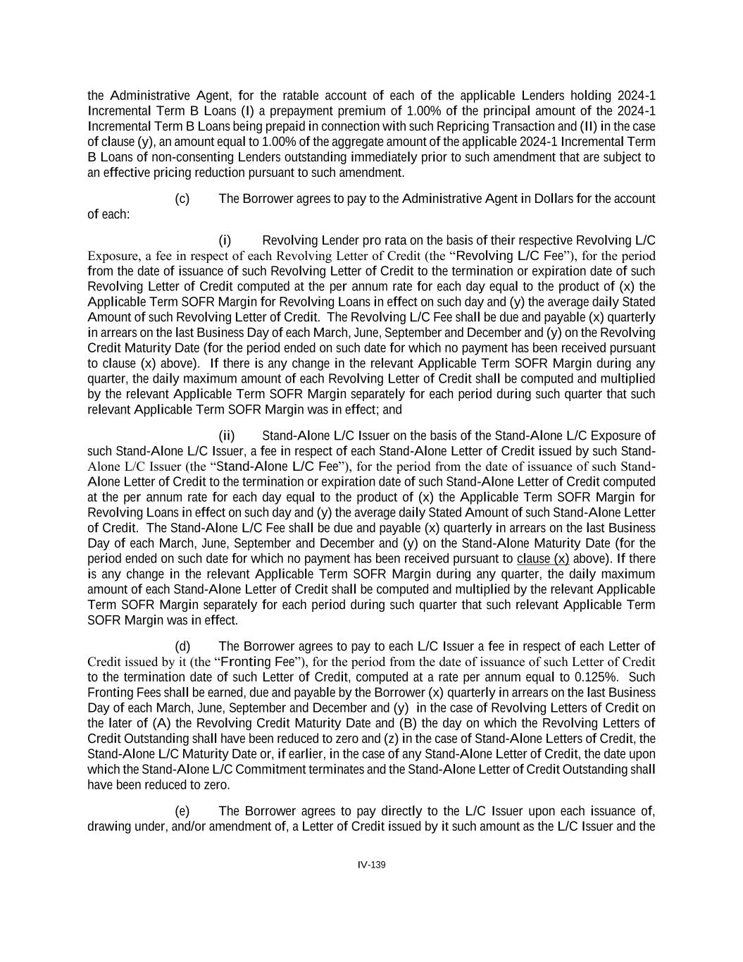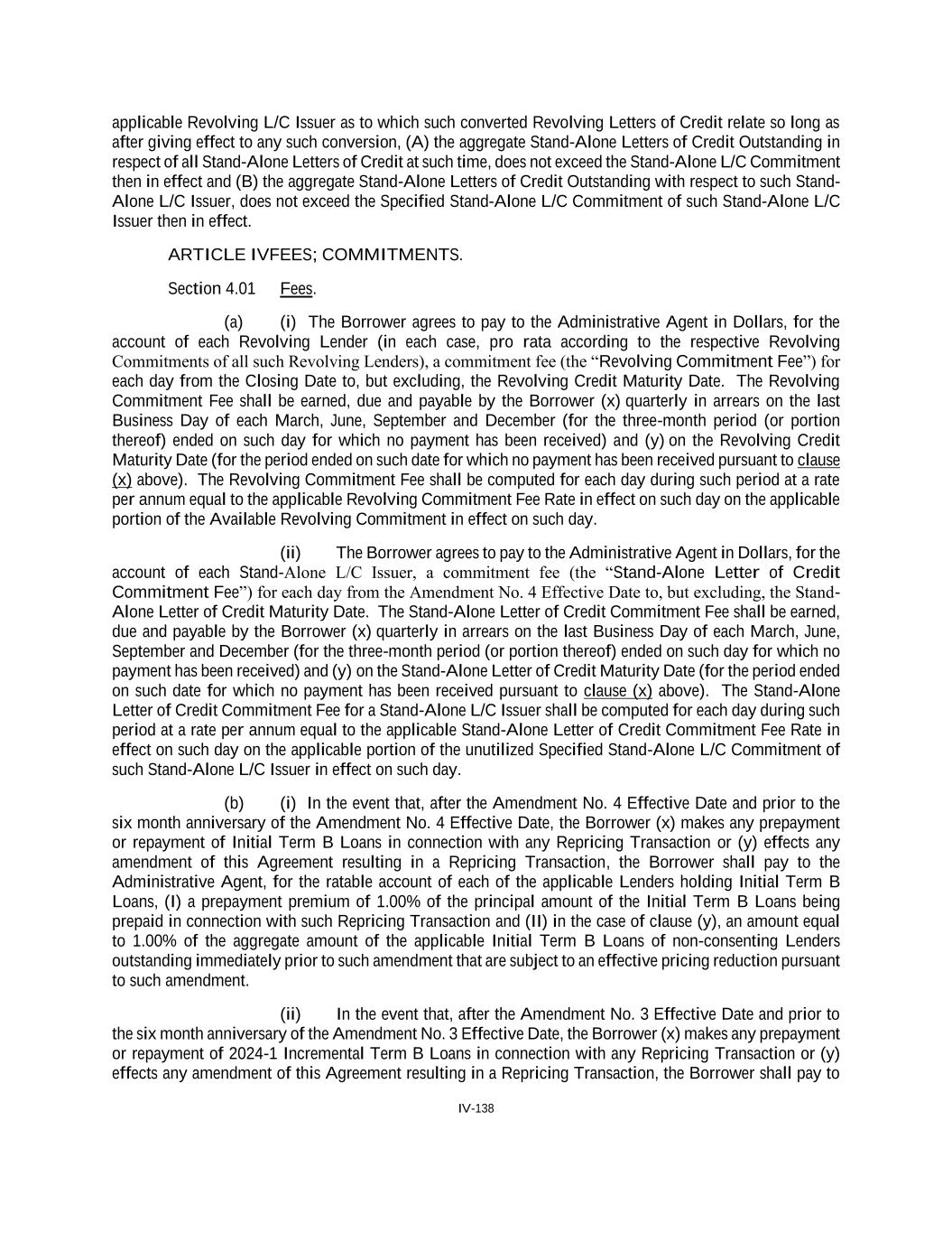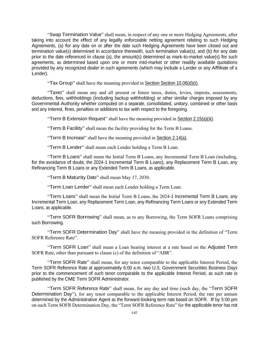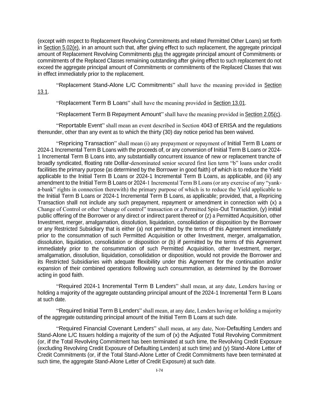 I-74 (except with respect to Replacement Revolving Commitments and related Permitted Other Loans) set forth in Section 5.02(e), in an amount such that, after giving effect to such replacement, the aggregate principal amount of Replacement Revolving Commitments plus the aggregate principal amount of Commitments or commitments of the Replaced Classes remaining outstanding after giving effect to such replacement do not exceed the aggregate principal amount of Commitments or commitments of the Replaced Classes that was in effect immediately prior to the replacement. “Replacement Stand-Alone L/C Commitments” shall have the meaning provided in Section 13.1. “Replacement Term B Loans” shall have the meaning provided in Section 13.01. “Replacement Term B Repayment Amount” shall have the meaning provided in Section 2.05(c). “Reportable Event” shall mean an event described in Section 4043 of ERISA and the regulations thereunder, other than any event as to which the thirty (30) day notice period has been waived. “Repricing Transaction” shall mean (i) any prepayment or repayment of Initial Term B Loans or 2024-1 Incremental Term B Loans with the proceeds of, or any conversion of Initial Term B Loans or 2024- 1 Incremental Term B Loans into, any substantially concurrent issuance of new or replacement tranche of broadly syndicated, floating rate Dollar-denominated senior secured first lien term “b” loans under credit facilities the primary purpose (as determined by the Borrower in good faith) of which is to reduce the Yield applicable to the Initial Term B Loans or 2024-1 Incremental Term B Loans, as applicable, and (ii) any amendment to the Initial Term B Loans or 2024-1 Incremental Term B Loans (or any exercise of any “yank- a-bank” rights in connection therewith) the primary purpose of which is to reduce the Yield applicable to the Initial Term B Loans or 2024-1 Incremental Term B Loans, as applicable; provided, that, a Repricing Transaction shall not include any such prepayment, repayment or amendment in connection with (x) a Change of Control or other “change of control” transaction or a Permitted Spin-Out Transaction, (y) initial public offering of the Borrower or any direct or indirect parent thereof or (z) a Permitted Acquisition, other Investment, merger, amalgamation, dissolution, liquidation, consolidation or disposition by the Borrower or any Restricted Subsidiary that is either (a) not permitted by the terms of this Agreement immediately prior to the consummation of such Permitted Acquisition or other Investment, merger, amalgamation, dissolution, liquidation, consolidation or disposition or (b) if permitted by the terms of this Agreement immediately prior to the consummation of such Permitted Acquisition, other Investment, merger, amalgamation, dissolution, liquidation, consolidation or disposition, would not provide the Borrower and its Restricted Subsidiaries with adequate flexibility under this Agreement for the continuation and/or expansion of their combined operations following such consummation, as determined by the Borrower acting in good faith. “Required 2024-1 Incremental Term B Lenders” shall mean, at any date, Lenders having or holding a majority of the aggregate outstanding principal amount of the 2024-1 Incremental Term B Loans at such date. “Required Initial Term B Lenders” shall mean, at any date, Lenders having or holding a majority of the aggregate outstanding principal amount of the Initial Term B Loans at such date. “Required Financial Covenant Lenders” shall mean, at any date, Non-Defaulting Lenders and Stand-Alone L/C Issuers holding a majority of the sum of (x) the Adjusted Total Revolving Commitment (or, if the Total Revolving Commitment has been terminated at such time, the Revolving Credit Exposure (excluding Revolving Credit Exposure of Defaulting Lenders) at such time) and (y) Stand-Alone Letter of Credit Commitments (or, if the Total Stand-Alone Letter of Credit Commitments have been terminated at such time, the aggregate Stand-Alone Letter of Credit Exposure) at such date.