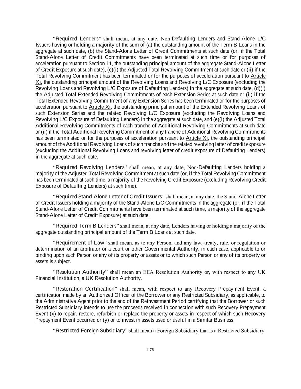 I-75 “Required Lenders” shall mean, at any date, Non-Defaulting Lenders and Stand-Alone L/C Issuers having or holding a majority of the sum of (a) the outstanding amount of the Term B Loans in the aggregate at such date, (b) the Stand-Alone Letter of Credit Commitments at such date (or, if the Total Stand-Alone Letter of Credit Commitments have been terminated at such time or for purposes of acceleration pursuant to Section 11, the outstanding principal amount of the aggregate Stand-Alone Letter of Credit Exposure at such date), (c)(i) the Adjusted Total Revolving Commitment at such date or (ii) if the Total Revolving Commitment has been terminated or for the purposes of acceleration pursuant to Article Xi, the outstanding principal amount of the Revolving Loans and Revolving L/C Exposure (excluding the Revolving Loans and Revolving L/C Exposure of Defaulting Lenders) in the aggregate at such date, (d)(i) the Adjusted Total Extended Revolving Commitments of each Extension Series at such date or (ii) if the Total Extended Revolving Commitment of any Extension Series has been terminated or for the purposes of acceleration pursuant to Article Xi, the outstanding principal amount of the Extended Revolving Loans of such Extension Series and the related Revolving L/C Exposure (excluding the Revolving Loans and Revolving L/C Exposure of Defaulting Lenders) in the aggregate at such date, and (e)(i) the Adjusted Total Additional Revolving Commitments of each tranche of Additional Revolving Commitments at such date or (ii) if the Total Additional Revolving Commitment of any tranche of Additional Revolving Commitments has been terminated or for the purposes of acceleration pursuant to Article Xi, the outstanding principal amount of the Additional Revolving Loans of such tranche and the related revolving letter of credit exposure (excluding the Additional Revolving Loans and revolving letter of credit exposure of Defaulting Lenders) in the aggregate at such date. “Required Revolving Lenders” shall mean, at any date, Non-Defaulting Lenders holding a majority of the Adjusted Total Revolving Commitment at such date (or, if the Total Revolving Commitment has been terminated at such time, a majority of the Revolving Credit Exposure (excluding Revolving Credit Exposure of Defaulting Lenders) at such time). “Required Stand-Alone Letter of Credit Issuers” shall mean, at any date, the Stand-Alone Letter of Credit Issuers holding a majority of the Stand-Alone L/C Commitments in the aggregate (or, if the Total Stand-Alone Letter of Credit Commitments have been terminated at such time, a majority of the aggregate Stand-Alone Letter of Credit Exposure) at such date. “Required Term B Lenders” shall mean, at any date, Lenders having or holding a majority of the aggregate outstanding principal amount of the Term B Loans at such date. “Requirement of Law” shall mean, as to any Person, and any law, treaty, rule, or regulation or determination of an arbitrator or a court or other Governmental Authority, in each case, applicable to or binding upon such Person or any of its property or assets or to which such Person or any of its property or assets is subject. “Resolution Authority” shall mean an EEA Resolution Authority or, with respect to any UK Financial Institution, a UK Resolution Authority. “Restoration Certification” shall mean, with respect to any Recovery Prepayment Event, a certification made by an Authorized Officer of the Borrower or any Restricted Subsidiary, as applicable, to the Administrative Agent prior to the end of the Reinvestment Period certifying that the Borrower or such Restricted Subsidiary intends to use the proceeds received in connection with such Recovery Prepayment Event (x) to repair, restore, refurbish or replace the property or assets in respect of which such Recovery Prepayment Event occurred or (y) or to invest in assets used or useful in a Similar Business. “Restricted Foreign Subsidiary” shall mean a Foreign Subsidiary that is a Restricted Subsidiary.