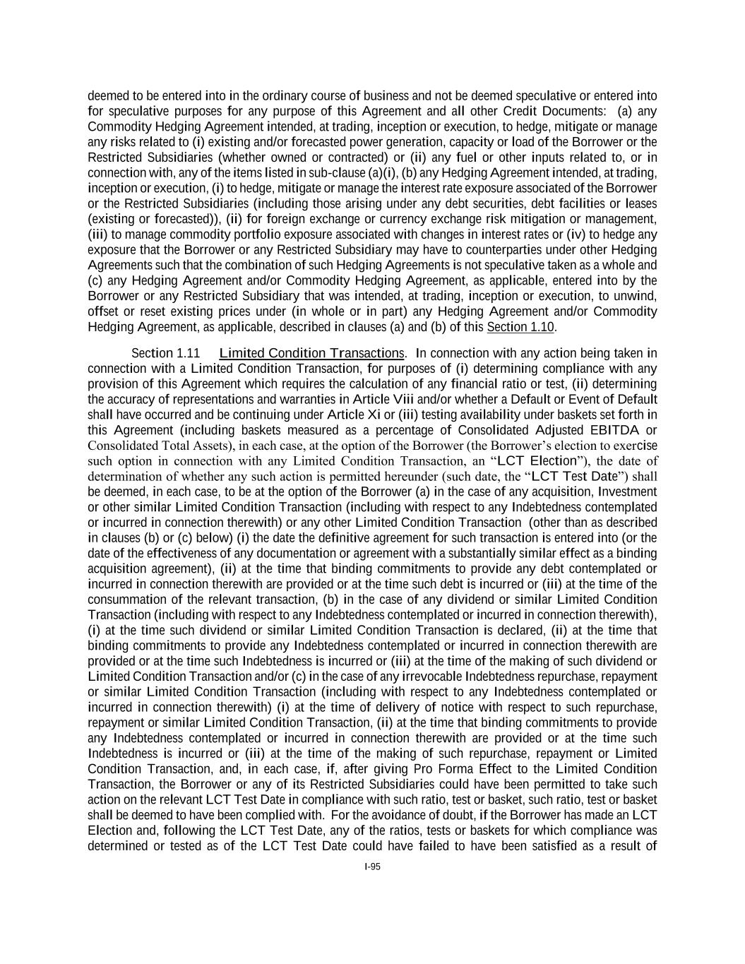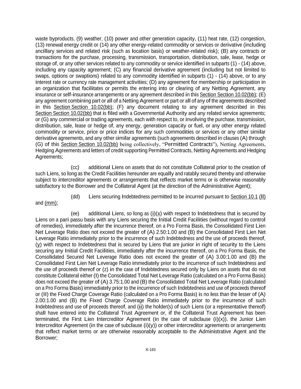X-183 waste byproducts, (9) weather, (10) power and other generation capacity, (11) heat rate, (12) congestion, (13) renewal energy credit or (14) any other energy-related commodity or services or derivative (including ancillary services and related risk (such as location basis) or weather-related risk); (B) any contracts or transactions for the purchase, processing, transmission, transportation, distribution, sale, lease, hedge or storage of, or any other services related to any commodity or service identified in subparts (1) - (14) above, including any capacity agreement; (C) any financial derivative agreement (including but not limited to swaps, options or swaptions) related to any commodity identified in subparts (1) - (14) above, or to any interest rate or currency rate management activities; (D) any agreement for membership or participation in an organization that facilitates or permits the entering into or clearing of any Netting Agreement, any insurance or self-insurance arrangements or any agreement described in this Section Section 10.02(bb); (E) any agreement combining part or all of a Netting Agreement or part or all of any of the agreements described in this Section Section 10.02(bb); (F) any document relating to any agreement described in this Section Section 10.02(bb) that is filed with a Governmental Authority and any related service agreements; or (G) any commercial or trading agreements, each with respect to, or involving the purchase, transmission, distribution, sale, lease or hedge of, any energy, generation capacity or fuel, or any other energy related commodity or service, price or price indices for any such commodities or services or any other similar derivative agreements, and any other similar agreements (such agreements described in clauses (A) through (G) of this Section Section 10.02(bb) being collectively, “Permitted Contracts”), Netting Agreements, Hedging Agreements and letters of credit supporting Permitted Contracts, Netting Agreements and Hedging Agreements; (cc) additional Liens on assets that do not constitute Collateral prior to the creation of such Liens, so long as the Credit Facilities hereunder are equally and ratably secured thereby and otherwise subject to intercreditor agreements or arrangements that reflects market terms or is otherwise reasonably satisfactory to the Borrower and the Collateral Agent (at the direction of the Administrative Agent); (dd) Liens securing Indebtedness permitted to be incurred pursuant to Section 10.1 (ll) and (mm); (ee) additional Liens, so long as (i)(x) with respect to Indebtedness that is secured by Liens on a pari passu basis with any Liens securing the Initial Credit Facilities (without regard to control of remedies), immediately after the incurrence thereof, on a Pro Forma Basis, the Consolidated First Lien Net Leverage Ratio does not exceed the greater of (A) 2.50:1.00 and (B) the Consolidated First Lien Net Leverage Ratio immediately prior to the incurrence of such Indebtedness and the use of proceeds thereof, (y) with respect to Indebtedness that is secured by Liens that are junior in right of security to the Liens securing any Initial Credit Facilities, immediately after the incurrence thereof, on a Pro Forma Basis, the Consolidated Secured Net Leverage Ratio does not exceed the greater of (A) 3.00:1.00 and (B) the Consolidated First Lien Net Leverage Ratio immediately prior to the incurrence of such Indebtedness and the use of proceeds thereof or (z) in the case of Indebtedness secured only by Liens on assets that do not constitute Collateral either (I) the Consolidated Total Net Leverage Ratio (calculated on a Pro Forma Basis) does not exceed the greater of (A) 3.75:1.00 and (B) the Consolidated Total Net Leverage Ratio (calculated on a Pro Forma Basis) immediately prior to the incurrence of such Indebtedness and use of proceeds thereof or (II) the Fixed Charge Coverage Ratio (calculated on a Pro Forma Basis) is no less than the lesser of (A) 2.00:1.00 and (B) the Fixed Charge Coverage Ratio immediately prior to the incurrence of such Indebtedness and use of proceeds thereof, and (ii) the holder(s) of such Liens (or a representative thereof) shall have entered into the Collateral Trust Agreement or, if the Collateral Trust Agreement has been terminated, the First Lien Intercreditor Agreement (in the case of subclause (i)(x)), the Junior Lien Intercreditor Agreement (in the case of subclause (i)(y)) or other intercreditor agreements or arrangements that reflect market terms or are otherwise reasonably acceptable to the Administrative Agent and the Borrower;