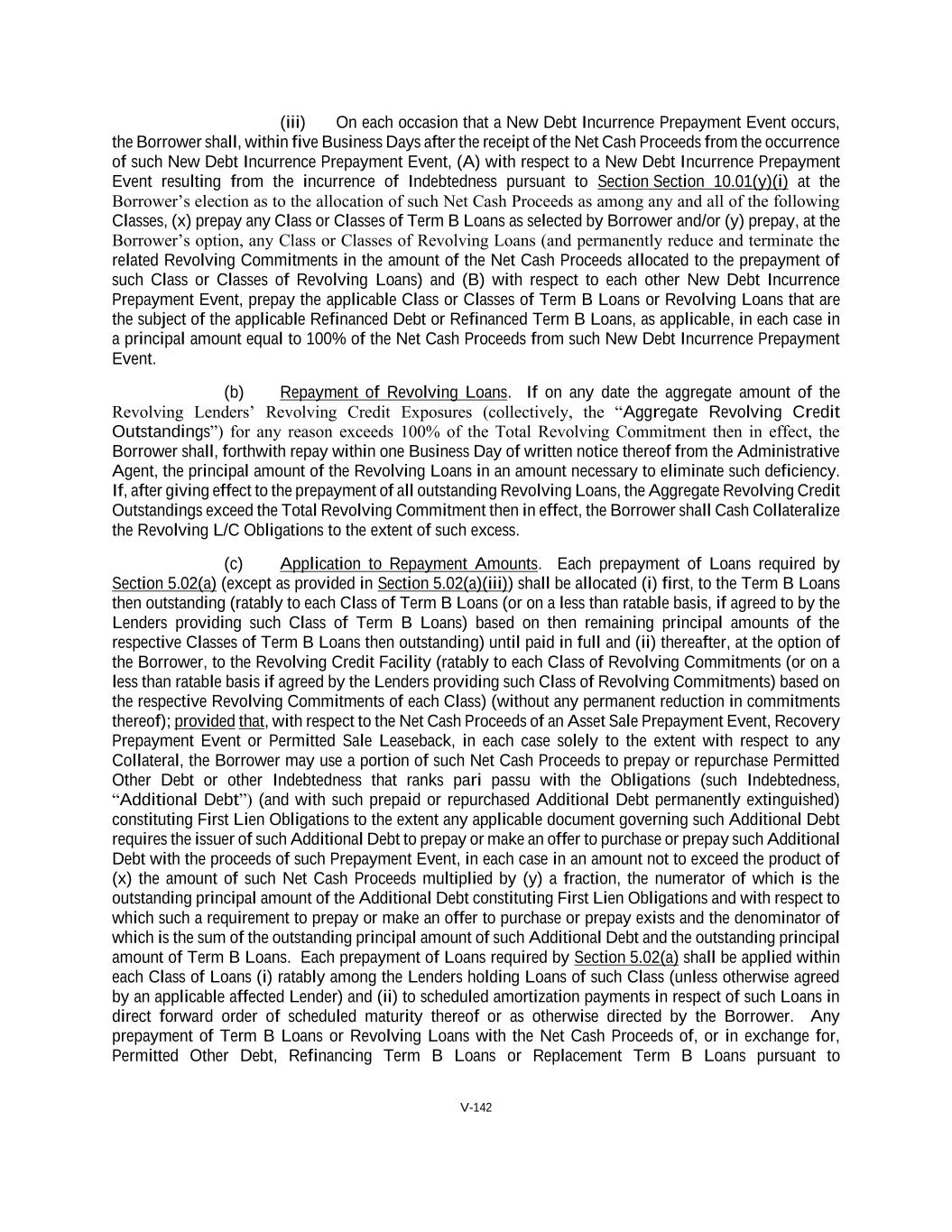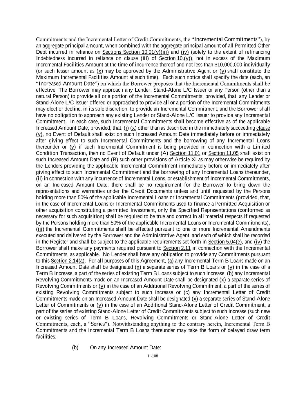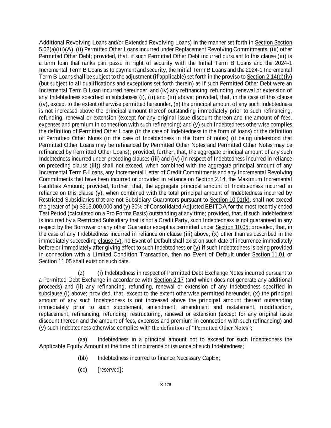 X-176 Additional Revolving Loans and/or Extended Revolving Loans) in the manner set forth in Section Section 5.02(a)(iii)(A), (ii) Permitted Other Loans incurred under Replacement Revolving Commitments, (iii) other Permitted Other Debt; provided, that, if such Permitted Other Debt incurred pursuant to this clause (iii) is a term loan that ranks pari passu in right of security with the Initial Term B Loans and the 2024-1 Incremental Term B Loans as to payment and security, the Initial Term B Loans and the 2024-1 Incremental Term B Loans shall be subject to the adjustment (if applicable) set forth in the proviso to Section 2.14(d)(iv) (but subject to all qualifications and exceptions set forth therein) as if such Permitted Other Debt were an Incremental Term B Loan incurred hereunder, and (iv) any refinancing, refunding, renewal or extension of any Indebtedness specified in subclauses (i), (ii) and (iii) above; provided, that, in the case of this clause (iv), except to the extent otherwise permitted hereunder, (x) the principal amount of any such Indebtedness is not increased above the principal amount thereof outstanding immediately prior to such refinancing, refunding, renewal or extension (except for any original issue discount thereon and the amount of fees, expenses and premium in connection with such refinancing) and (y) such Indebtedness otherwise complies the definition of Permitted Other Loans (in the case of Indebtedness in the form of loans) or the definition of Permitted Other Notes (in the case of Indebtedness in the form of notes) (it being understood that Permitted Other Loans may be refinanced by Permitted Other Notes and Permitted Other Notes may be refinanced by Permitted Other Loans); provided, further, that, the aggregate principal amount of any such Indebtedness incurred under preceding clauses (iii) and (iv) (in respect of Indebtedness incurred in reliance on preceding clause (iii)) shall not exceed, when combined with the aggregate principal amount of any Incremental Term B Loans, any Incremental Letter of Credit Commitments and any Incremental Revolving Commitments that have been incurred or provided in reliance on Section 2.14, the Maximum Incremental Facilities Amount; provided, further, that, the aggregate principal amount of Indebtedness incurred in reliance on this clause (y), when combined with the total principal amount of Indebtedness incurred by Restricted Subsidiaries that are not Subsidiary Guarantors pursuant to Section 10.01(k), shall not exceed the greater of (x) $315,000,000 and (y) 30% of Consolidated Adjusted EBITDA for the most recently ended Test Period (calculated on a Pro Forma Basis) outstanding at any time; provided, that, if such Indebtedness is incurred by a Restricted Subsidiary that is not a Credit Party, such Indebtedness is not guaranteed in any respect by the Borrower or any other Guarantor except as permitted under Section 10.05; provided, that, in the case of any Indebtedness incurred in reliance on clause (iii) above, (x) other than as described in the immediately succeeding clause (y), no Event of Default shall exist on such date of incurrence immediately before or immediately after giving effect to such Indebtedness or (y) if such Indebtedness is being provided in connection with a Limited Condition Transaction, then no Event of Default under Section 11.01 or Section 11.05 shall exist on such date. (z) (i) Indebtedness in respect of Permitted Debt Exchange Notes incurred pursuant to a Permitted Debt Exchange in accordance with Section 2.17 (and which does not generate any additional proceeds) and (ii) any refinancing, refunding, renewal or extension of any Indebtedness specified in subclause (i) above; provided, that, except to the extent otherwise permitted hereunder, (x) the principal amount of any such Indebtedness is not increased above the principal amount thereof outstanding immediately prior to such supplement, amendment, amendment and restatement, modification, replacement, refinancing, refunding, restructuring, renewal or extension (except for any original issue discount thereon and the amount of fees, expenses and premium in connection with such refinancing) and (y) such Indebtedness otherwise complies with the definition of “Permitted Other Notes”; (aa) Indebtedness in a principal amount not to exceed for such Indebtedness the Applicable Equity Amount at the time of incurrence or issuance of such Indebtedness; (bb) Indebtedness incurred to finance Necessary CapEx; (cc) [reserved];