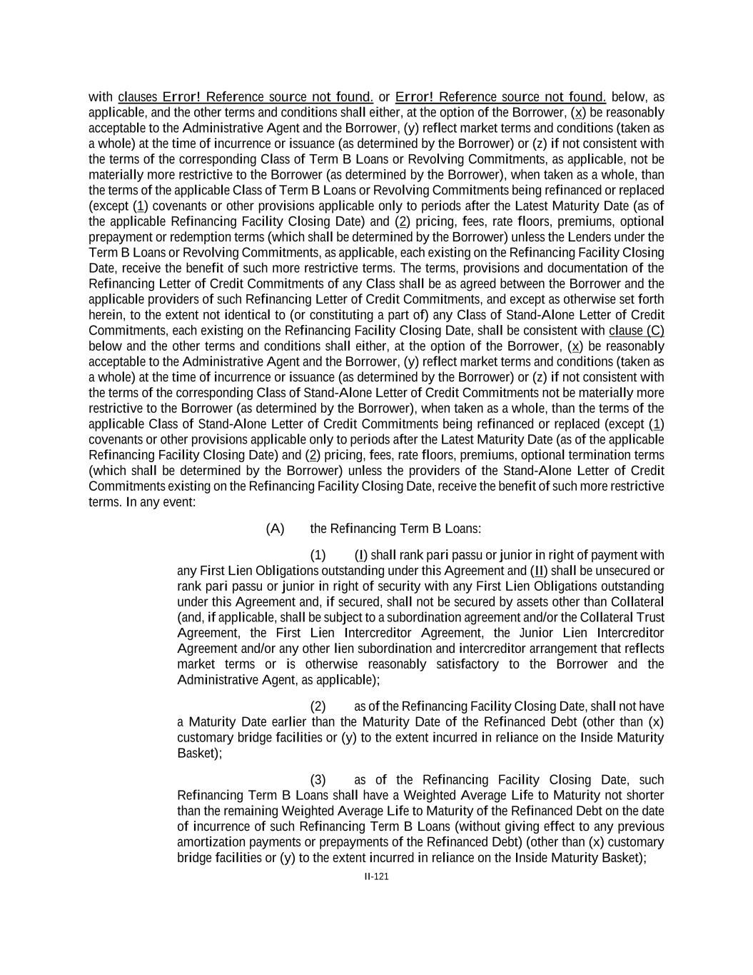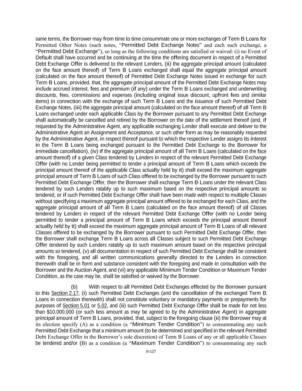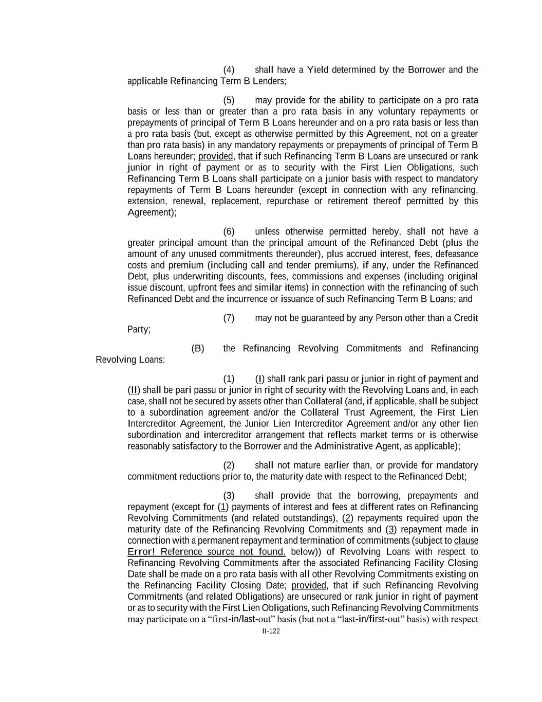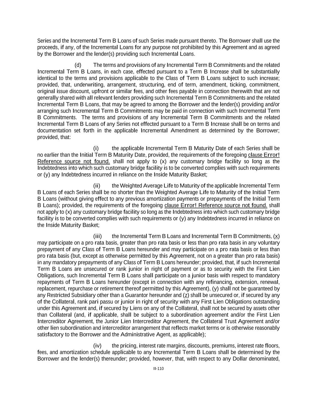 X-176 Additional Revolving Loans and/or Extended Revolving Loans) in the manner set forth in Section Section 5.02(a)(iii)(A), (ii) Permitted Other Loans incurred under Replacement Revolving Commitments, (iii) other Permitted Other Debt; provided, that, if such Permitted Other Debt incurred pursuant to this clause (iii) is a term loan that ranks pari passu in right of security with the Initial Term B Loans and the 2024-1 Incremental Term B Loans as to payment and security, the Initial Term B Loans and the 2024-1 Incremental Term B Loans shall be subject to the adjustment (if applicable) set forth in the proviso to Section 2.14(d)(iv) (but subject to all qualifications and exceptions set forth therein) as if such Permitted Other Debt were an Incremental Term B Loan incurred hereunder, and (iv) any refinancing, refunding, renewal or extension of any Indebtedness specified in subclauses (i), (ii) and (iii) above; provided, that, in the case of this clause (iv), except to the extent otherwise permitted hereunder, (x) the principal amount of any such Indebtedness is not increased above the principal amount thereof outstanding immediately prior to such refinancing, refunding, renewal or extension (except for any original issue discount thereon and the amount of fees, expenses and premium in connection with such refinancing) and (y) such Indebtedness otherwise complies the definition of Permitted Other Loans (in the case of Indebtedness in the form of loans) or the definition of Permitted Other Notes (in the case of Indebtedness in the form of notes) (it being understood that Permitted Other Loans may be refinanced by Permitted Other Notes and Permitted Other Notes may be refinanced by Permitted Other Loans); provided, further, that, the aggregate principal amount of any such Indebtedness incurred under preceding clauses (iii) and (iv) (in respect of Indebtedness incurred in reliance on preceding clause (iii)) shall not exceed, when combined with the aggregate principal amount of any Incremental Term B Loans, any Incremental Letter of Credit Commitments and any Incremental Revolving Commitments that have been incurred or provided in reliance on Section 2.14, the Maximum Incremental Facilities Amount; provided, further, that, the aggregate principal amount of Indebtedness incurred in reliance on this clause (y), when combined with the total principal amount of Indebtedness incurred by Restricted Subsidiaries that are not Subsidiary Guarantors pursuant to Section 10.01(k), shall not exceed the greater of (x) $315,000,000 and (y) 30% of Consolidated Adjusted EBITDA for the most recently ended Test Period (calculated on a Pro Forma Basis) outstanding at any time; provided, that, if such Indebtedness is incurred by a Restricted Subsidiary that is not a Credit Party, such Indebtedness is not guaranteed in any respect by the Borrower or any other Guarantor except as permitted under Section 10.05; provided, that, in the case of any Indebtedness incurred in reliance on clause (iii) above, (x) other than as described in the immediately succeeding clause (y), no Event of Default shall exist on such date of incurrence immediately before or immediately after giving effect to such Indebtedness or (y) if such Indebtedness is being provided in connection with a Limited Condition Transaction, then no Event of Default under Section 11.01 or Section 11.05 shall exist on such date. (z) (i) Indebtedness in respect of Permitted Debt Exchange Notes incurred pursuant to a Permitted Debt Exchange in accordance with Section 2.17 (and which does not generate any additional proceeds) and (ii) any refinancing, refunding, renewal or extension of any Indebtedness specified in subclause (i) above; provided, that, except to the extent otherwise permitted hereunder, (x) the principal amount of any such Indebtedness is not increased above the principal amount thereof outstanding immediately prior to such supplement, amendment, amendment and restatement, modification, replacement, refinancing, refunding, restructuring, renewal or extension (except for any original issue discount thereon and the amount of fees, expenses and premium in connection with such refinancing) and (y) such Indebtedness otherwise complies with the definition of “Permitted Other Notes”; (aa) Indebtedness in a principal amount not to exceed for such Indebtedness the Applicable Equity Amount at the time of incurrence or issuance of such Indebtedness; (bb) Indebtedness incurred to finance Necessary CapEx; (cc) [reserved];