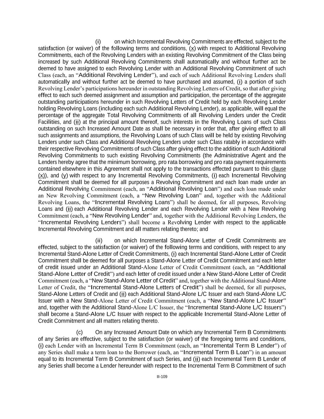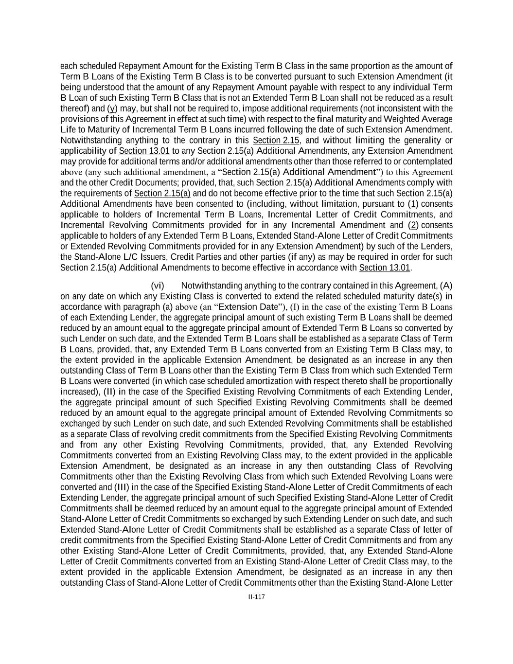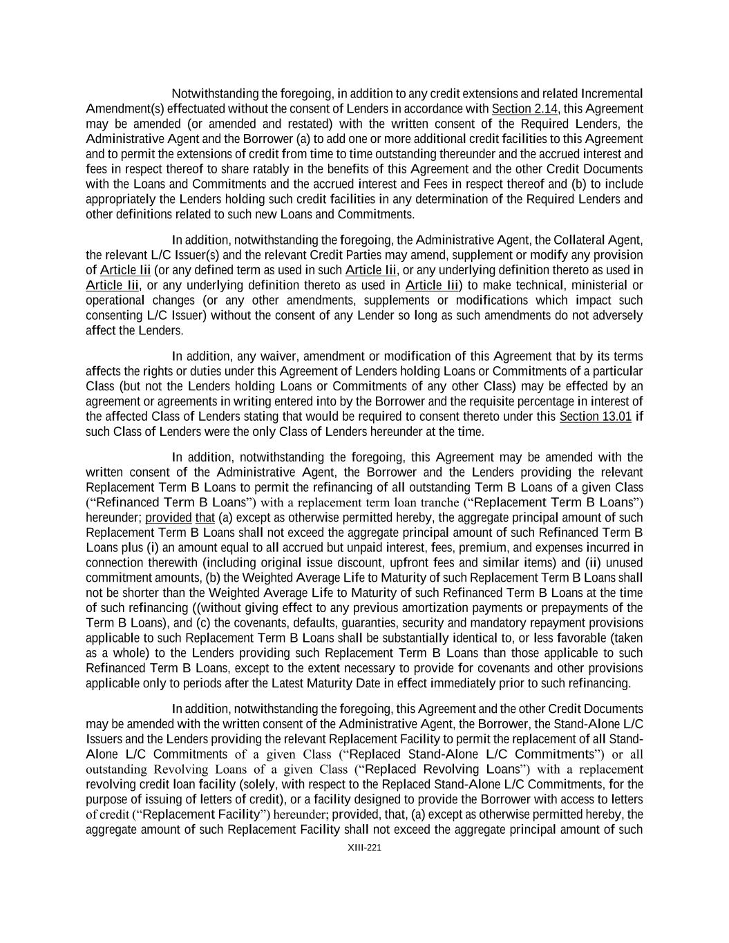XIII-221 Notwithstanding the foregoing, in addition to any credit extensions and related Incremental Amendment(s) effectuated without the consent of Lenders in accordance with Section 2.14, this Agreement may be amended (or amended and restated) with the written consent of the Required Lenders, the Administrative Agent and the Borrower (a) to add one or more additional credit facilities to this Agreement and to permit the extensions of credit from time to time outstanding thereunder and the accrued interest and fees in respect thereof to share ratably in the benefits of this Agreement and the other Credit Documents with the Loans and Commitments and the accrued interest and Fees in respect thereof and (b) to include appropriately the Lenders holding such credit facilities in any determination of the Required Lenders and other definitions related to such new Loans and Commitments. In addition, notwithstanding the foregoing, the Administrative Agent, the Collateral Agent, the relevant L/C Issuer(s) and the relevant Credit Parties may amend, supplement or modify any provision of Article Iii (or any defined term as used in such Article Iii, or any underlying definition thereto as used in Article Iii, or any underlying definition thereto as used in Article Iii) to make technical, ministerial or operational changes (or any other amendments, supplements or modifications which impact such consenting L/C Issuer) without the consent of any Lender so long as such amendments do not adversely affect the Lenders. In addition, any waiver, amendment or modification of this Agreement that by its terms affects the rights or duties under this Agreement of Lenders holding Loans or Commitments of a particular Class (but not the Lenders holding Loans or Commitments of any other Class) may be effected by an agreement or agreements in writing entered into by the Borrower and the requisite percentage in interest of the affected Class of Lenders stating that would be required to consent thereto under this Section 13.01 if such Class of Lenders were the only Class of Lenders hereunder at the time. In addition, notwithstanding the foregoing, this Agreement may be amended with the written consent of the Administrative Agent, the Borrower and the Lenders providing the relevant Replacement Term B Loans to permit the refinancing of all outstanding Term B Loans of a given Class (“Refinanced Term B Loans”) with a replacement term loan tranche (“Replacement Term B Loans”) hereunder; provided that (a) except as otherwise permitted hereby, the aggregate principal amount of such Replacement Term B Loans shall not exceed the aggregate principal amount of such Refinanced Term B Loans plus (i) an amount equal to all accrued but unpaid interest, fees, premium, and expenses incurred in connection therewith (including original issue discount, upfront fees and similar items) and (ii) unused commitment amounts, (b) the Weighted Average Life to Maturity of such Replacement Term B Loans shall not be shorter than the Weighted Average Life to Maturity of such Refinanced Term B Loans at the time of such refinancing ((without giving effect to any previous amortization payments or prepayments of the Term B Loans), and (c) the covenants, defaults, guaranties, security and mandatory repayment provisions applicable to such Replacement Term B Loans shall be substantially identical to, or less favorable (taken as a whole) to the Lenders providing such Replacement Term B Loans than those applicable to such Refinanced Term B Loans, except to the extent necessary to provide for covenants and other provisions applicable only to periods after the Latest Maturity Date in effect immediately prior to such refinancing. In addition, notwithstanding the foregoing, this Agreement and the other Credit Documents may be amended with the written consent of the Administrative Agent, the Borrower, the Stand-Alone L/C Issuers and the Lenders providing the relevant Replacement Facility to permit the replacement of all Stand- Alone L/C Commitments of a given Class (“Replaced Stand-Alone L/C Commitments”) or all outstanding Revolving Loans of a given Class (“Replaced Revolving Loans”) with a replacement revolving credit loan facility (solely, with respect to the Replaced Stand-Alone L/C Commitments, for the purpose of issuing of letters of credit), or a facility designed to provide the Borrower with access to letters of credit (“Replacement Facility”) hereunder; provided, that, (a) except as otherwise permitted hereby, the aggregate amount of such Replacement Facility shall not exceed the aggregate principal amount of such