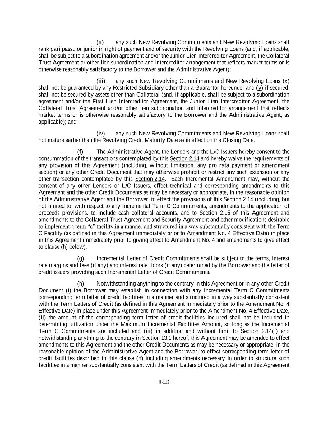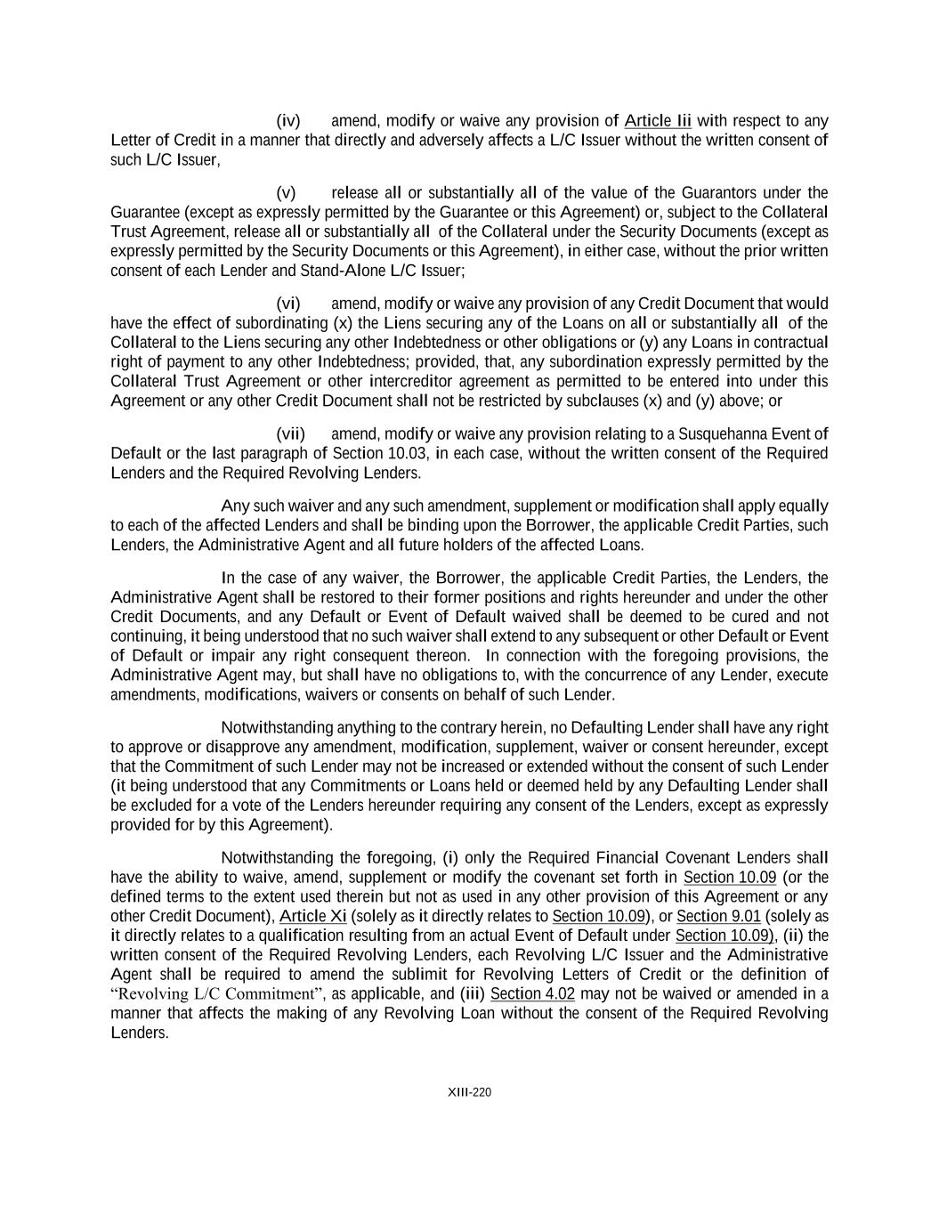 XIII-220 (iv) amend, modify or waive any provision of Article Iii with respect to any Letter of Credit in a manner that directly and adversely affects a L/C Issuer without the written consent of such L/C Issuer, (v) release all or substantially all of the value of the Guarantors under the Guarantee (except as expressly permitted by the Guarantee or this Agreement) or, subject to the Collateral Trust Agreement, release all or substantially all of the Collateral under the Security Documents (except as expressly permitted by the Security Documents or this Agreement), in either case, without the prior written consent of each Lender and Stand-Alone L/C Issuer; (vi) amend, modify or waive any provision of any Credit Document that would have the effect of subordinating (x) the Liens securing any of the Loans on all or substantially all of the Collateral to the Liens securing any other Indebtedness or other obligations or (y) any Loans in contractual right of payment to any other Indebtedness; provided, that, any subordination expressly permitted by the Collateral Trust Agreement or other intercreditor agreement as permitted to be entered into under this Agreement or any other Credit Document shall not be restricted by subclauses (x) and (y) above; or (vii) amend, modify or waive any provision relating to a Susquehanna Event of Default or the last paragraph of Section 10.03, in each case, without the written consent of the Required Lenders and the Required Revolving Lenders. Any such waiver and any such amendment, supplement or modification shall apply equally to each of the affected Lenders and shall be binding upon the Borrower, the applicable Credit Parties, such Lenders, the Administrative Agent and all future holders of the affected Loans. In the case of any waiver, the Borrower, the applicable Credit Parties, the Lenders, the Administrative Agent shall be restored to their former positions and rights hereunder and under the other Credit Documents, and any Default or Event of Default waived shall be deemed to be cured and not continuing, it being understood that no such waiver shall extend to any subsequent or other Default or Event of Default or impair any right consequent thereon. In connection with the foregoing provisions, the Administrative Agent may, but shall have no obligations to, with the concurrence of any Lender, execute amendments, modifications, waivers or consents on behalf of such Lender. Notwithstanding anything to the contrary herein, no Defaulting Lender shall have any right to approve or disapprove any amendment, modification, supplement, waiver or consent hereunder, except that the Commitment of such Lender may not be increased or extended without the consent of such Lender (it being understood that any Commitments or Loans held or deemed held by any Defaulting Lender shall be excluded for a vote of the Lenders hereunder requiring any consent of the Lenders, except as expressly provided for by this Agreement). Notwithstanding the foregoing, (i) only the Required Financial Covenant Lenders shall have the ability to waive, amend, supplement or modify the covenant set forth in Section 10.09 (or the defined terms to the extent used therein but not as used in any other provision of this Agreement or any other Credit Document), Article Xi (solely as it directly relates to Section 10.09), or Section 9.01 (solely as it directly relates to a qualification resulting from an actual Event of Default under Section 10.09), (ii) the written consent of the Required Revolving Lenders, each Revolving L/C Issuer and the Administrative Agent shall be required to amend the sublimit for Revolving Letters of Credit or the definition of “Revolving L/C Commitment”, as applicable, and (iii) Section 4.02 may not be waived or amended in a manner that affects the making of any Revolving Loan without the consent of the Required Revolving Lenders.