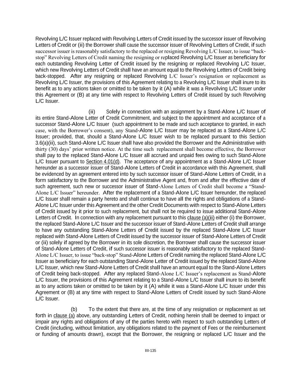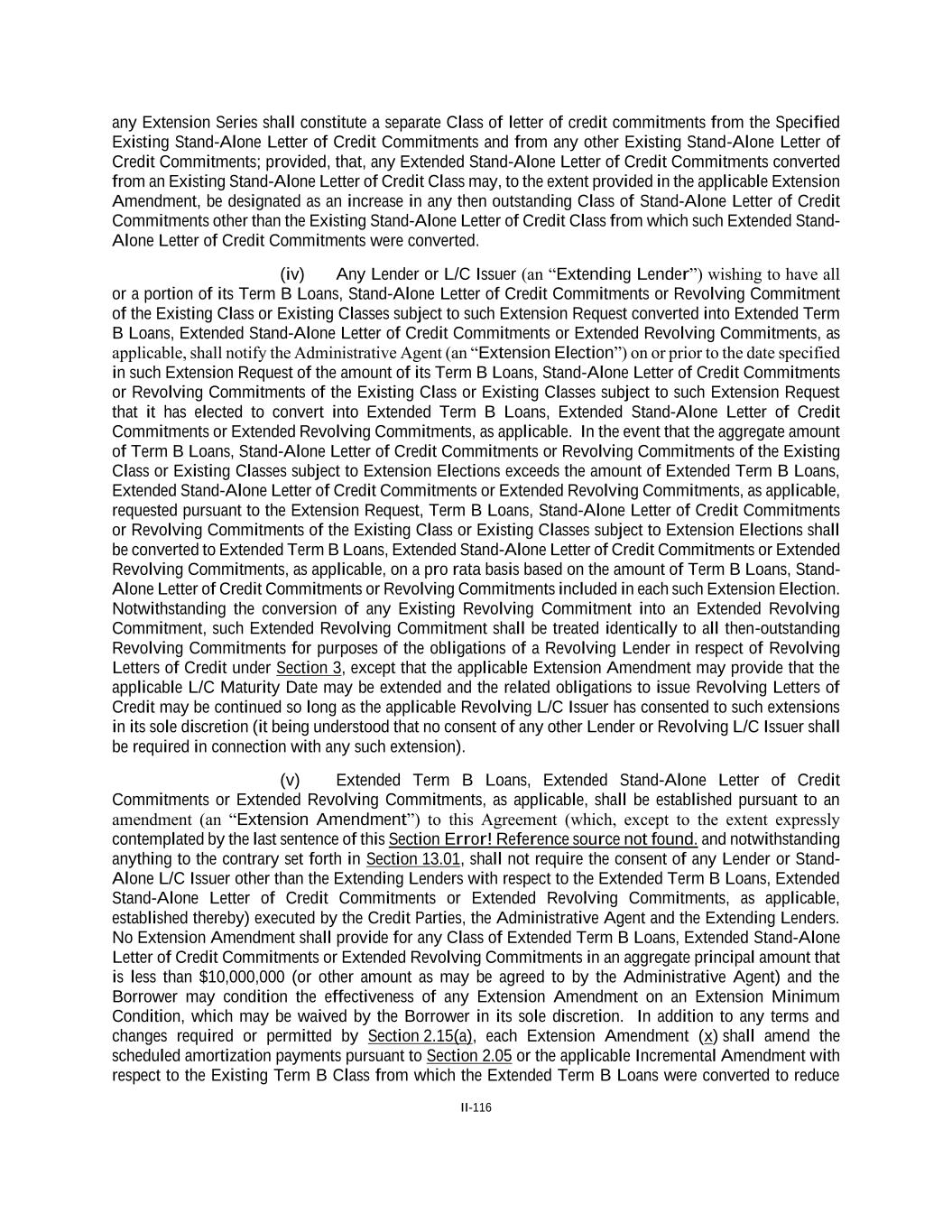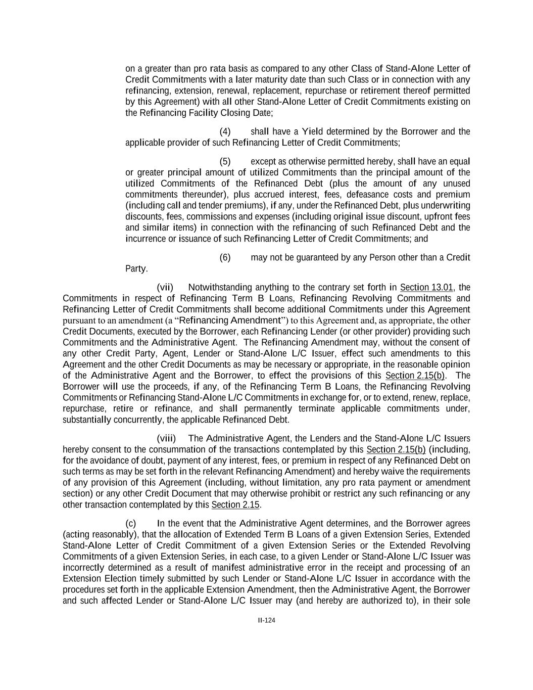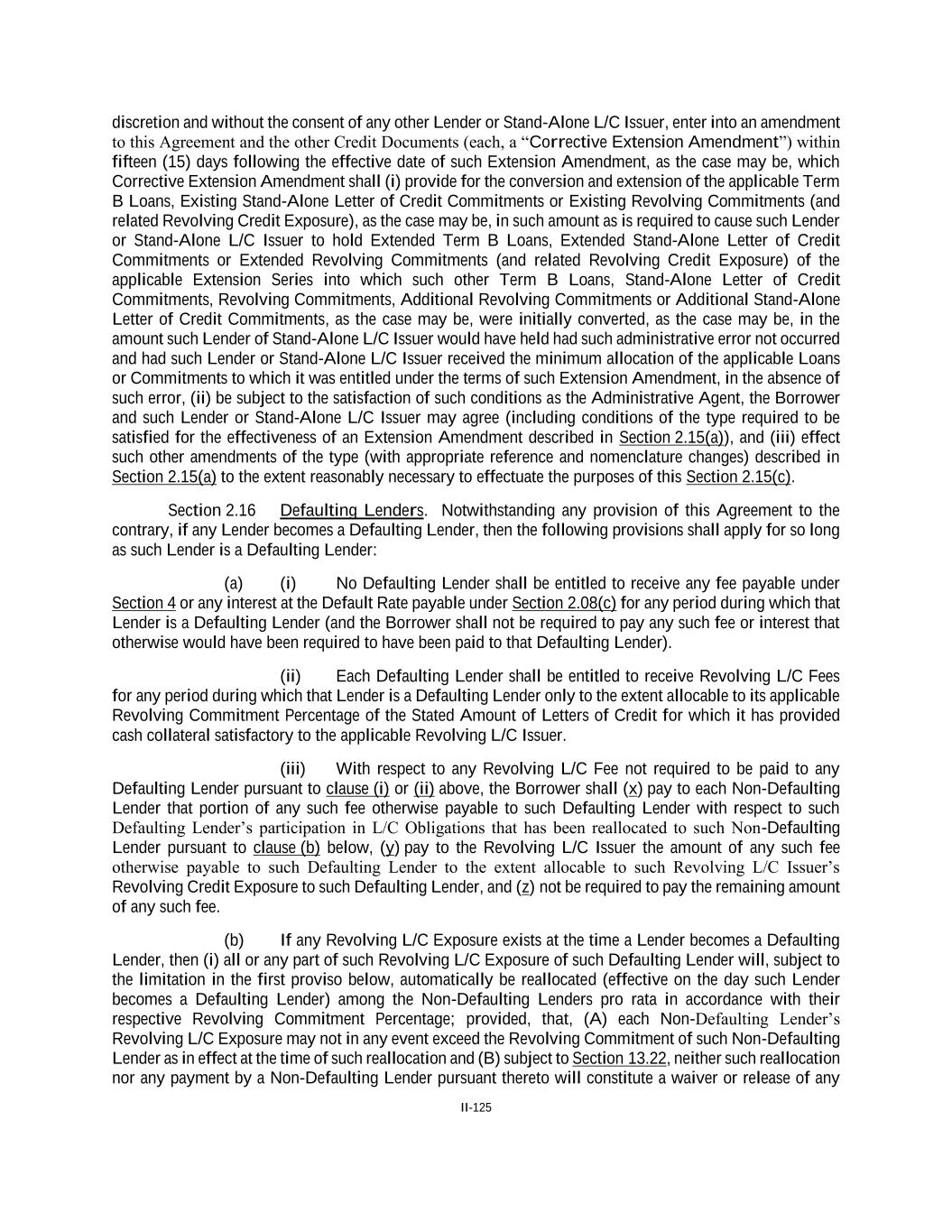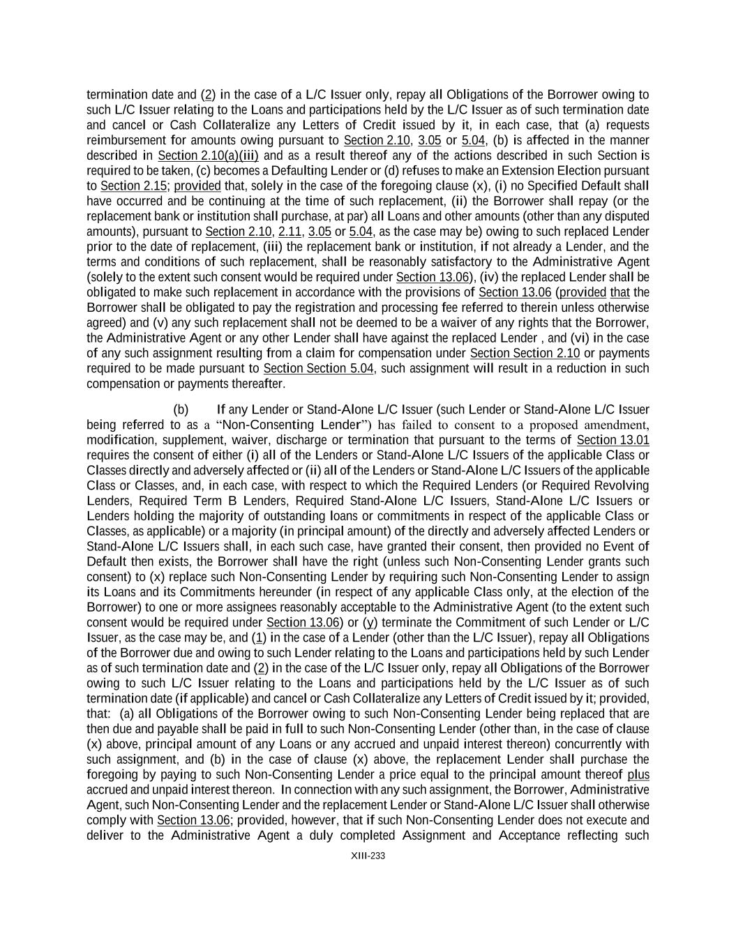 XIII-233 termination date and (2) in the case of a L/C Issuer only, repay all Obligations of the Borrower owing to such L/C Issuer relating to the Loans and participations held by the L/C Issuer as of such termination date and cancel or Cash Collateralize any Letters of Credit issued by it, in each case, that (a) requests reimbursement for amounts owing pursuant to Section 2.10, 3.05 or 5.04, (b) is affected in the manner described in Section 2.10(a)(iii) and as a result thereof any of the actions described in such Section is required to be taken, (c) becomes a Defaulting Lender or (d) refuses to make an Extension Election pursuant to Section 2.15; provided that, solely in the case of the foregoing clause (x), (i) no Specified Default shall have occurred and be continuing at the time of such replacement, (ii) the Borrower shall repay (or the replacement bank or institution shall purchase, at par) all Loans and other amounts (other than any disputed amounts), pursuant to Section 2.10, 2.11, 3.05 or 5.04, as the case may be) owing to such replaced Lender prior to the date of replacement, (iii) the replacement bank or institution, if not already a Lender, and the terms and conditions of such replacement, shall be reasonably satisfactory to the Administrative Agent (solely to the extent such consent would be required under Section 13.06), (iv) the replaced Lender shall be obligated to make such replacement in accordance with the provisions of Section 13.06 (provided that the Borrower shall be obligated to pay the registration and processing fee referred to therein unless otherwise agreed) and (v) any such replacement shall not be deemed to be a waiver of any rights that the Borrower, the Administrative Agent or any other Lender shall have against the replaced Lender , and (vi) in the case of any such assignment resulting from a claim for compensation under Section Section 2.10 or payments required to be made pursuant to Section Section 5.04, such assignment will result in a reduction in such compensation or payments thereafter. (b) If any Lender or Stand-Alone L/C Issuer (such Lender or Stand-Alone L/C Issuer being referred to as a “Non-Consenting Lender”) has failed to consent to a proposed amendment, modification, supplement, waiver, discharge or termination that pursuant to the terms of Section 13.01 requires the consent of either (i) all of the Lenders or Stand-Alone L/C Issuers of the applicable Class or Classes directly and adversely affected or (ii) all of the Lenders or Stand-Alone L/C Issuers of the applicable Class or Classes, and, in each case, with respect to which the Required Lenders (or Required Revolving Lenders, Required Term B Lenders, Required Stand-Alone L/C Issuers, Stand-Alone L/C Issuers or Lenders holding the majority of outstanding loans or commitments in respect of the applicable Class or Classes, as applicable) or a majority (in principal amount) of the directly and adversely affected Lenders or Stand-Alone L/C Issuers shall, in each such case, have granted their consent, then provided no Event of Default then exists, the Borrower shall have the right (unless such Non-Consenting Lender grants such consent) to (x) replace such Non-Consenting Lender by requiring such Non-Consenting Lender to assign its Loans and its Commitments hereunder (in respect of any applicable Class only, at the election of the Borrower) to one or more assignees reasonably acceptable to the Administrative Agent (to the extent such consent would be required under Section 13.06) or (y) terminate the Commitment of such Lender or L/C Issuer, as the case may be, and (1) in the case of a Lender (other than the L/C Issuer), repay all Obligations of the Borrower due and owing to such Lender relating to the Loans and participations held by such Lender as of such termination date and (2) in the case of the L/C Issuer only, repay all Obligations of the Borrower owing to such L/C Issuer relating to the Loans and participations held by the L/C Issuer as of such termination date (if applicable) and cancel or Cash Collateralize any Letters of Credit issued by it; provided, that: (a) all Obligations of the Borrower owing to such Non-Consenting Lender being replaced that are then due and payable shall be paid in full to such Non-Consenting Lender (other than, in the case of clause (x) above, principal amount of any Loans or any accrued and unpaid interest thereon) concurrently with such assignment, and (b) in the case of clause (x) above, the replacement Lender shall purchase the foregoing by paying to such Non-Consenting Lender a price equal to the principal amount thereof plus accrued and unpaid interest thereon. In connection with any such assignment, the Borrower, Administrative Agent, such Non-Consenting Lender and the replacement Lender or Stand-Alone L/C Issuer shall otherwise comply with Section 13.06; provided, however, that if such Non-Consenting Lender does not execute and deliver to the Administrative Agent a duly completed Assignment and Acceptance reflecting such