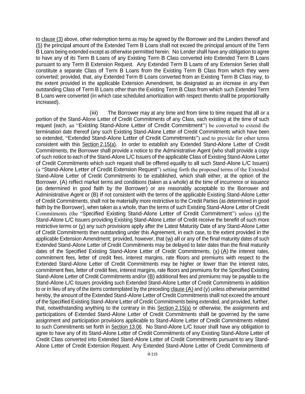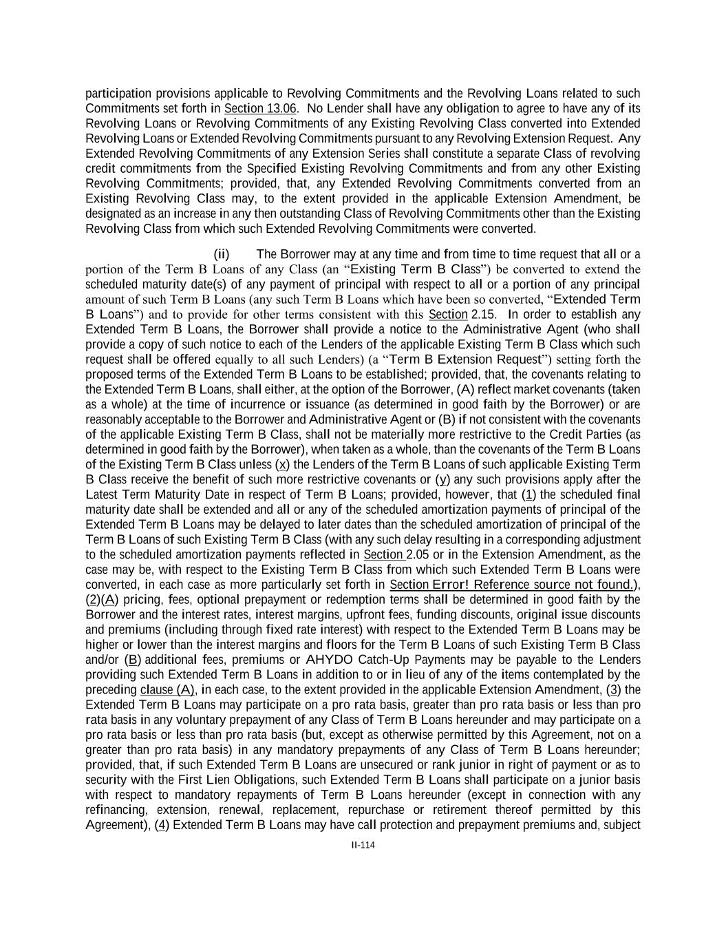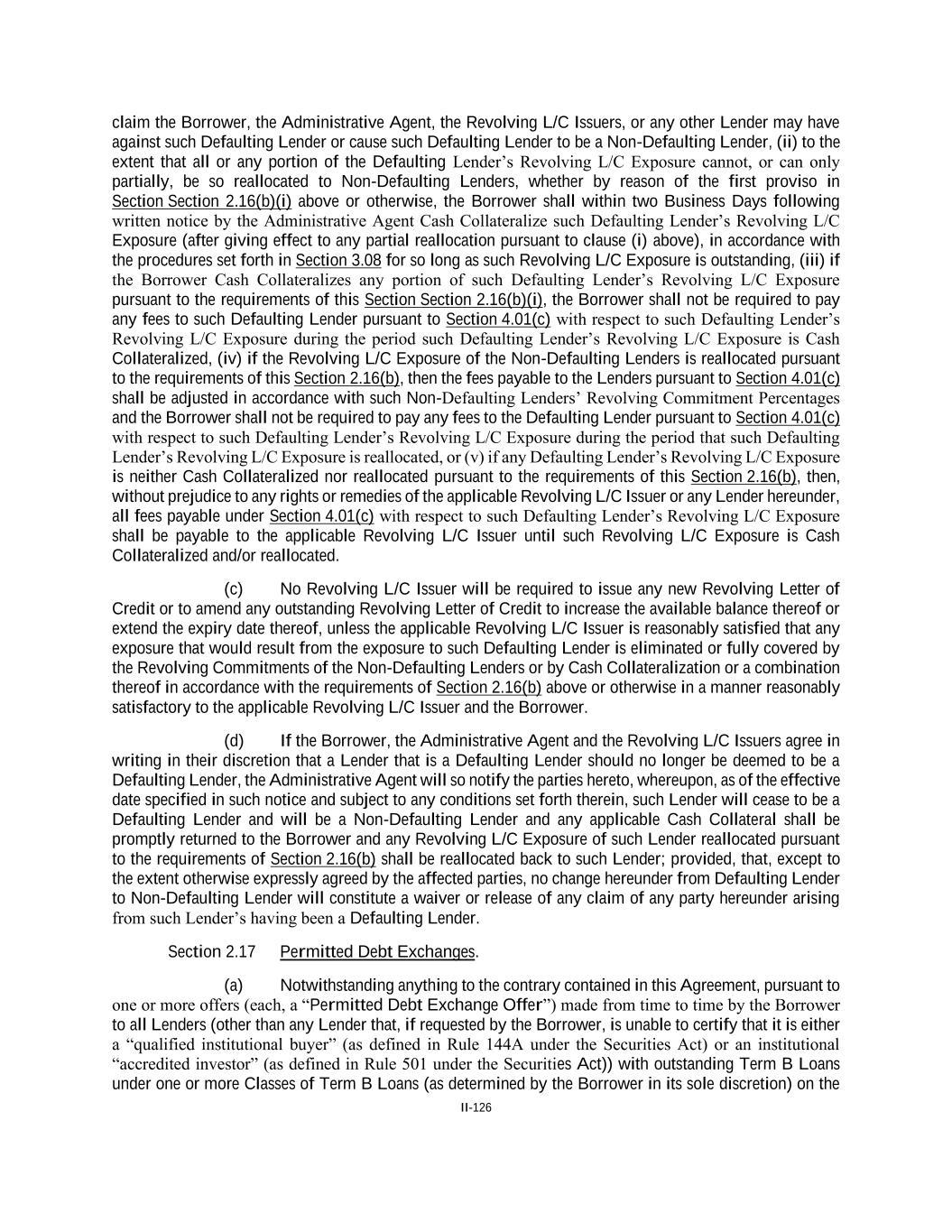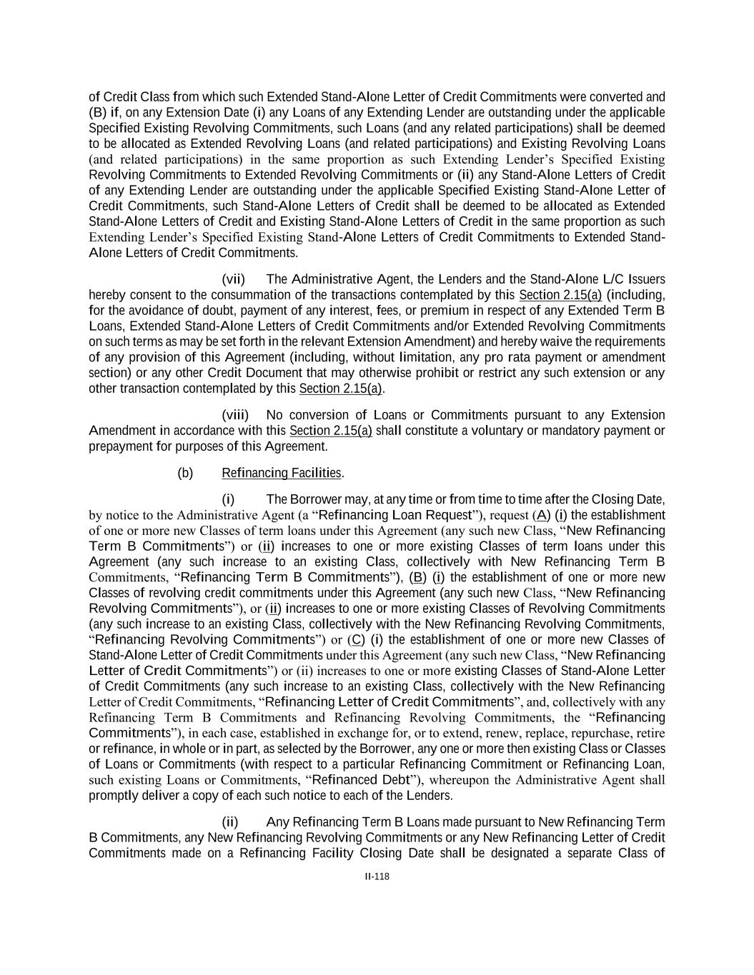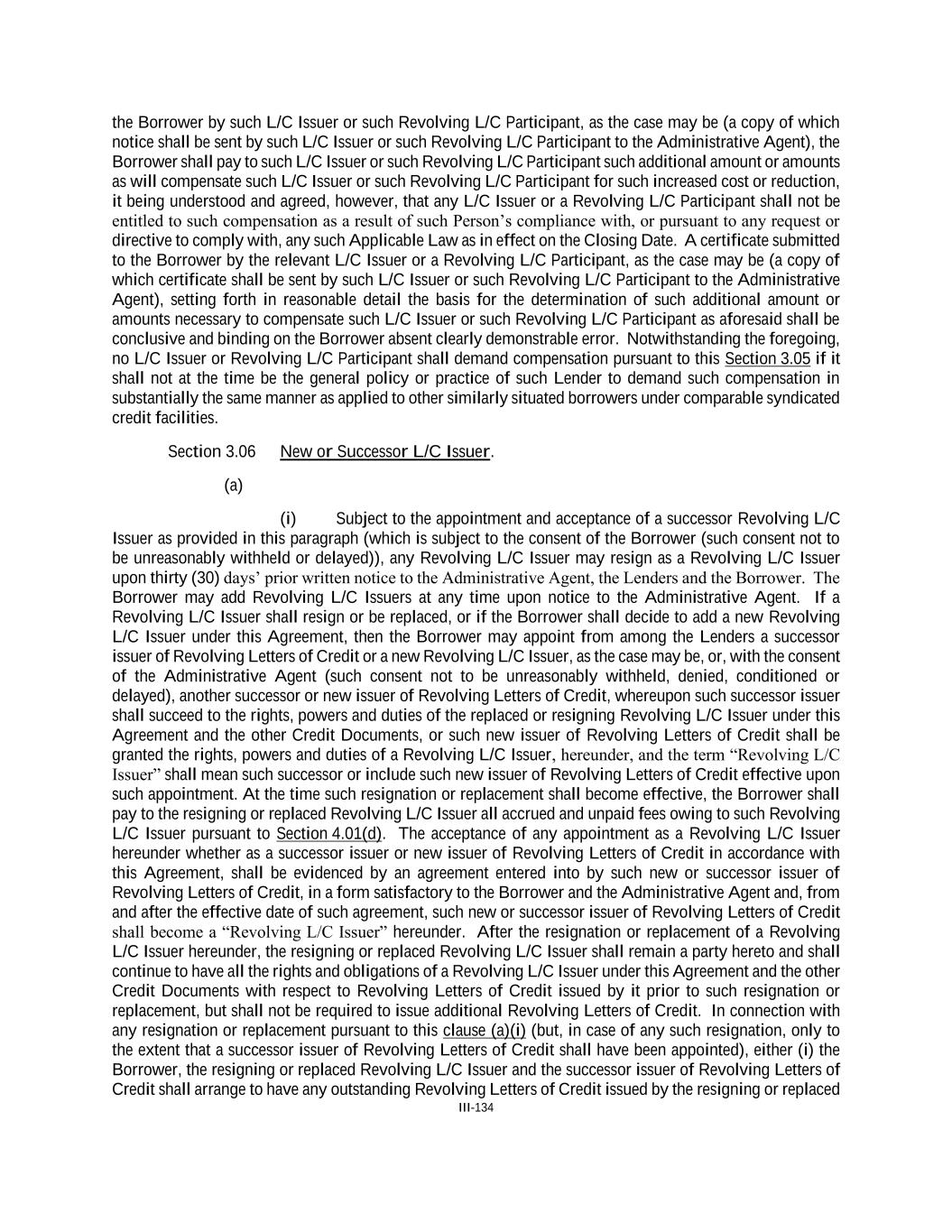 XIII-233 termination date and (2) in the case of a L/C Issuer only, repay all Obligations of the Borrower owing to such L/C Issuer relating to the Loans and participations held by the L/C Issuer as of such termination date and cancel or Cash Collateralize any Letters of Credit issued by it, in each case, that (a) requests reimbursement for amounts owing pursuant to Section 2.10, 3.05 or 5.04, (b) is affected in the manner described in Section 2.10(a)(iii) and as a result thereof any of the actions described in such Section is required to be taken, (c) becomes a Defaulting Lender or (d) refuses to make an Extension Election pursuant to Section 2.15; provided that, solely in the case of the foregoing clause (x), (i) no Specified Default shall have occurred and be continuing at the time of such replacement, (ii) the Borrower shall repay (or the replacement bank or institution shall purchase, at par) all Loans and other amounts (other than any disputed amounts), pursuant to Section 2.10, 2.11, 3.05 or 5.04, as the case may be) owing to such replaced Lender prior to the date of replacement, (iii) the replacement bank or institution, if not already a Lender, and the terms and conditions of such replacement, shall be reasonably satisfactory to the Administrative Agent (solely to the extent such consent would be required under Section 13.06), (iv) the replaced Lender shall be obligated to make such replacement in accordance with the provisions of Section 13.06 (provided that the Borrower shall be obligated to pay the registration and processing fee referred to therein unless otherwise agreed) and (v) any such replacement shall not be deemed to be a waiver of any rights that the Borrower, the Administrative Agent or any other Lender shall have against the replaced Lender , and (vi) in the case of any such assignment resulting from a claim for compensation under Section Section 2.10 or payments required to be made pursuant to Section Section 5.04, such assignment will result in a reduction in such compensation or payments thereafter. (b) If any Lender or Stand-Alone L/C Issuer (such Lender or Stand-Alone L/C Issuer being referred to as a “Non-Consenting Lender”) has failed to consent to a proposed amendment, modification, supplement, waiver, discharge or termination that pursuant to the terms of Section 13.01 requires the consent of either (i) all of the Lenders or Stand-Alone L/C Issuers of the applicable Class or Classes directly and adversely affected or (ii) all of the Lenders or Stand-Alone L/C Issuers of the applicable Class or Classes, and, in each case, with respect to which the Required Lenders (or Required Revolving Lenders, Required Term B Lenders, Required Stand-Alone L/C Issuers, Stand-Alone L/C Issuers or Lenders holding the majority of outstanding loans or commitments in respect of the applicable Class or Classes, as applicable) or a majority (in principal amount) of the directly and adversely affected Lenders or Stand-Alone L/C Issuers shall, in each such case, have granted their consent, then provided no Event of Default then exists, the Borrower shall have the right (unless such Non-Consenting Lender grants such consent) to (x) replace such Non-Consenting Lender by requiring such Non-Consenting Lender to assign its Loans and its Commitments hereunder (in respect of any applicable Class only, at the election of the Borrower) to one or more assignees reasonably acceptable to the Administrative Agent (to the extent such consent would be required under Section 13.06) or (y) terminate the Commitment of such Lender or L/C Issuer, as the case may be, and (1) in the case of a Lender (other than the L/C Issuer), repay all Obligations of the Borrower due and owing to such Lender relating to the Loans and participations held by such Lender as of such termination date and (2) in the case of the L/C Issuer only, repay all Obligations of the Borrower owing to such L/C Issuer relating to the Loans and participations held by the L/C Issuer as of such termination date (if applicable) and cancel or Cash Collateralize any Letters of Credit issued by it; provided, that: (a) all Obligations of the Borrower owing to such Non-Consenting Lender being replaced that are then due and payable shall be paid in full to such Non-Consenting Lender (other than, in the case of clause (x) above, principal amount of any Loans or any accrued and unpaid interest thereon) concurrently with such assignment, and (b) in the case of clause (x) above, the replacement Lender shall purchase the foregoing by paying to such Non-Consenting Lender a price equal to the principal amount thereof plus accrued and unpaid interest thereon. In connection with any such assignment, the Borrower, Administrative Agent, such Non-Consenting Lender and the replacement Lender or Stand-Alone L/C Issuer shall otherwise comply with Section 13.06; provided, however, that if such Non-Consenting Lender does not execute and deliver to the Administrative Agent a duly completed Assignment and Acceptance reflecting such