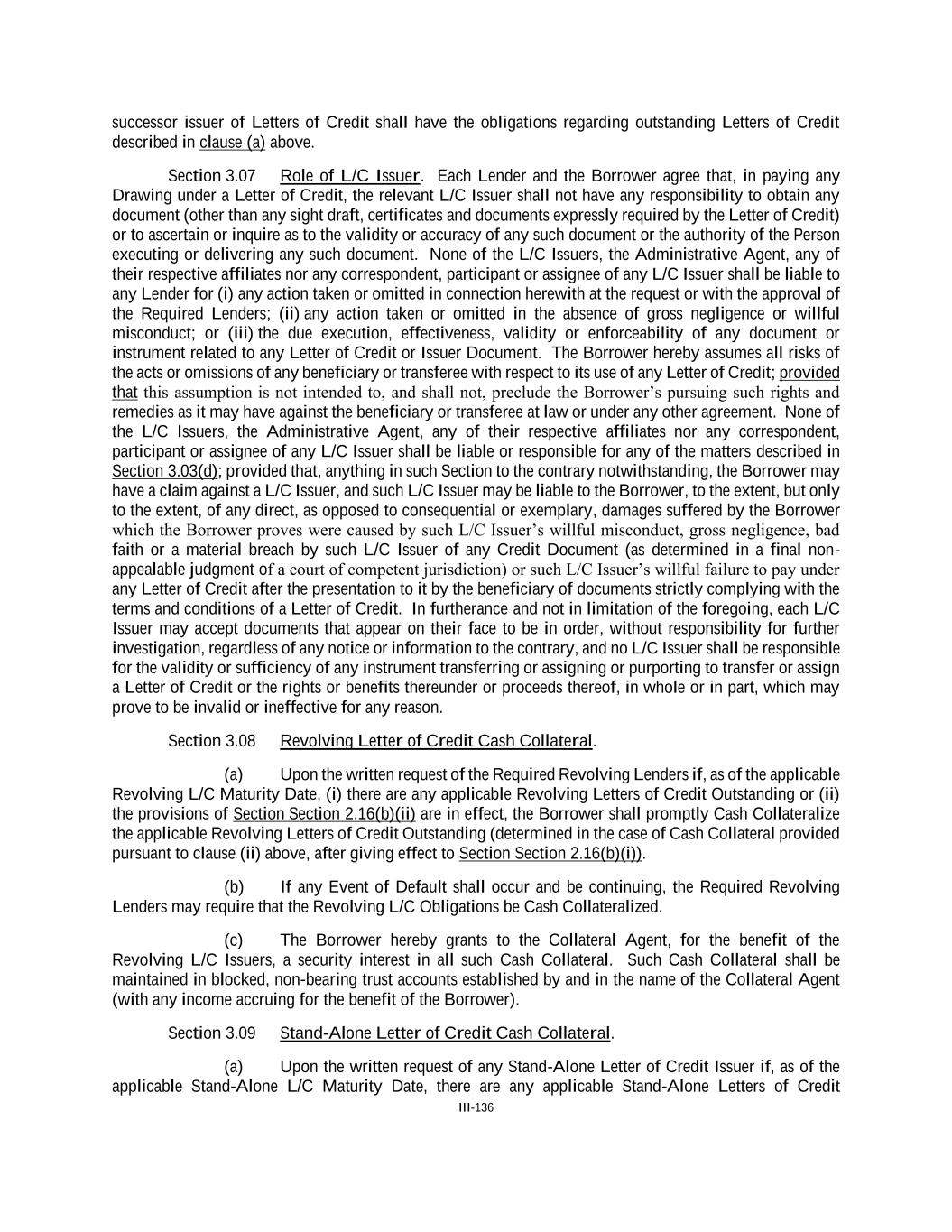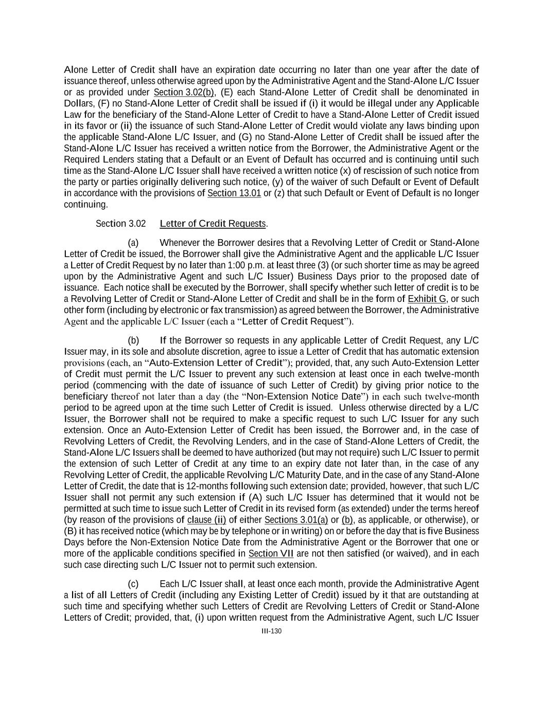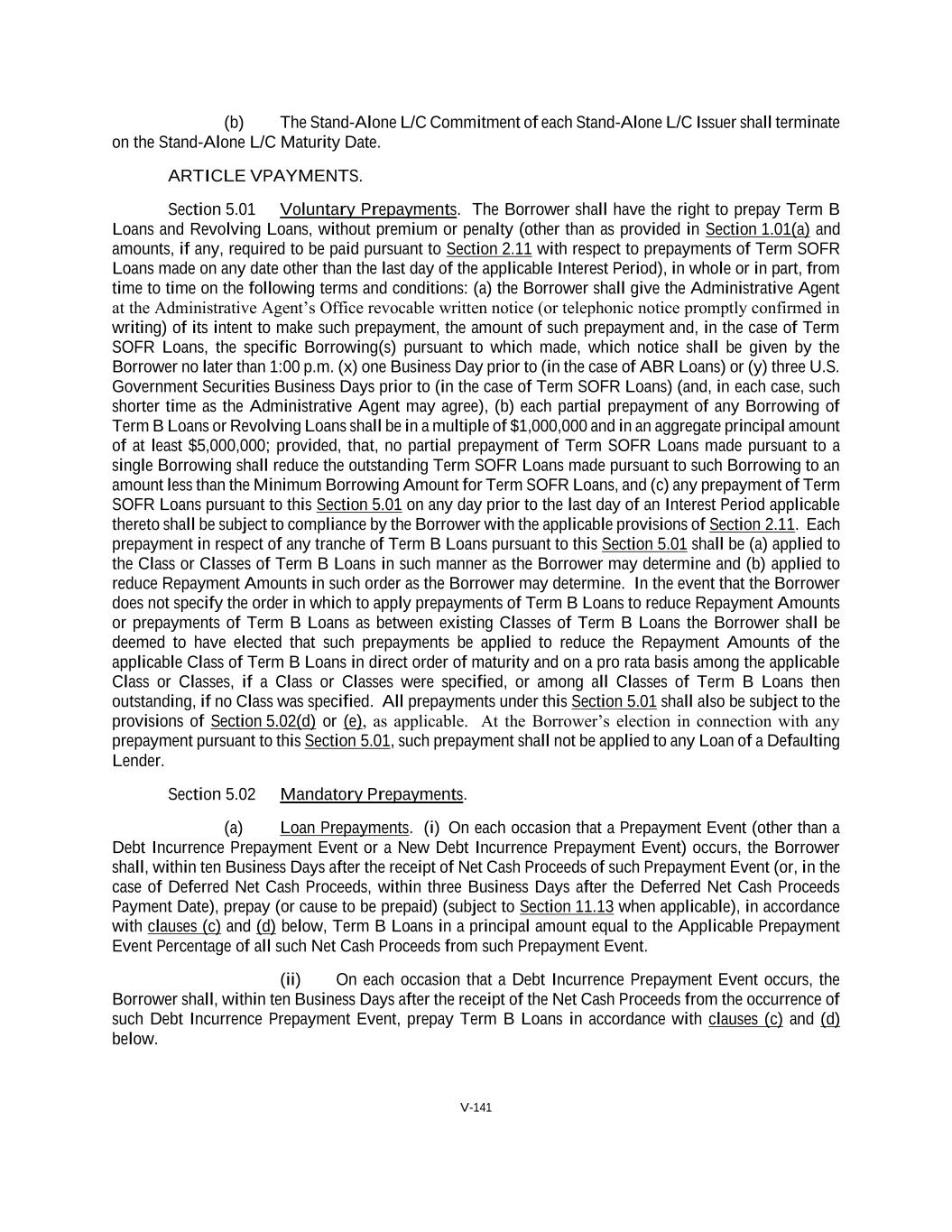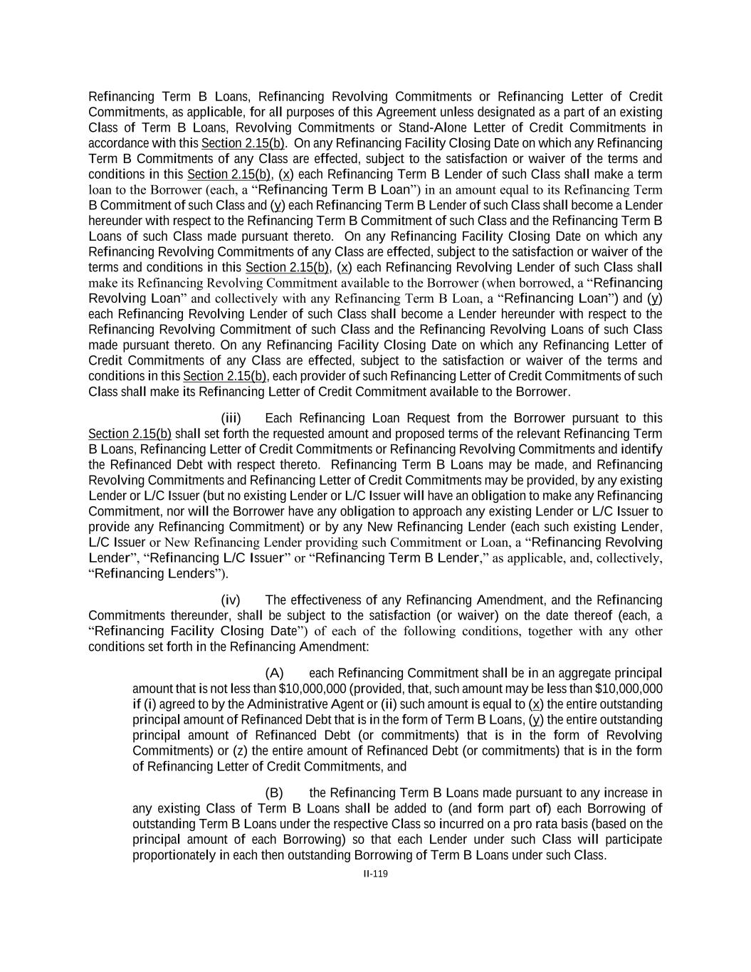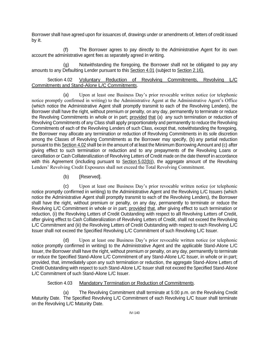 XIII-233 termination date and (2) in the case of a L/C Issuer only, repay all Obligations of the Borrower owing to such L/C Issuer relating to the Loans and participations held by the L/C Issuer as of such termination date and cancel or Cash Collateralize any Letters of Credit issued by it, in each case, that (a) requests reimbursement for amounts owing pursuant to Section 2.10, 3.05 or 5.04, (b) is affected in the manner described in Section 2.10(a)(iii) and as a result thereof any of the actions described in such Section is required to be taken, (c) becomes a Defaulting Lender or (d) refuses to make an Extension Election pursuant to Section 2.15; provided that, solely in the case of the foregoing clause (x), (i) no Specified Default shall have occurred and be continuing at the time of such replacement, (ii) the Borrower shall repay (or the replacement bank or institution shall purchase, at par) all Loans and other amounts (other than any disputed amounts), pursuant to Section 2.10, 2.11, 3.05 or 5.04, as the case may be) owing to such replaced Lender prior to the date of replacement, (iii) the replacement bank or institution, if not already a Lender, and the terms and conditions of such replacement, shall be reasonably satisfactory to the Administrative Agent (solely to the extent such consent would be required under Section 13.06), (iv) the replaced Lender shall be obligated to make such replacement in accordance with the provisions of Section 13.06 (provided that the Borrower shall be obligated to pay the registration and processing fee referred to therein unless otherwise agreed) and (v) any such replacement shall not be deemed to be a waiver of any rights that the Borrower, the Administrative Agent or any other Lender shall have against the replaced Lender , and (vi) in the case of any such assignment resulting from a claim for compensation under Section Section 2.10 or payments required to be made pursuant to Section Section 5.04, such assignment will result in a reduction in such compensation or payments thereafter. (b) If any Lender or Stand-Alone L/C Issuer (such Lender or Stand-Alone L/C Issuer being referred to as a “Non-Consenting Lender”) has failed to consent to a proposed amendment, modification, supplement, waiver, discharge or termination that pursuant to the terms of Section 13.01 requires the consent of either (i) all of the Lenders or Stand-Alone L/C Issuers of the applicable Class or Classes directly and adversely affected or (ii) all of the Lenders or Stand-Alone L/C Issuers of the applicable Class or Classes, and, in each case, with respect to which the Required Lenders (or Required Revolving Lenders, Required Term B Lenders, Required Stand-Alone L/C Issuers, Stand-Alone L/C Issuers or Lenders holding the majority of outstanding loans or commitments in respect of the applicable Class or Classes, as applicable) or a majority (in principal amount) of the directly and adversely affected Lenders or Stand-Alone L/C Issuers shall, in each such case, have granted their consent, then provided no Event of Default then exists, the Borrower shall have the right (unless such Non-Consenting Lender grants such consent) to (x) replace such Non-Consenting Lender by requiring such Non-Consenting Lender to assign its Loans and its Commitments hereunder (in respect of any applicable Class only, at the election of the Borrower) to one or more assignees reasonably acceptable to the Administrative Agent (to the extent such consent would be required under Section 13.06) or (y) terminate the Commitment of such Lender or L/C Issuer, as the case may be, and (1) in the case of a Lender (other than the L/C Issuer), repay all Obligations of the Borrower due and owing to such Lender relating to the Loans and participations held by such Lender as of such termination date and (2) in the case of the L/C Issuer only, repay all Obligations of the Borrower owing to such L/C Issuer relating to the Loans and participations held by the L/C Issuer as of such termination date (if applicable) and cancel or Cash Collateralize any Letters of Credit issued by it; provided, that: (a) all Obligations of the Borrower owing to such Non-Consenting Lender being replaced that are then due and payable shall be paid in full to such Non-Consenting Lender (other than, in the case of clause (x) above, principal amount of any Loans or any accrued and unpaid interest thereon) concurrently with such assignment, and (b) in the case of clause (x) above, the replacement Lender shall purchase the foregoing by paying to such Non-Consenting Lender a price equal to the principal amount thereof plus accrued and unpaid interest thereon. In connection with any such assignment, the Borrower, Administrative Agent, such Non-Consenting Lender and the replacement Lender or Stand-Alone L/C Issuer shall otherwise comply with Section 13.06; provided, however, that if such Non-Consenting Lender does not execute and deliver to the Administrative Agent a duly completed Assignment and Acceptance reflecting such