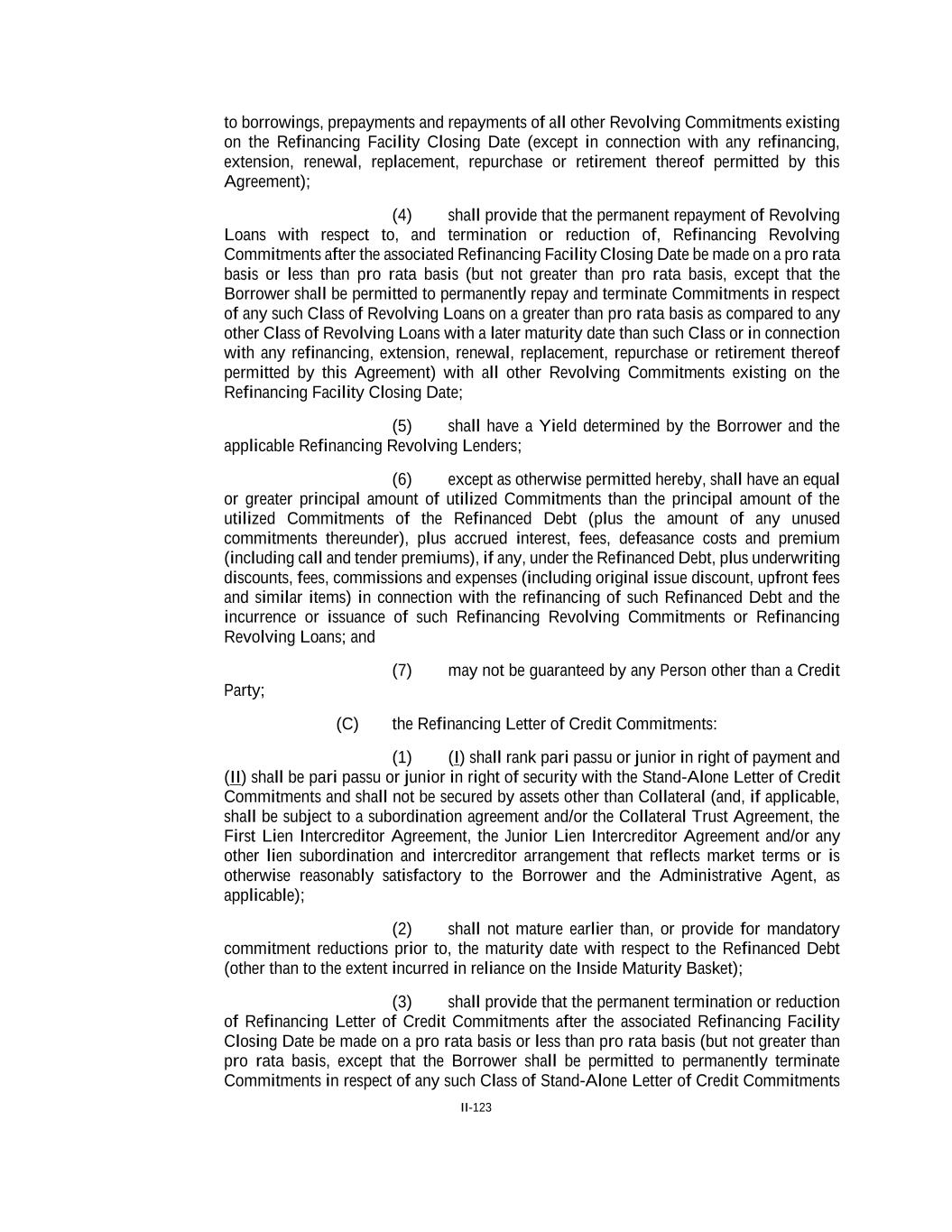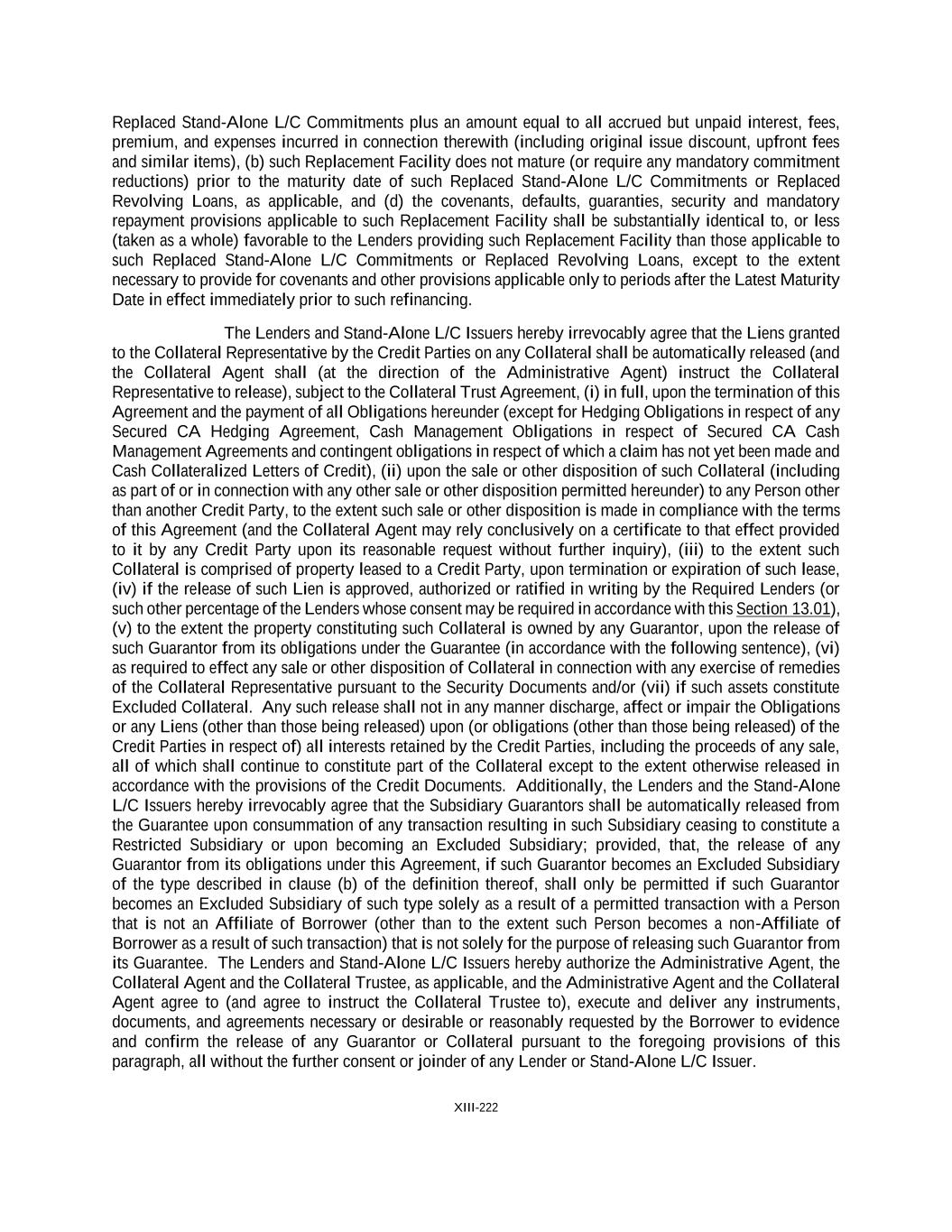XIII-222 Replaced Stand-Alone L/C Commitments plus an amount equal to all accrued but unpaid interest, fees, premium, and expenses incurred in connection therewith (including original issue discount, upfront fees and similar items), (b) such Replacement Facility does not mature (or require any mandatory commitment reductions) prior to the maturity date of such Replaced Stand-Alone L/C Commitments or Replaced Revolving Loans, as applicable, and (d) the covenants, defaults, guaranties, security and mandatory repayment provisions applicable to such Replacement Facility shall be substantially identical to, or less (taken as a whole) favorable to the Lenders providing such Replacement Facility than those applicable to such Replaced Stand-Alone L/C Commitments or Replaced Revolving Loans, except to the extent necessary to provide for covenants and other provisions applicable only to periods after the Latest Maturity Date in effect immediately prior to such refinancing. The Lenders and Stand-Alone L/C Issuers hereby irrevocably agree that the Liens granted to the Collateral Representative by the Credit Parties on any Collateral shall be automatically released (and the Collateral Agent shall (at the direction of the Administrative Agent) instruct the Collateral Representative to release), subject to the Collateral Trust Agreement, (i) in full, upon the termination of this Agreement and the payment of all Obligations hereunder (except for Hedging Obligations in respect of any Secured CA Hedging Agreement, Cash Management Obligations in respect of Secured CA Cash Management Agreements and contingent obligations in respect of which a claim has not yet been made and Cash Collateralized Letters of Credit), (ii) upon the sale or other disposition of such Collateral (including as part of or in connection with any other sale or other disposition permitted hereunder) to any Person other than another Credit Party, to the extent such sale or other disposition is made in compliance with the terms of this Agreement (and the Collateral Agent may rely conclusively on a certificate to that effect provided to it by any Credit Party upon its reasonable request without further inquiry), (iii) to the extent such Collateral is comprised of property leased to a Credit Party, upon termination or expiration of such lease, (iv) if the release of such Lien is approved, authorized or ratified in writing by the Required Lenders (or such other percentage of the Lenders whose consent may be required in accordance with this Section 13.01), (v) to the extent the property constituting such Collateral is owned by any Guarantor, upon the release of such Guarantor from its obligations under the Guarantee (in accordance with the following sentence), (vi) as required to effect any sale or other disposition of Collateral in connection with any exercise of remedies of the Collateral Representative pursuant to the Security Documents and/or (vii) if such assets constitute Excluded Collateral. Any such release shall not in any manner discharge, affect or impair the Obligations or any Liens (other than those being released) upon (or obligations (other than those being released) of the Credit Parties in respect of) all interests retained by the Credit Parties, including the proceeds of any sale, all of which shall continue to constitute part of the Collateral except to the extent otherwise released in accordance with the provisions of the Credit Documents. Additionally, the Lenders and the Stand-Alone L/C Issuers hereby irrevocably agree that the Subsidiary Guarantors shall be automatically released from the Guarantee upon consummation of any transaction resulting in such Subsidiary ceasing to constitute a Restricted Subsidiary or upon becoming an Excluded Subsidiary; provided, that, the release of any Guarantor from its obligations under this Agreement, if such Guarantor becomes an Excluded Subsidiary of the type described in clause (b) of the definition thereof, shall only be permitted if such Guarantor becomes an Excluded Subsidiary of such type solely as a result of a permitted transaction with a Person that is not an Affiliate of Borrower (other than to the extent such Person becomes a non-Affiliate of Borrower as a result of such transaction) that is not solely for the purpose of releasing such Guarantor from its Guarantee. The Lenders and Stand-Alone L/C Issuers hereby authorize the Administrative Agent, the Collateral Agent and the Collateral Trustee, as applicable, and the Administrative Agent and the Collateral Agent agree to (and agree to instruct the Collateral Trustee to), execute and deliver any instruments, documents, and agreements necessary or desirable or reasonably requested by the Borrower to evidence and confirm the release of any Guarantor or Collateral pursuant to the foregoing provisions of this paragraph, all without the further consent or joinder of any Lender or Stand-Alone L/C Issuer.